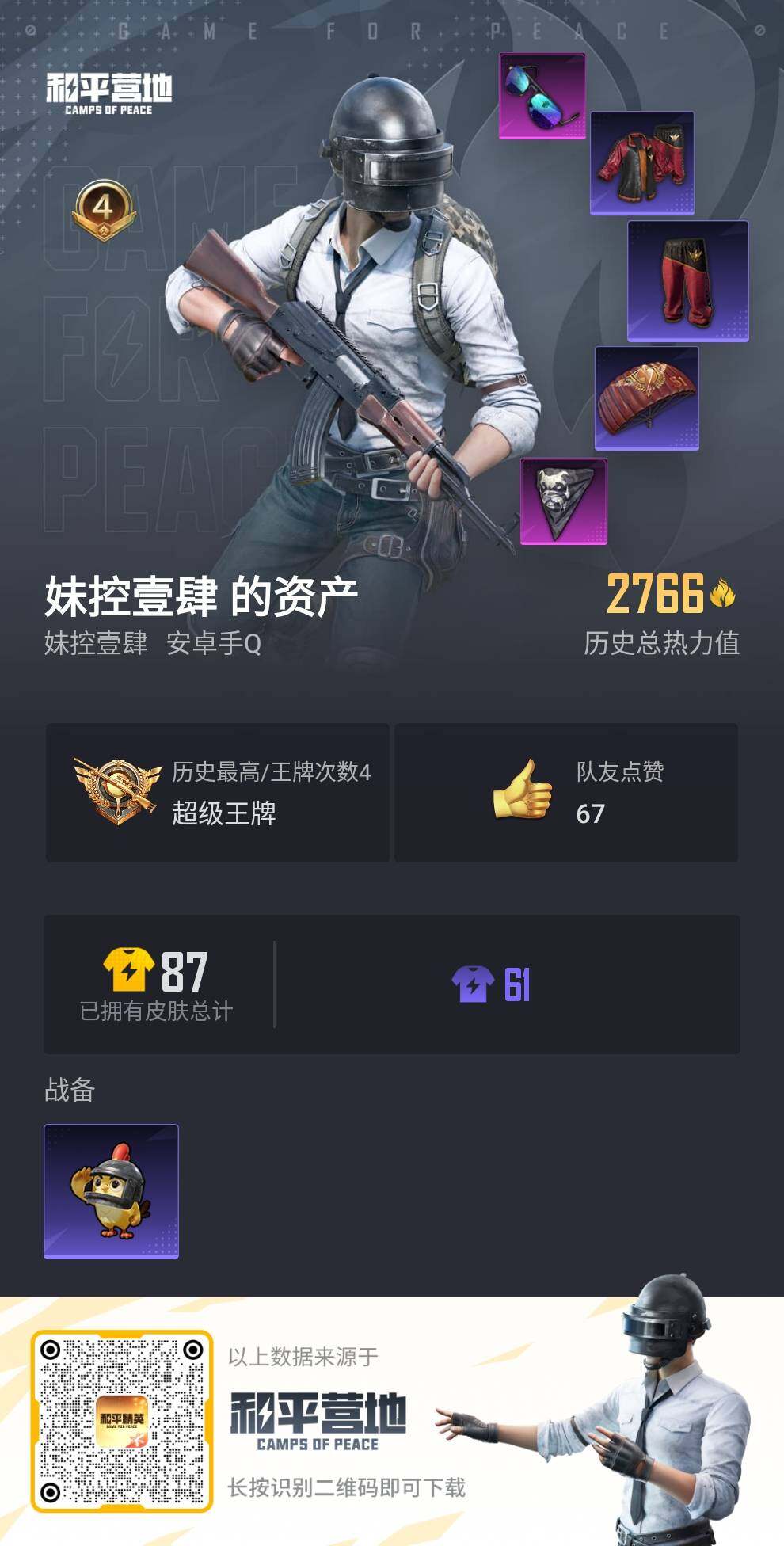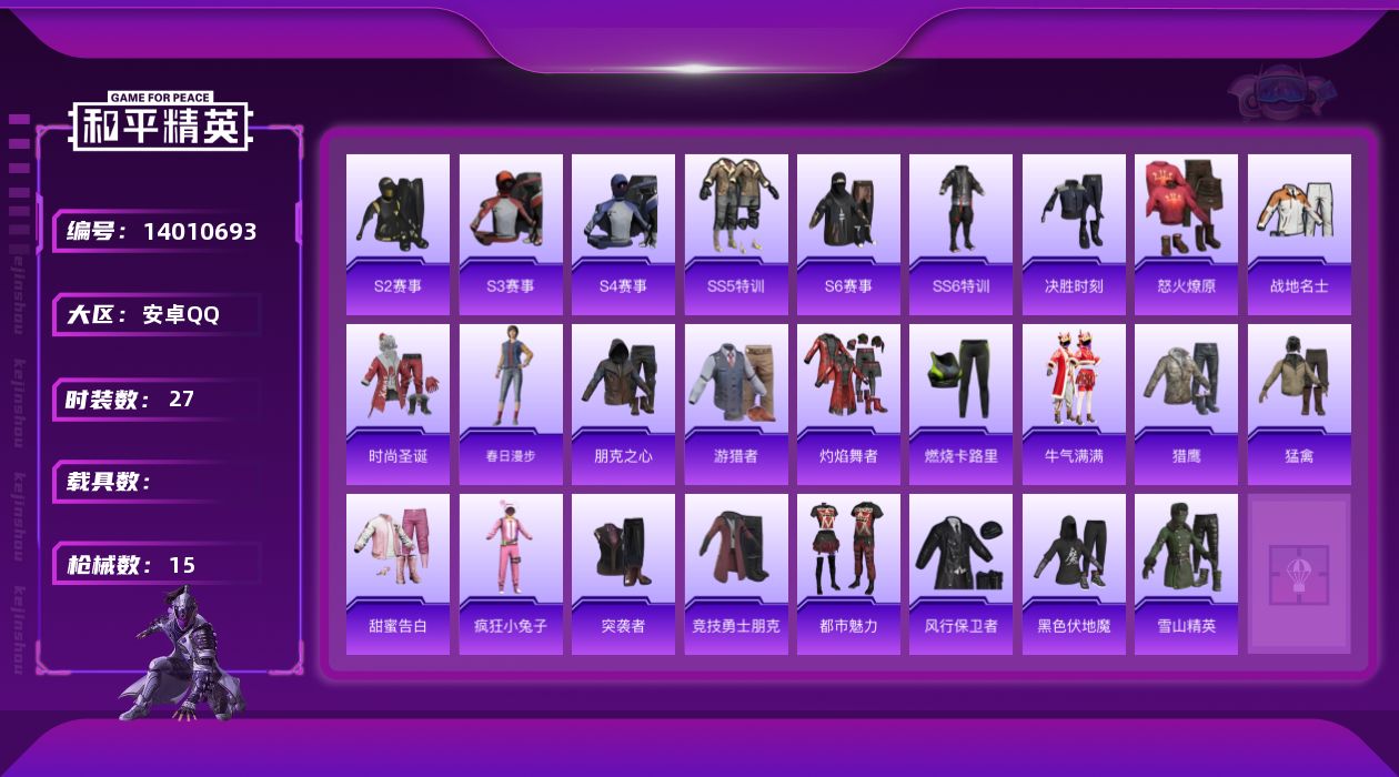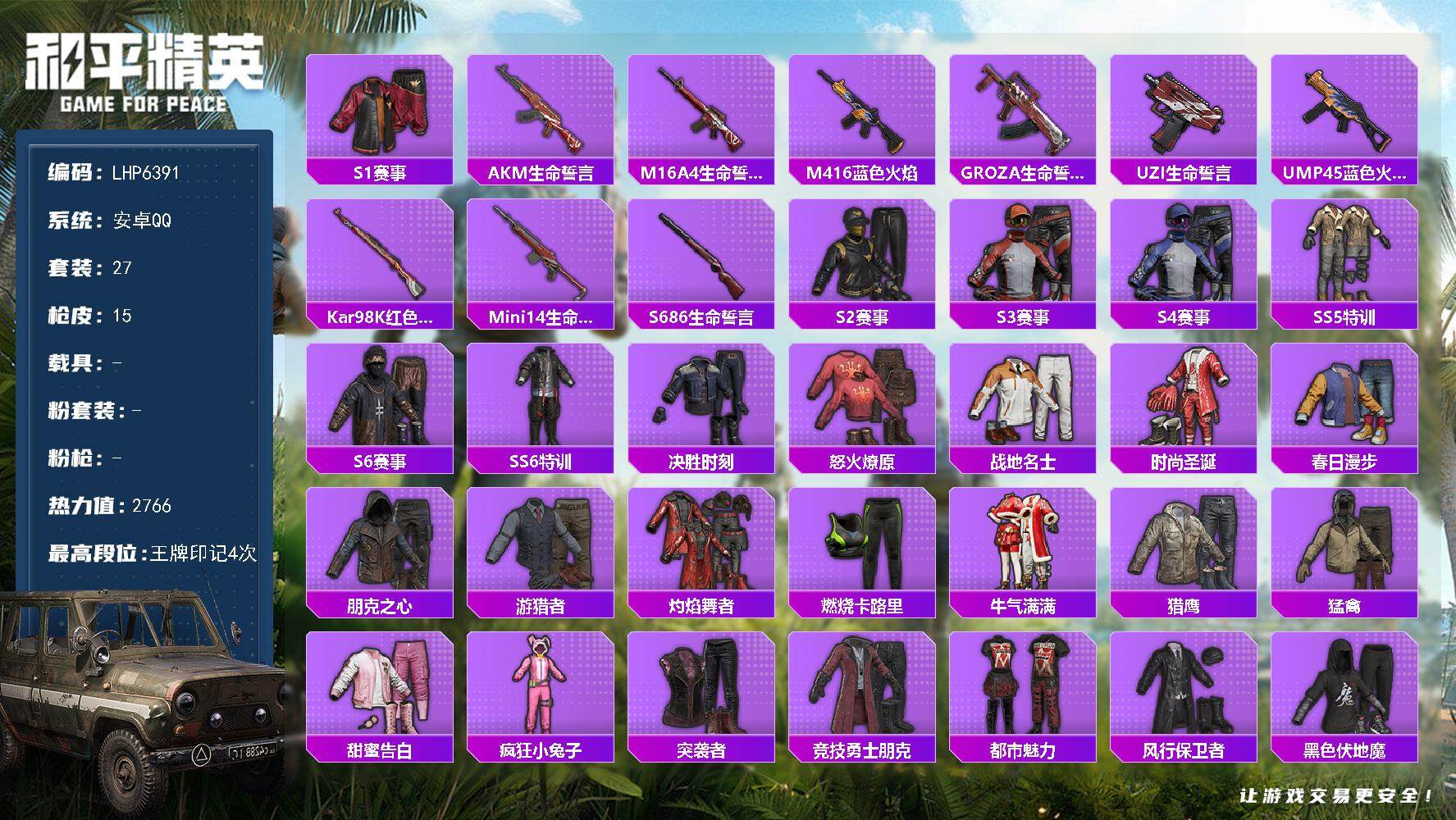 [14010693]可二次【店主推荐捡漏号!可直接换绑】 安卓 手Q-2766热力值-4王牌印记-27套装-15枪皮【热门品类】:套装-S1赛事