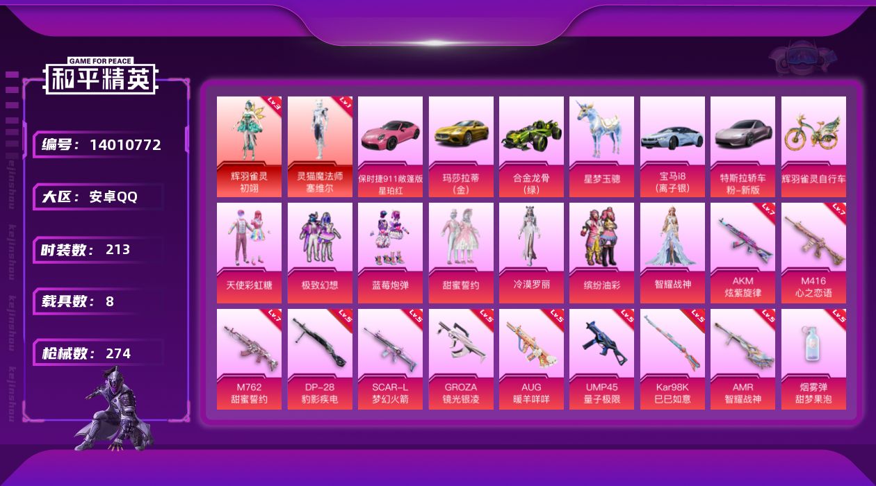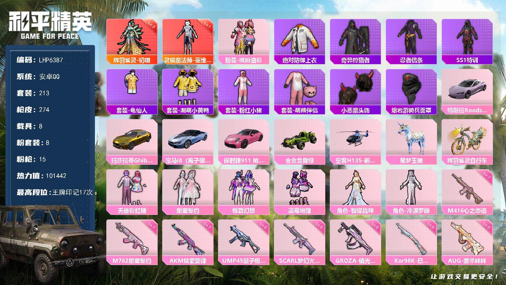 [14010772]【店主推荐捡漏号!可直接换绑】安卓 手Q-2神装-7粉装-15特效枪-8载具-6粉色飞行器-10.1w热力值-17王牌印记-213套装-274枪皮【红色神装等级】:灵猫魔法师-塞维尔(一级),辉羽雀灵-初翊(三级)【热门品类】:粉装-缤纷油彩,绝对防御上衣,套装-奇异狩猎者,套装-忍者信条,套装-SS1特训,套装-龟仙人,套装-潮萌小黄鸭,套装-粉红小猪,套装-萌熊伴侣,小恶魔头饰,熔岩游骑兵面罩【粉色载具】:特斯拉Roadster(沁心粉),玛莎拉蒂Ghibli(金),宝马i8(离子银),保时捷911 敞篷版(星珀红),合金龙骨(绿),空客H135-蔚蓝之翼,星梦玉骢,辉羽雀灵自行车【粉色套装】:粉装-天使彩虹糖,粉装-缤纷油彩,粉装-甜蜜誓约,粉装-极致幻想,粉装-蓝莓炮弹,角色-智耀战神,角色-冷漠罗丽【粉色枪皮等级】:AKM-炫紫旋律(七级),SCAR-L-梦幻火箭(五级),M416-五爪金龙(一级),M416-心之恋语(七级),GROZA-镜光银凌(五级),AUG-暖羊咩咩(五级),M762-甜蜜誓约(七级),UMP45-量子极限(五级),Kar98K-巳巳如意(五级),Mk14-甜梦熊击(五级),AMR-智耀战神(五级),DP-28-豹影疾电(五级),MG3-辉羽雀灵(三级),MG-36-幻彩电音(二级),烟雾弹-甜梦果泡(五级)【粉色飞行器】:梦幻火箭飞行器,圣域金龙飞行器,雀灵庇佑飞行器,灵猫魔法师飞行器