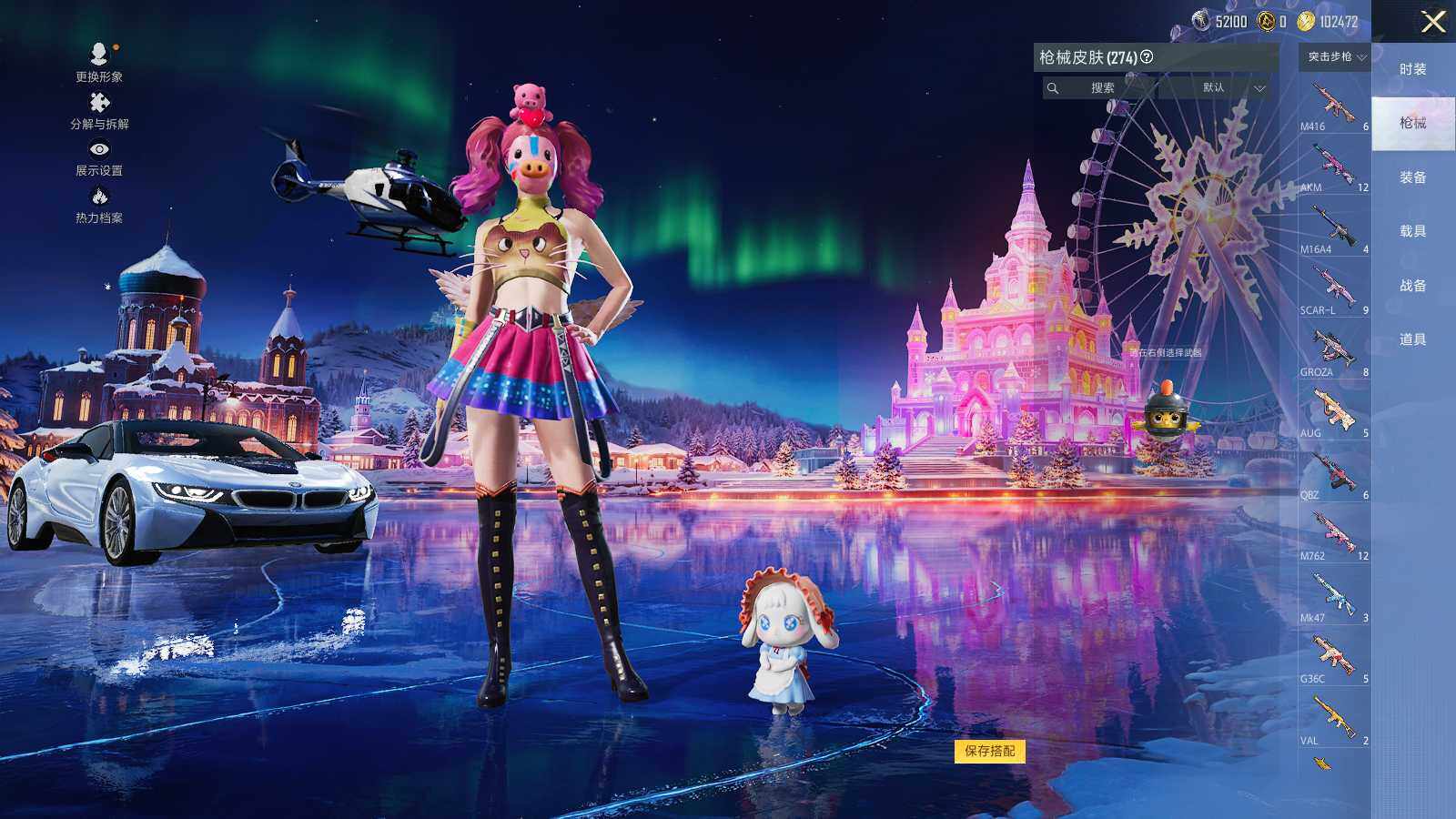 AKM-炫紫旋律,SCAR-L-梦幻火箭,M416-五爪金龙,M416-心之恋语,GROZA-镜光银凌,AUG-暖羊咩咩,M762-甜蜜誓约,UMP45-量子极限,Kar98K-巳巳如意