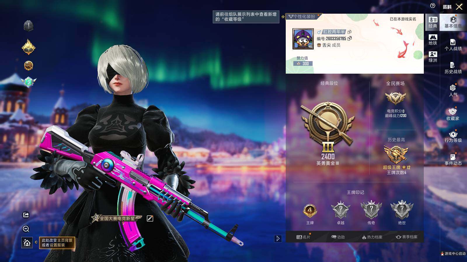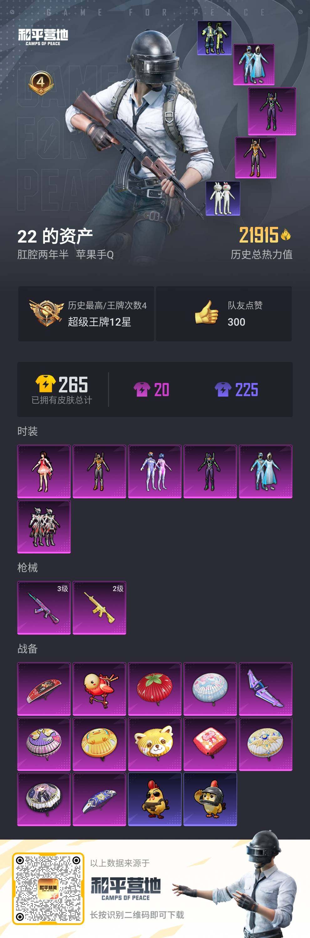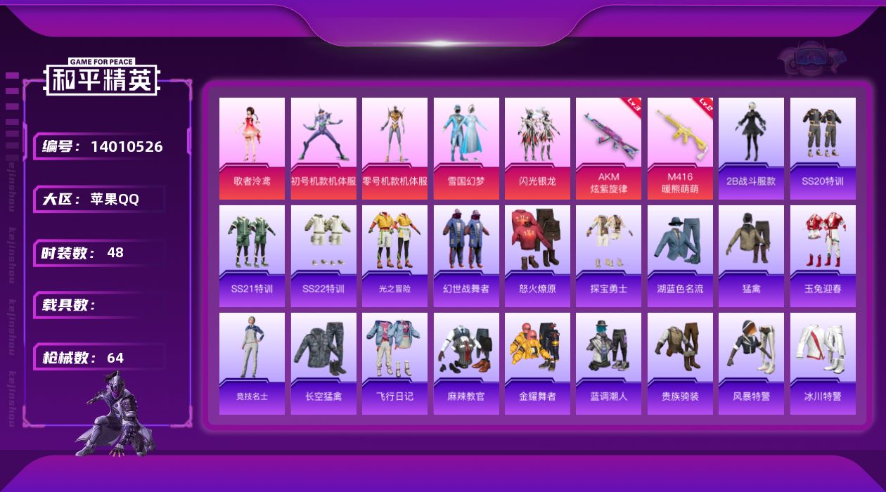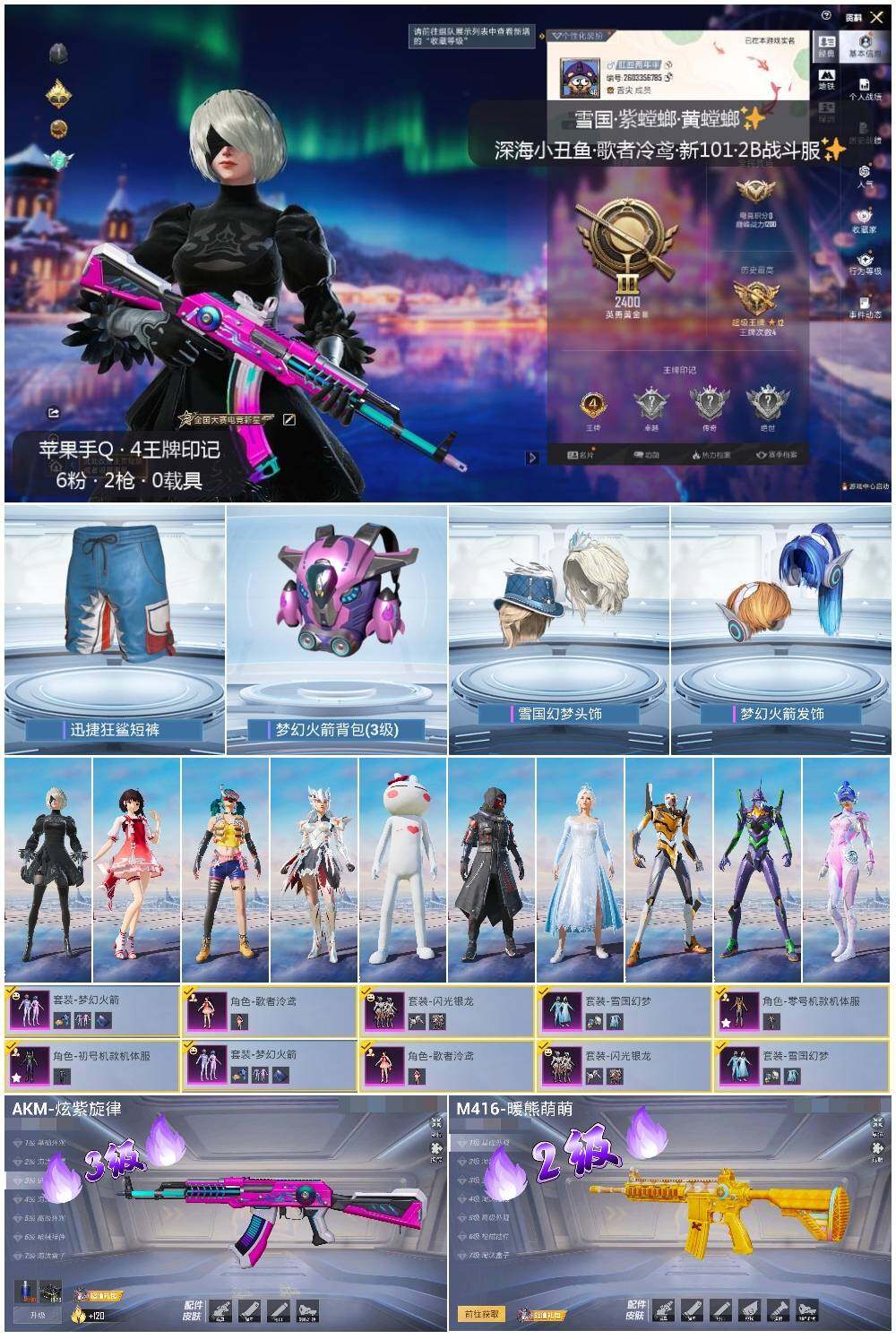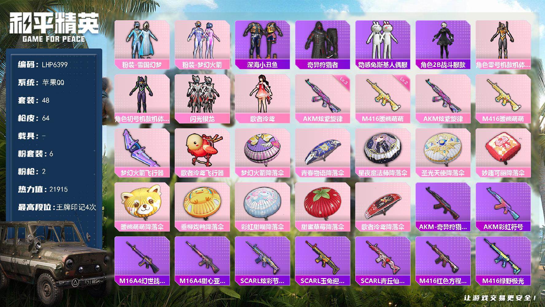 [14010526]可二次【店主推荐捡漏号!可直接换绑】 苹果 手Q-6粉装-2特效枪-2粉色飞行器-2.1w热力值-4王牌印记-48套装-64枪皮【热门品类】:粉装-雪国幻梦,粉装-梦幻火箭,套装-深海小丑鱼,套装-奇异狩猎者,套装-动感兔斯基人偶服,角色-2B战斗服款【粉色套装】:粉装-雪国幻梦,粉装-梦幻火箭,角色-零号机款机体服,角色-初号机款机体服,粉装-闪光银龙,角色-歌者泠鸢【粉色枪皮等级】:AKM-炫紫旋律(三级),M416-暖熊萌萌(二级)【粉色飞行器】:梦幻火箭飞行器,歌者泠鸢飞行器