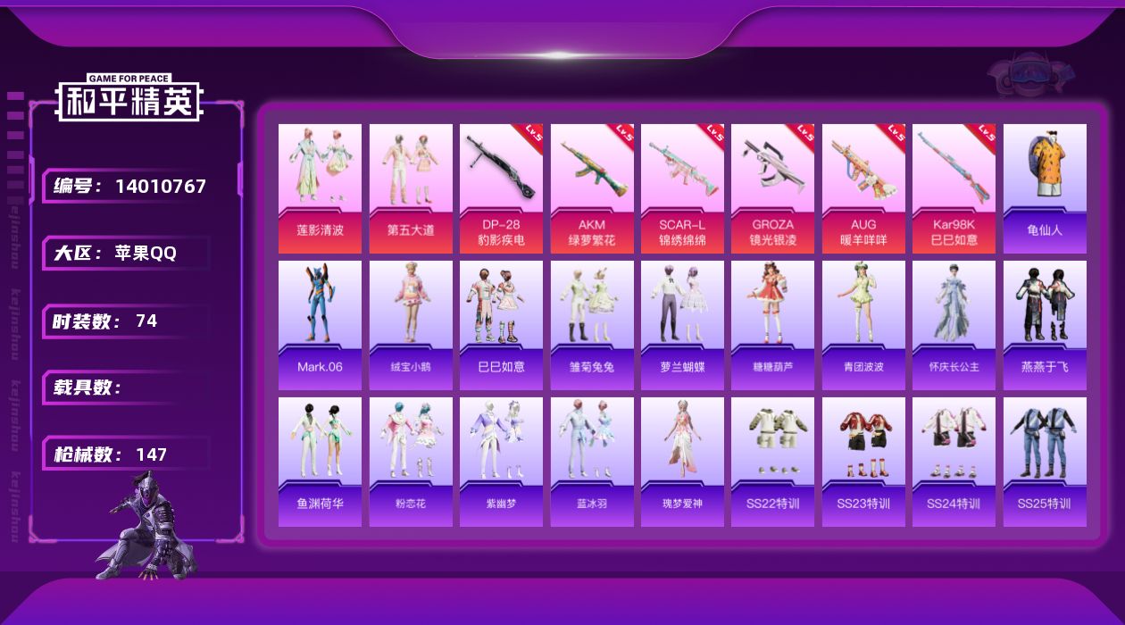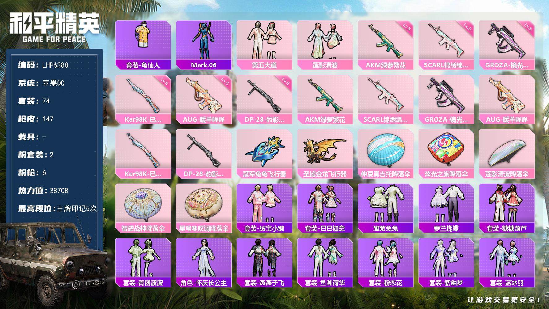 [14010767]【店主推荐捡漏号!可直接换绑】/地铁满天赋 苹果 手Q-2粉装-6特效枪-2粉色飞行器-3.8w热力值-5王牌印记-74套装-147枪皮【热门品类】:套装-龟仙人,角色-Mark.06【粉色套装】:粉装-第五大道,粉装-莲影清波【粉色枪皮等级】:AKM-绿萝繁花(五级),SCAR-L-锦绣绵绵(五级),GROZA-镜光银凌(五级),AUG-暖羊咩咩(五级),Kar98K-巳巳如意(五级),DP-28-豹影疾电(五级)【粉色飞行器】:冠军兔兔飞行器,圣域金龙飞行器