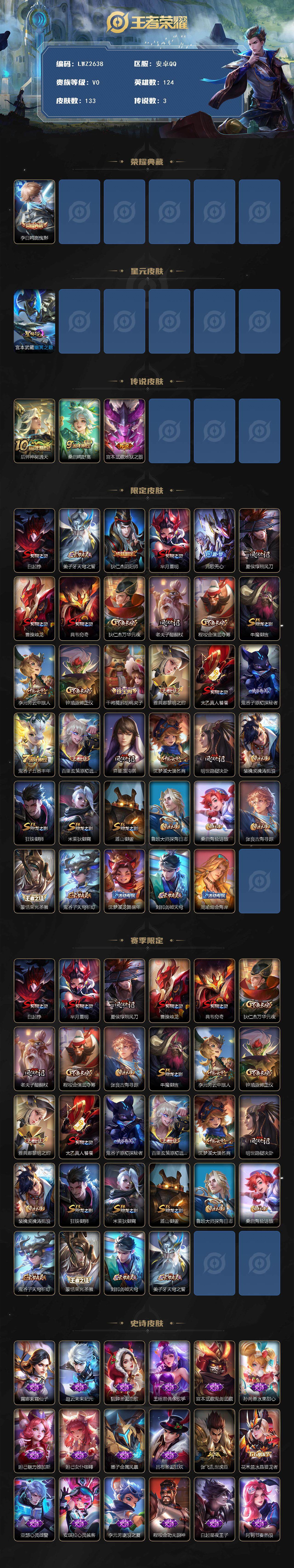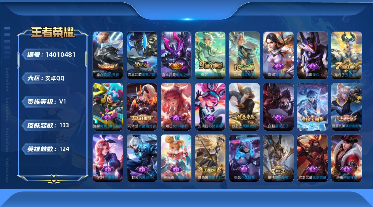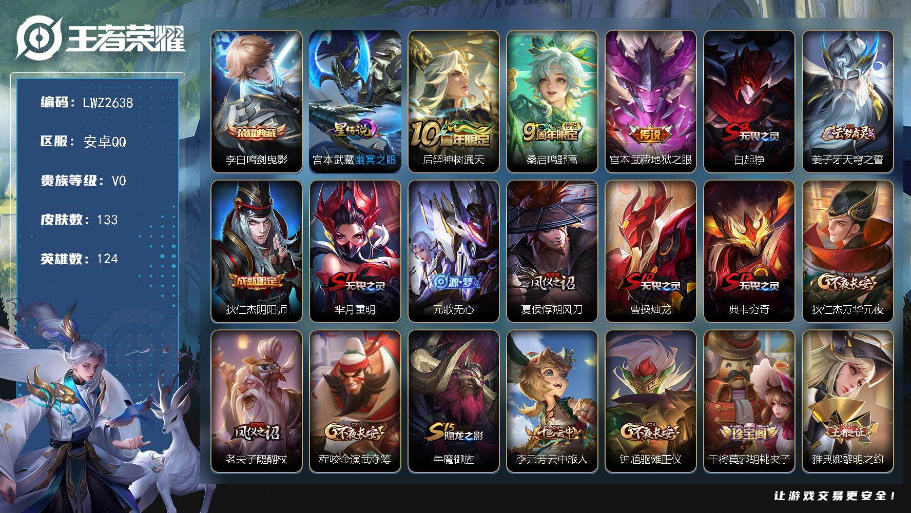 [14010481]【店主推荐捡漏号!可直接换绑】安卓Q-V3-最强王者段位-124英雄-133皮肤-1典藏-1星元-3传说-27史诗 【荣耀典藏】:李白鸣剑曳影 【传说皮肤】:后羿神树通天,桑启鸣野蒿,宫本武藏地狱之眼 【限定皮肤】:白起狰,姜子牙天穹之誓,狄仁杰阴阳师,芈月重明,元歌无心,夏侯惇朔风刀,曹操烛龙,典韦穷奇,狄仁杰万华元夜,老夫子醍醐杖,程咬金演武夺筹,牛魔御旌,李元芳云中旅人,钟馗驱傩正仪,干将莫邪胡桃夹子,雅典娜黎明之约,太乙真人饕餮,鬼谷子原初探秘者,鬼谷子五谷丰年,百里玄策原初追逐者,弈星混沌棋,沈梦溪大漠名商,明世隐疑决卦,裴擒虎擒涛扼浪,狂铁御狮,米莱狄御霄,盾山御銮,鲁班大师探海日志,桑启海盐诗旅,张良古海寻踪,蒙恬荣光圣徽,鬼谷子天穹祈灯,沈梦溪龙舞盛年,刘邦剑破天穹,周瑜熔金海岸 【赛季限定】:白起狰,芈月重明,夏侯惇朔风刀,曹操烛龙,典韦穷奇,狄仁杰万华元夜,老夫子醍醐杖,程咬金演武夺筹,张良古海寻踪,牛魔御旌,李元芳云中旅人,钟馗驱傩正仪,雅典娜黎明之约,太乙真人饕餮,鬼谷子原初探秘者,百里玄策原初追逐者,弈星混沌棋,沈梦溪大漠名商,明世隐疑决卦,裴擒虎擒涛扼浪,狂铁御狮,米莱狄御霄,盾山御銮,鲁班大师探海日志,桑启海盐诗旅,鬼谷子天穹祈灯,蒙恬荣光圣徽,刘邦剑破天穹,姜子牙天穹之誓 【史诗皮肤】:露娜紫霞仙子,赵云未来纪元,貂蝉圣诞恋歌,王昭君偶像歌手,宫本武藏鬼剑武藏,孙尚香水果甜心,妲己魅力维加斯,妲己女仆咖啡,墨子金属风暴,吕布圣诞狂欢,张飞乱世虎臣,花木兰水晶猎龙者,亚瑟心灵战警,安琪拉心灵骇客,李元芳逐浪之夏,程咬金功夫厨神,白起星夜王子,阿轲节奏热浪,狄仁杰鹰眼统帅,百里玄策原初追逐者,雅典娜黎明之约,鬼谷子五谷丰年,元歌无心,刘禅电玩爆裂旋风,蒙恬荣光圣徽,弈星万物之道,女娲万灵启世 【其他皮肤】:韩信教廷特使,韩信街头霸王,露娜哥特玫瑰,达摩大发明家,赵云白执事,程咬金爱与正义,扁鹊化身博士,扁鹊救世之瞳,孙膑天使之翼,典韦黄金武士,亚瑟死亡骑士,达摩拳王,花木兰兔女郎,张飞五福同心,甄姬花好人间,宫本武藏万象初新,狄仁杰阴阳师,刘备纽约教父,关羽龙腾万里,墨子进击墨子号,白起狰,太乙真人饕餮,宫本武藏霸王丸,曹操烛龙,芈月重明,老夫子功夫老勺,典韦穷奇,诸葛亮掌控之力,李白敏锐之力,狂铁御狮,苏烈坚韧之力,大乔守护之力,米莱