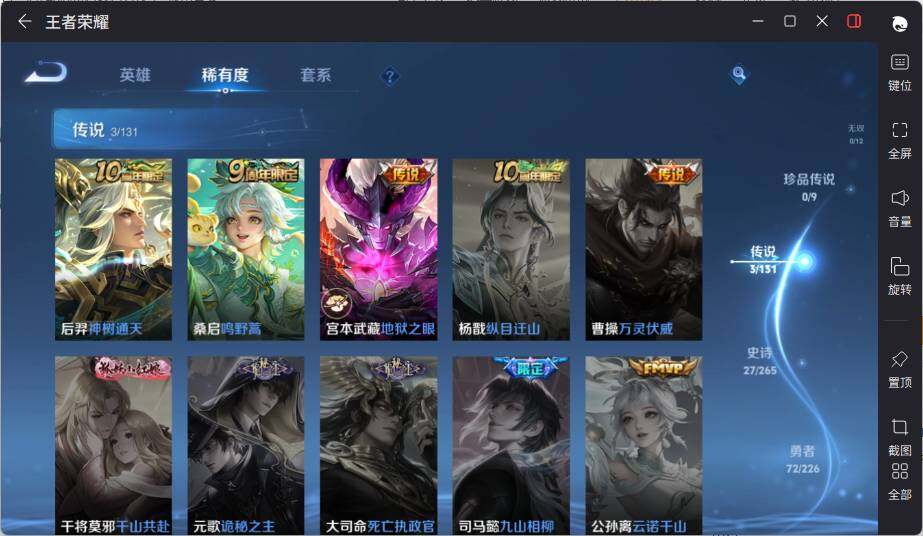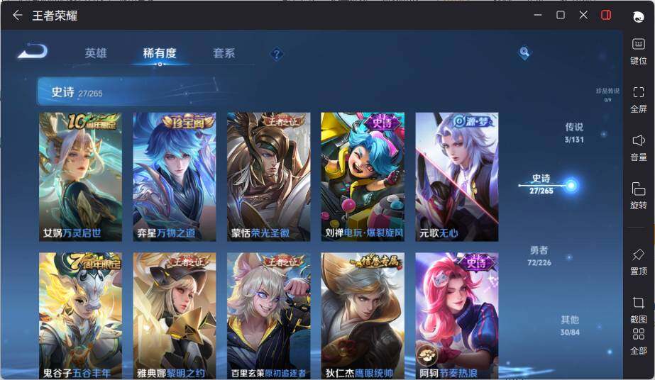 - PX_1949147-贵族2/皮肤93/典藏1/传说4/史诗24/英雄118/赤影疾锋/女武神/超时空战士男/云鹰飞将/游龙清影/桑启鸣野蒿/大乔绒语心约/姜子牙天穹之誓/狄仁杰阴阳师/赵云皇家上将/元歌无心/甄姬游园惊梦/沙漠行僧/项羽海滩派对/演武夺筹/金庭之子/云中旅人/驱傩正仪/黎明之约/千军破阵/原初追逐者/梦奇顽趣/大漠名商/擒涛扼浪/探海日志/海盐诗旅/女武神/阿古朵江河有灵/古海寻