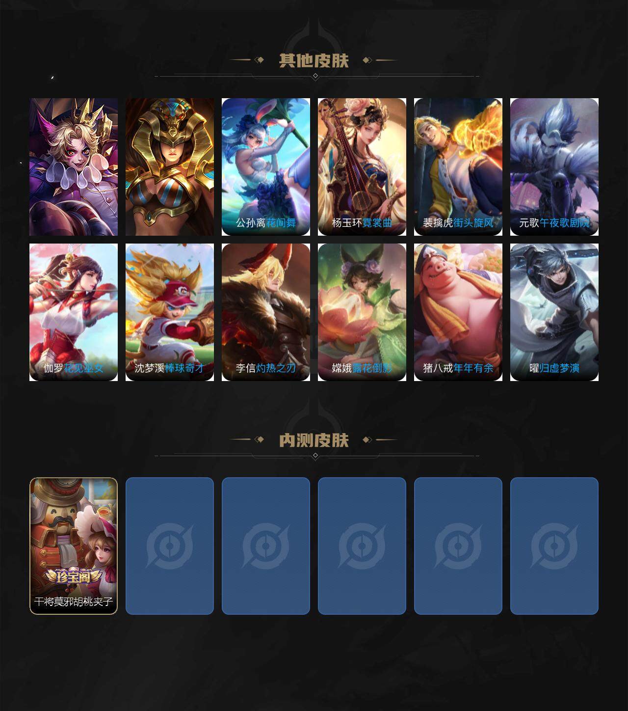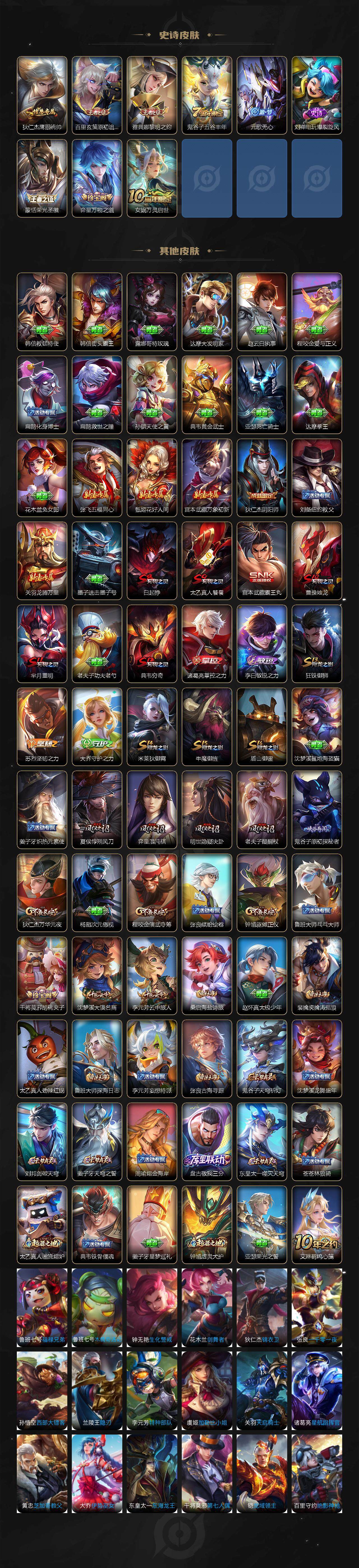 【限定皮肤】:白起狰,姜子牙天穹之誓,狄仁杰阴阳师,芈月重明,元歌无心,夏侯惇朔风刀,曹操烛龙,典韦穷奇,狄仁杰万华元夜,老夫子醍醐杖,程咬金演武夺筹,牛魔御旌,李元芳云中旅人,钟馗驱傩正仪,干将莫邪胡桃夹子,雅典娜黎明之约,太乙真人饕餮,鬼谷子原初探秘者,鬼谷子五谷丰年,百里玄策原初追逐者,弈星混沌棋,沈梦溪大漠名商,明世隐疑决卦,裴擒虎擒涛扼浪,狂铁御狮,米莱狄御霄,盾山御銮,鲁班大师探海日志,桑启海盐诗旅,张良古海寻踪,蒙恬荣光圣徽,鬼谷子天穹祈灯,沈梦溪龙舞盛年,刘邦剑破天穹,周瑜熔金海岸
