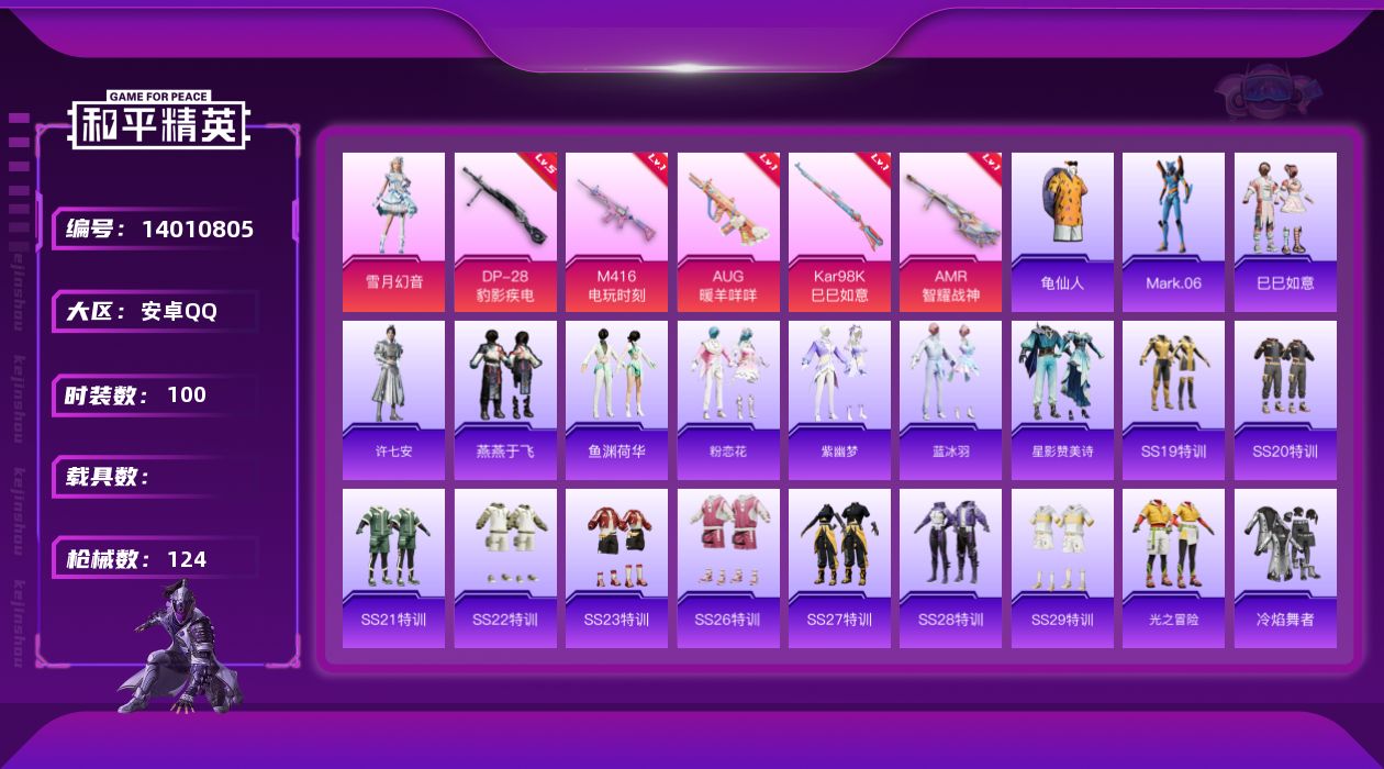 - PX_2099071-【可二次】【因赛季更新游戏段付以上号为准!】 安卓Q- 3王牌印记 历史超级王牌6星 70套装 72枪皮 【1神装】 辉羽雀灵-初翊 (1级) 【1粉装】 极致幻想 【1特效枪】 SCAR-L-纯梦嫁纱 (4级) 【9热门】 龟仙人 银碳小老虎 金羽特工 团圆交子 瑞龙福将 粉红小猪 破蛋小黄鸡 英勇保护者 M762-瑞龙福将 连体王者