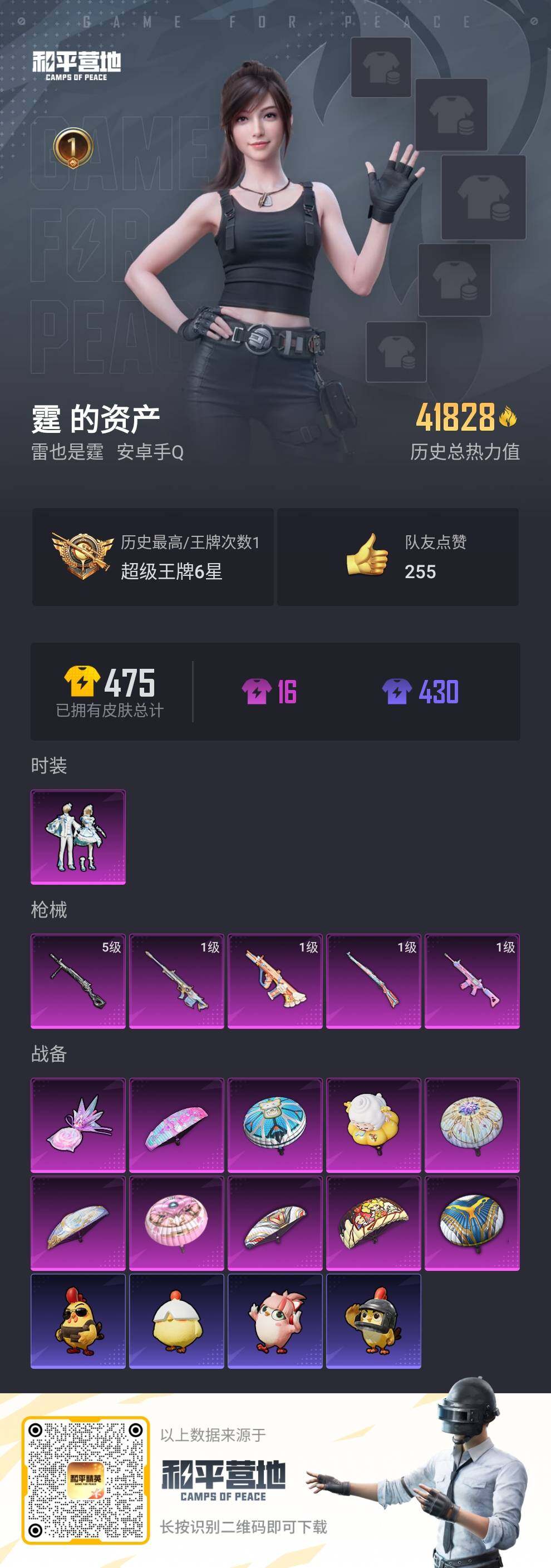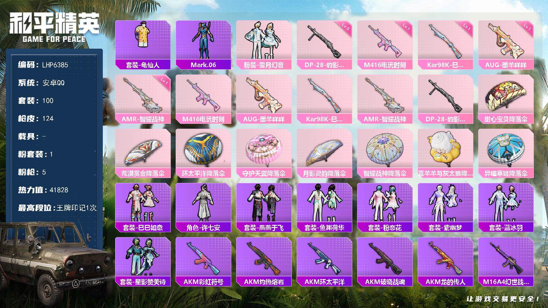 [14010805]可二次【店主推荐捡漏号!可直接换绑】/地铁满天赋 安卓 手Q-1粉装-5特效枪-1粉色飞行器-4.1w热力值-1王牌印记-100套装-124枪皮【热门品类】:套装-龟仙人,角色-Mark.06【粉色套装】:粉装-雪月幻音【粉色枪皮等级】:M416-电玩时刻(一级),AUG-暖羊咩咩(一级),Kar98K-巳巳如意(一级),AMR-智耀战神(一级),DP-28-豹影疾电(五级)