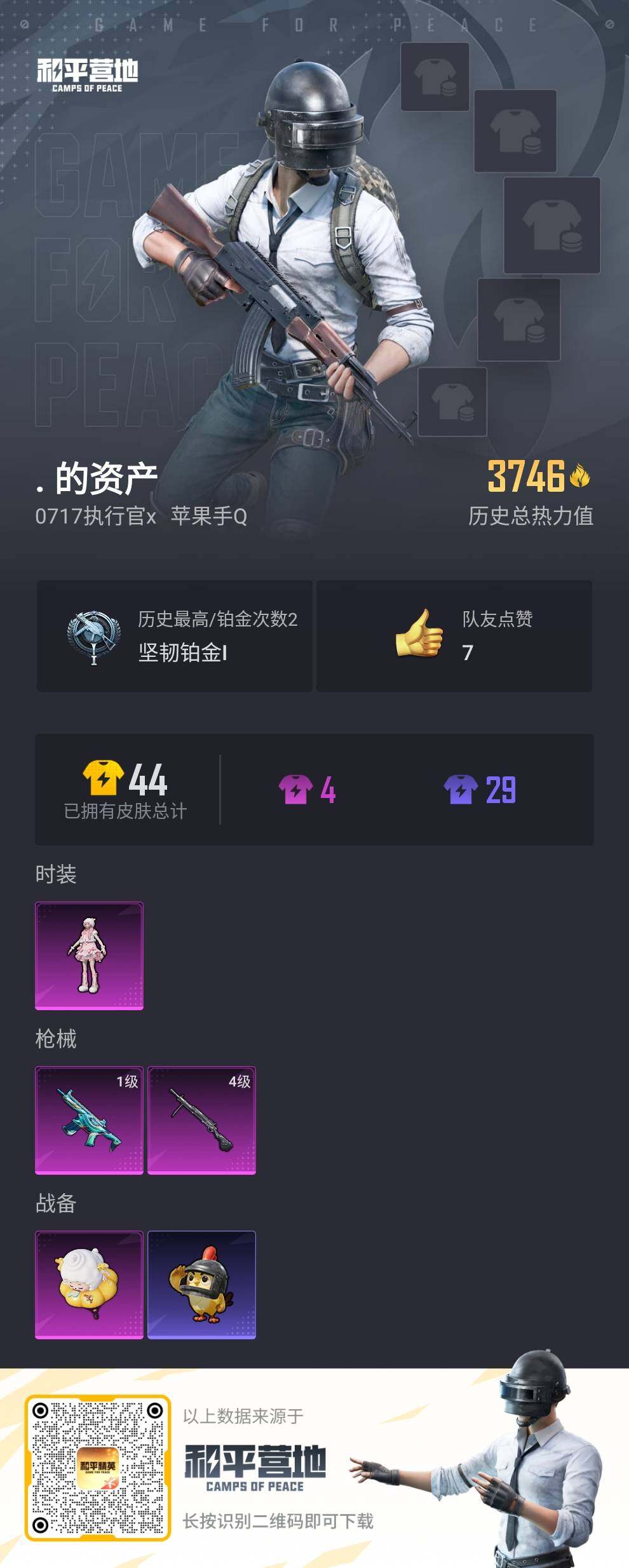 - [12945882]【暑期末清货/特价急出/永久包赔】:安卓 手Q-1粉装-4特效枪-2.9w热力值-5印记-115套装-105枪皮【热门品类】:套装-忍者信条,套装-AG战队服【特效枪等级】:AKM-绿萝繁花(五级),SCAR-L-锦绣绵绵(五级),M416-电玩时刻(五级),Kar98K-巳巳如意(五级)【优质套装】:玩偶服-猪猪侠