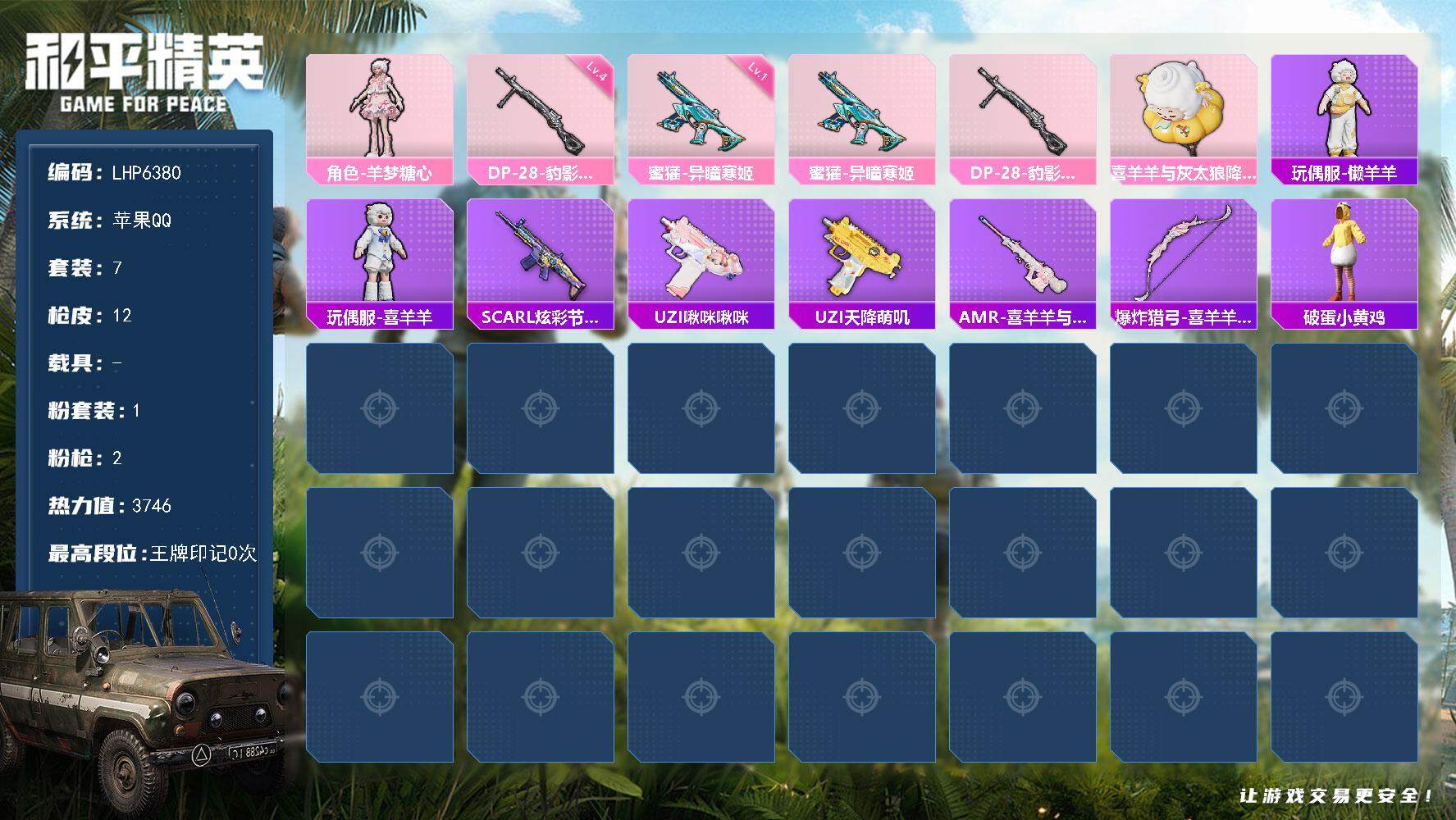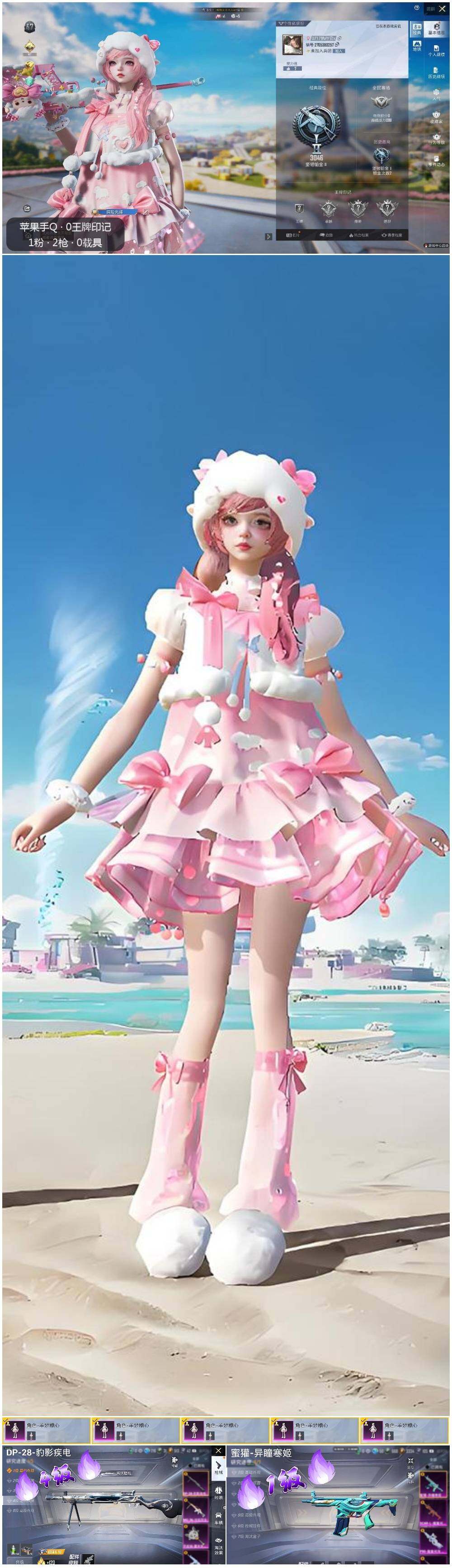 [14010890]可二次【店主推荐捡漏号!可直接换绑】 苹果 手Q-1粉装-2特效枪-3746热力值-0王牌印记-7套装-12枪皮【粉色套装】:角色-羊梦糖心【粉色枪皮等级】:蜜獾-异瞳寒姬(一级),DP-28-豹影疾电(四级)