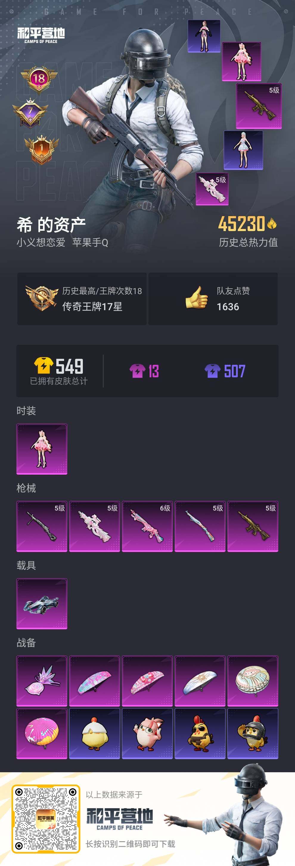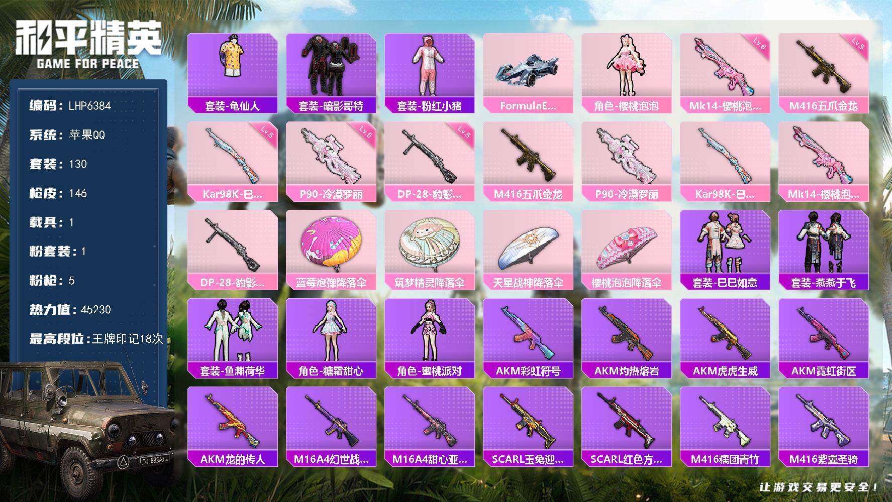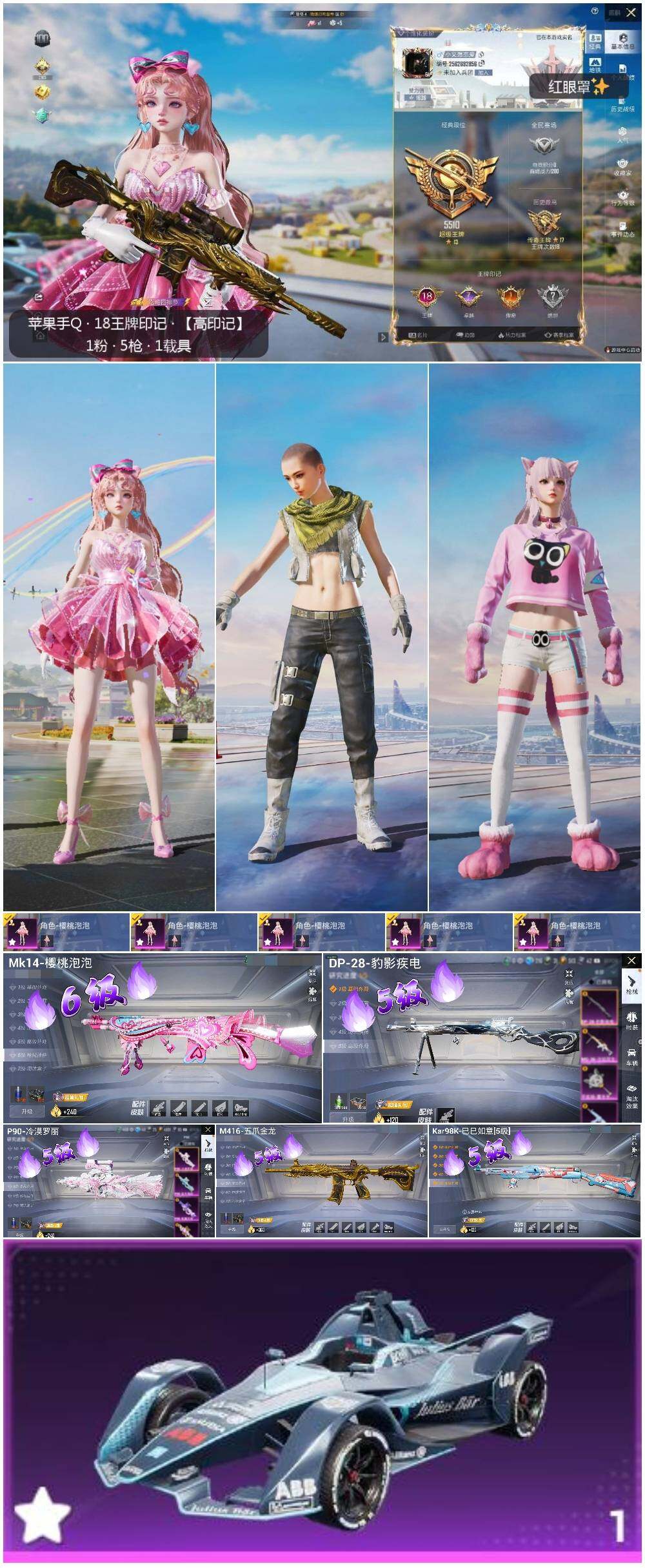 [14010847]可二次【店主推荐捡漏号!可直接换绑】 苹果 手Q-1粉装-5特效枪-1载具-1粉色飞行器-4.5w热力值-18王牌印记-130套装-146枪皮【热门品类】:套装-龟仙人,套装-暗影哥特,套装-粉红小猪【粉色载具】:Formula E Gen2(巅峰兰)【粉色套装】:角色-樱桃泡泡【粉色枪皮等级】:M416-五爪金龙(五级),P90-冷漠罗丽(五级),Kar98K-巳巳如意(五级),Mk14-樱桃泡泡(六级),DP-28-豹影疾电(五级)