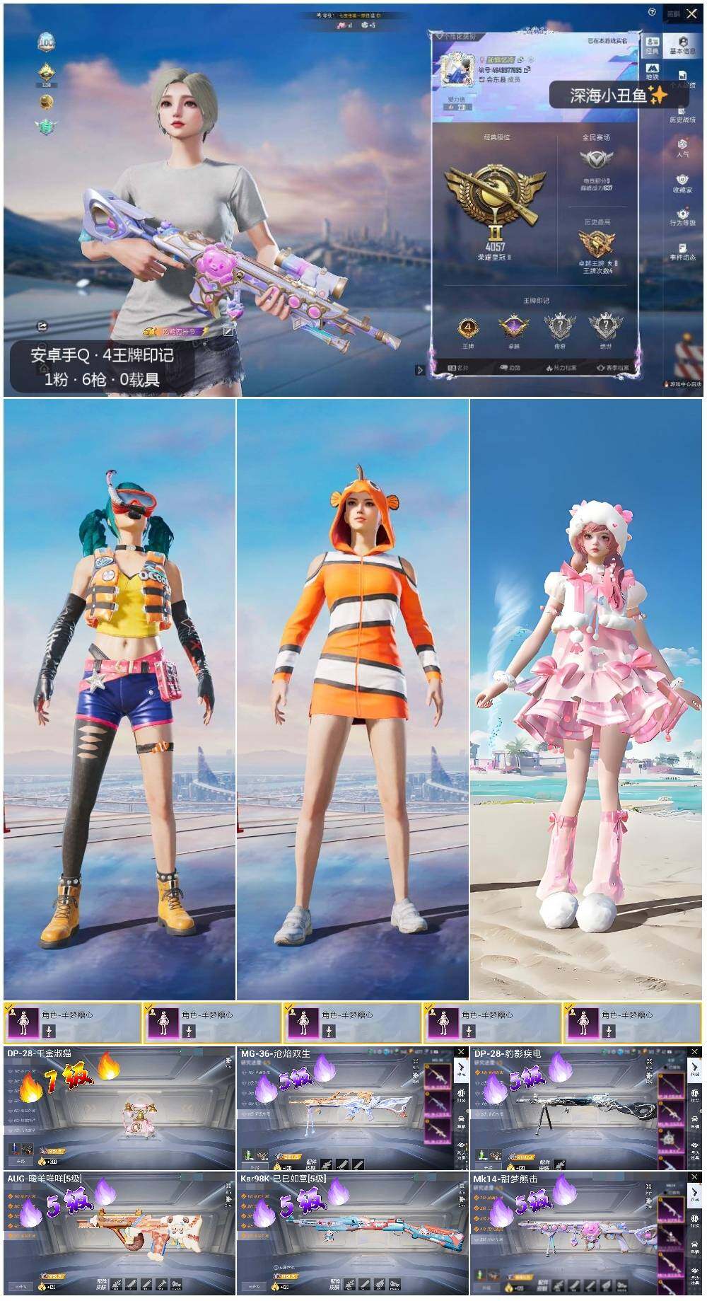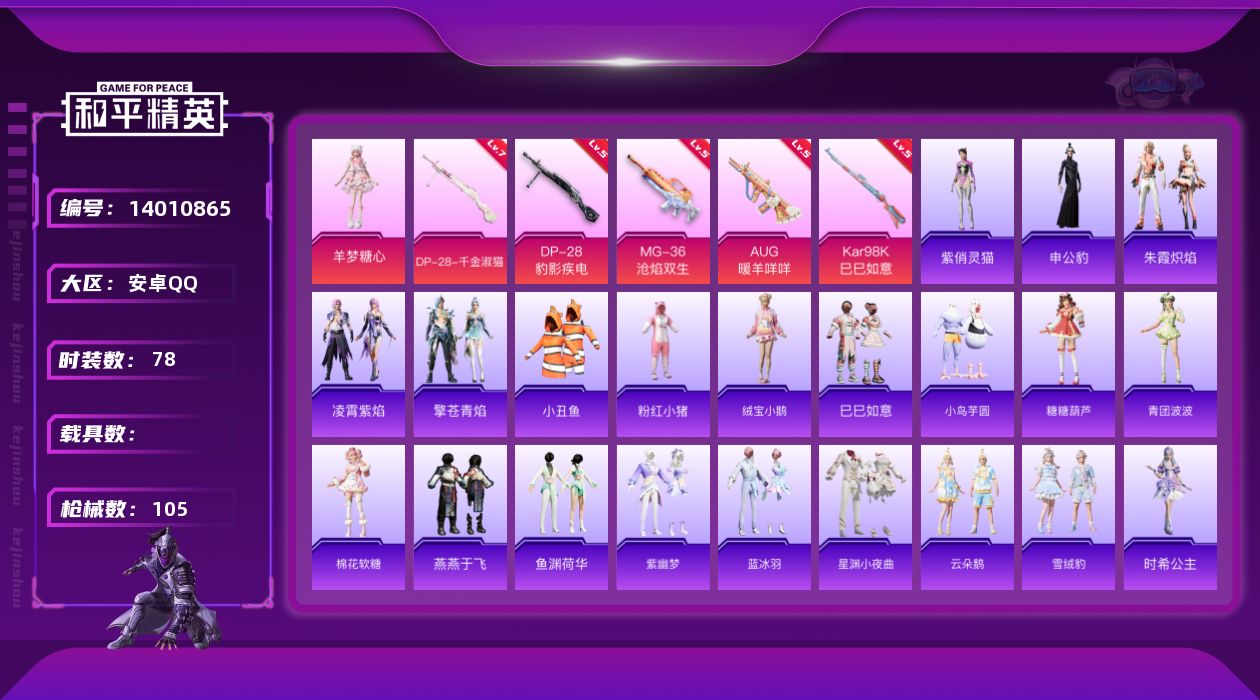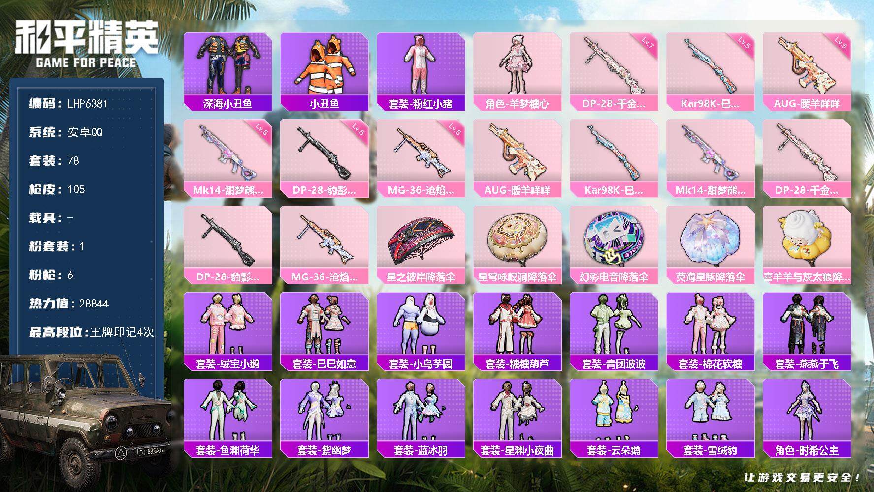 [14010865]【店主推荐捡漏号!可直接换绑】 安卓 手Q-1粉装-6特效枪-0载具-2.8w热力值-4王牌印记-78套装-105枪皮【热门品类】:套装-深海小丑鱼,套装-小丑鱼,套装-粉红小猪【粉色套装】:角色-羊梦糖心【粉色枪皮等级】:AUG-暖羊咩咩(五级),Kar98K-巳巳如意(五级),Mk14-甜梦熊击(五级),DP-28-千金淑猫(七级),DP-28-豹影疾电(五级),MG-36-沧焰双生(五级)