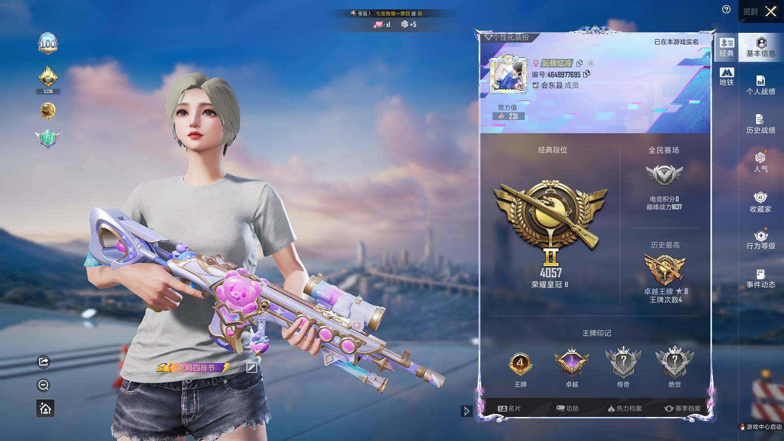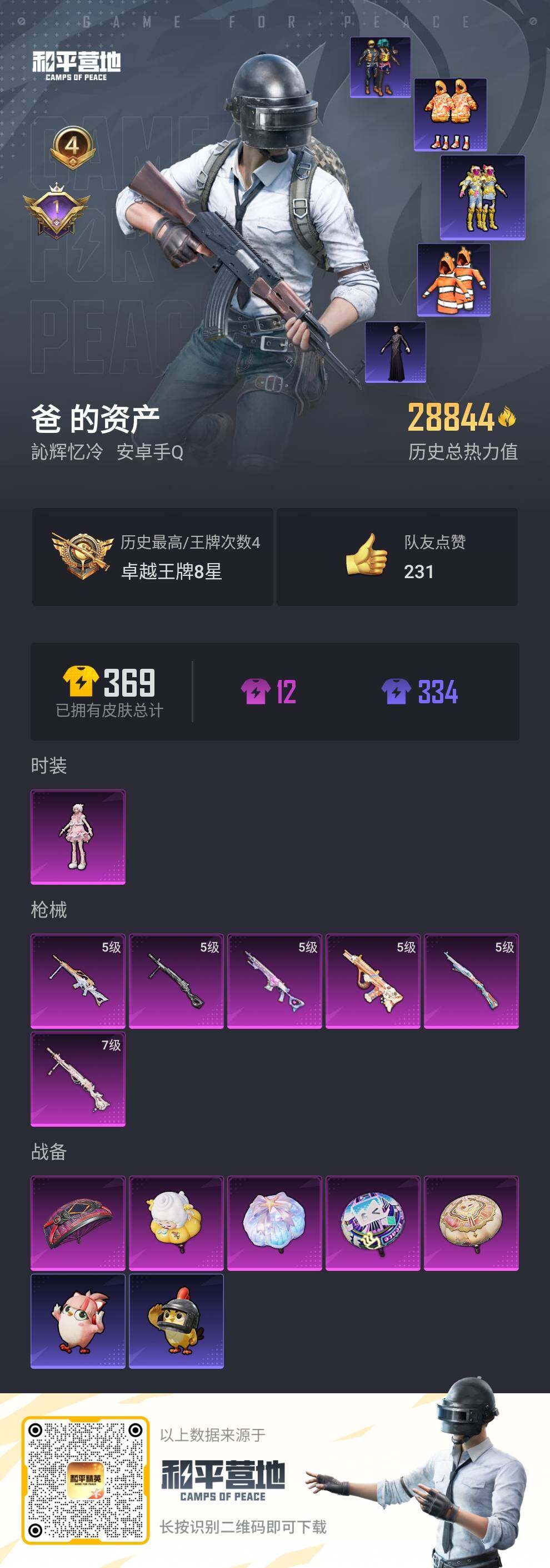- PX_2108533-2【无二次】【因赛季更新游戏段付以上号为准!】安卓Q-4w热力值 7王牌印记 历史超级王牌6星 136套装 147枪皮 【2粉装】 荧海星豚 月影灵韵 【4特效枪】 Kar98K-巳巳如意 (5级) AUG-暖羊咩咩 (5级) Mk14-甜梦熊击 (5级) GROZA-镜光银凌 (5级) 【3热门】 龟仙人 破蛋小黄鸡 极速红龙 【1头盔】 金羽特工头盔 【1背包】 深海曼妙