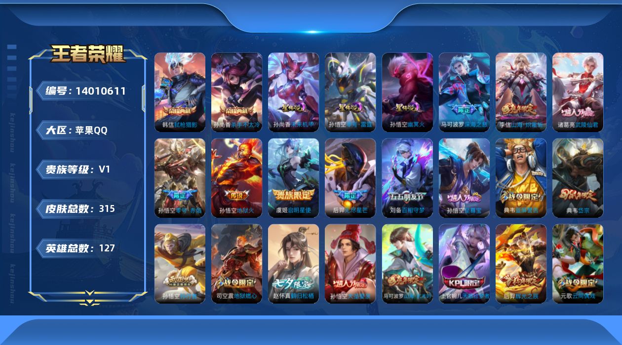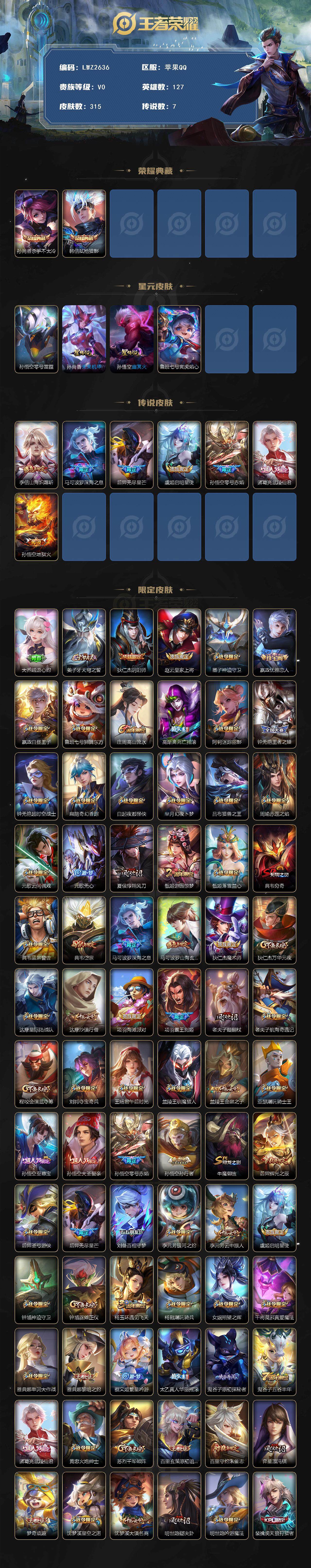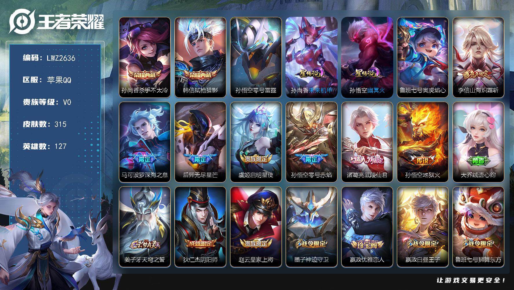 [14010611]【店主推荐捡漏号!可直接换绑】苹果Q-V8-至尊星耀II段位-127英雄-315皮肤-2典藏-4星元-7传说-89史诗 【英雄全皮】:刘邦全皮,蒙恬全皮 【荣耀典藏】:孙尚香杀手不太冷,韩信弑枪猎影 【传说皮肤】:李信山海炽霜斩,马可波罗深海之息,后羿无尽星芒,虞姬启明星使,孙悟空零号赤焰,诸葛亮武陵仙君,孙悟空地狱火 【限定皮肤】:大乔绒语心约,姜子牙天穹之誓,狄仁杰阴阳师,赵云皇家上将,墨子神迹守卫,嬴政优雅恋人,嬴政白昼王子,鲁班七号狮舞东方,庄周高山流水,高渐离死亡摇滚,阿轲迷踪丽影,钟无艳王者之锤,钟无艳超时空战士,扁鹊奇幻香踪,白起夜都怪侠,芈月幻夜卜梦,吕布猎兽之王,周瑜赤莲之焰,元歌云间偶戏,元歌无心,夏侯惇朔风刀,甄姬游园惊梦,甄姬落雪兰心,典韦穷奇,典韦蓝屏警告,典韦岱宗,马可波罗深海之息,马可波罗山海玄木吟,狄仁杰魔术师,狄仁杰万华元夜,达摩星际陆战队,达摩沙漠行僧,项羽海滩派对,项羽霸王别姬,老夫子醍醐杖,老夫子航海奇遇记,程咬金演武夺筹,刘邦夺宝奇兵,王昭君午后时光,兰陵王驯魔猎人,兰陵王金庭之子,亚瑟潮玩骑士王,孙悟空至尊宝,孙悟空大圣娶亲,孙悟空零号赤焰,孙悟空孙行者,牛魔御旌,后羿辉光之辰,后羿圣弓游侠,后羿无尽星芒,刘备百相守梦,李元芳银河之约,李元芳云中旅人,虞姬启明星使,钟馗神迹守卫,钟馗驱傩正仪,杨玉环遇见飞天,杨戬潮玩骑兵,女娲朔望之晖,干将莫邪真爱魔法,雅典娜单词大作战,雅典娜黎明之约,蔡文姬繁星吟游,太乙真人华丽摇滚,鬼谷子原初探秘者,鬼谷子五谷丰年,诸葛亮武陵仙君,黄忠火炮绅士,苏烈千军破阵,百里玄策原初追逐者,百里守约朱雀志,弈星混沌棋,梦奇顽趣,沈梦溪星空之诺,沈梦溪大漠名商,明世隐疑决卦,明世隐吟游魔法,裴擒虎天狼狩猎者,裴擒虎李小龙,裴擒虎擒涛扼浪,狂铁御狮,狂铁电玩高手,米莱狄御霄,米莱狄胡桃异想国,云中君纤云弄巧,李信山海炽霜斩,盾山御銮,上官婉儿梁祝,上官婉儿天狼绘梦者,嫦娥拒霜思,嫦娥暖冬兔眠,西施玲珑珍味,蒙犽狂想玩偶喵,鲁班大师探海日志,桑启海盐诗旅,暃星界游侠,戈娅驭风魔法,艾琳女武神,艾琳流音漫舞,赵怀真鹤归松栖,司空震地狱燃心,阿古朵江河有灵,张良古海寻踪,蒙恬荣光圣徽,高渐离燃音魔法,妲己灵卜魔法,鬼谷子天穹祈灯,刘邦剑破天穹 【年限皮肤】:百里守约朱雀志,后羿辉光之辰,典韦岱宗,马可波罗