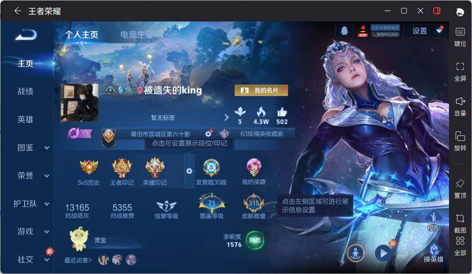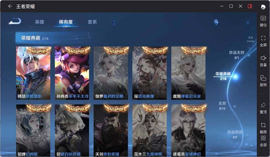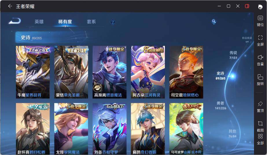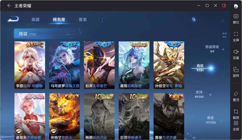 - PX_2105182-实名: 可修改 贵族等级: V7 英雄数: 121 皮肤数: 145 荣耀水晶: 鸣剑·曳影 传说皮: 黄金射手座,幻光神枪 限定皮: 遇见飞天,李小龙,游园惊梦,梁祝,天魔缭乱,至尊宝,如梦令-后羿,猪悟能,齐天大圣,愿照·众生和,愿照·岁时盈
