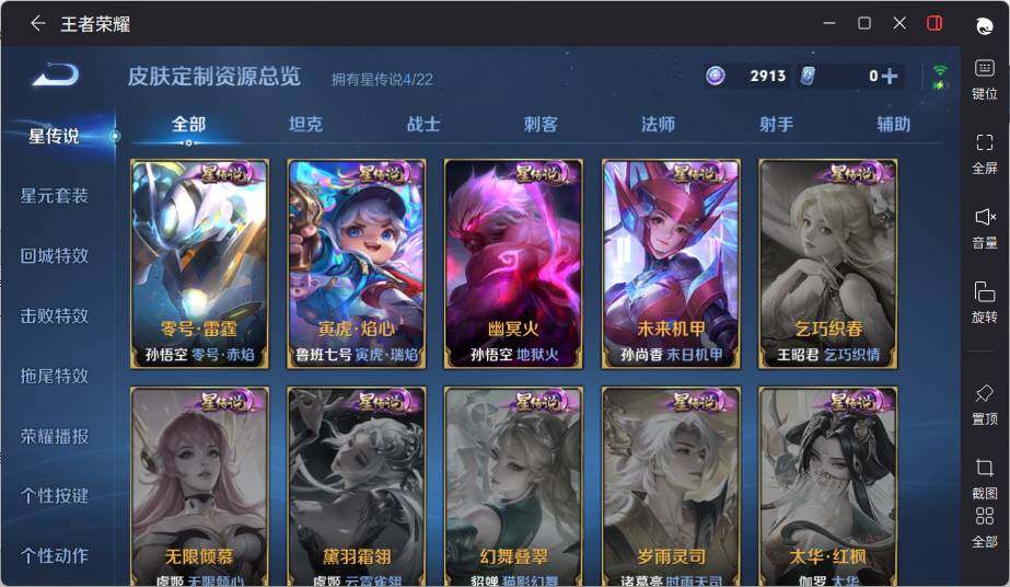 裴擒虎李小龙,上官婉儿梁祝,后羿辉光之辰,典韦岱宗,裴擒虎天狼狩猎者,上官婉儿天狼绘梦者,百里守约朱雀志,项羽霸王别姬,孙悟空大圣娶亲,孙悟空至尊宝,孙悟空孙行者,后羿无尽星芒,马可波罗深海之息,马可波罗山海·玄木吟