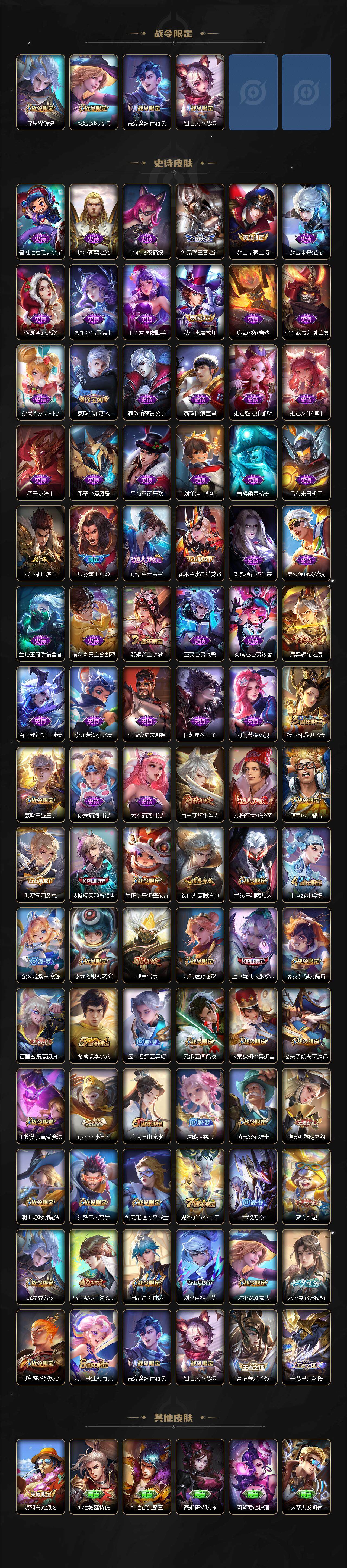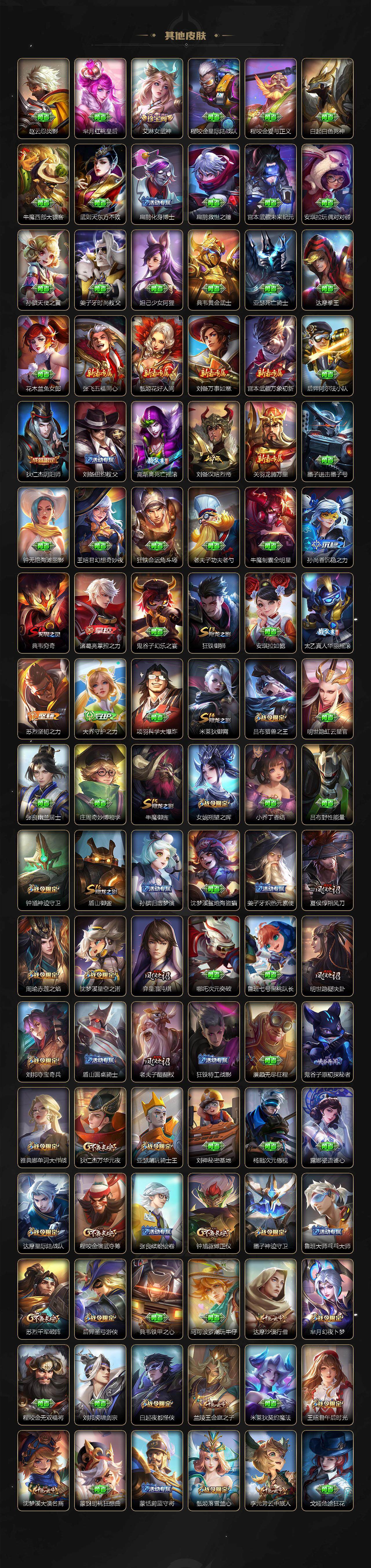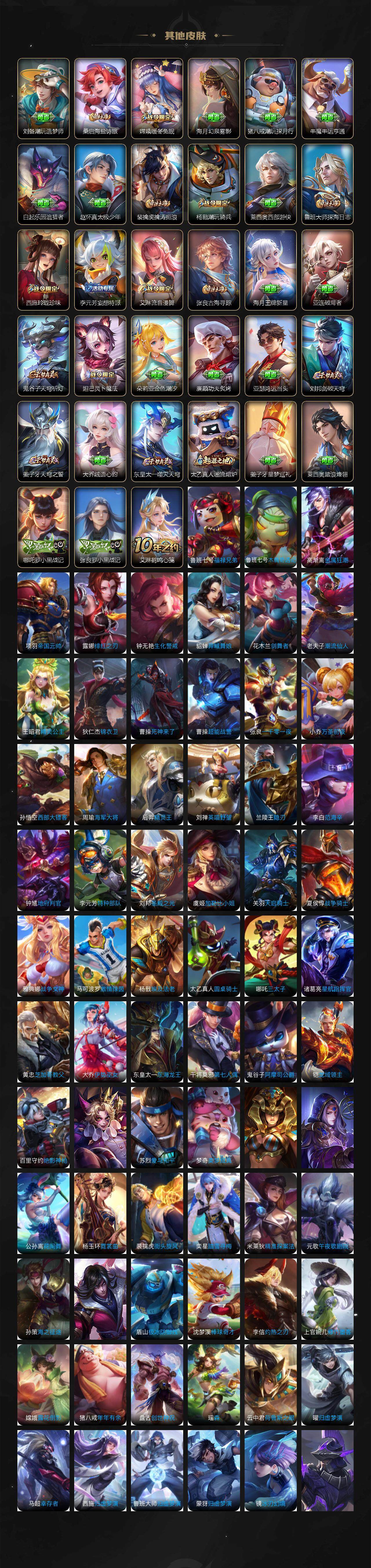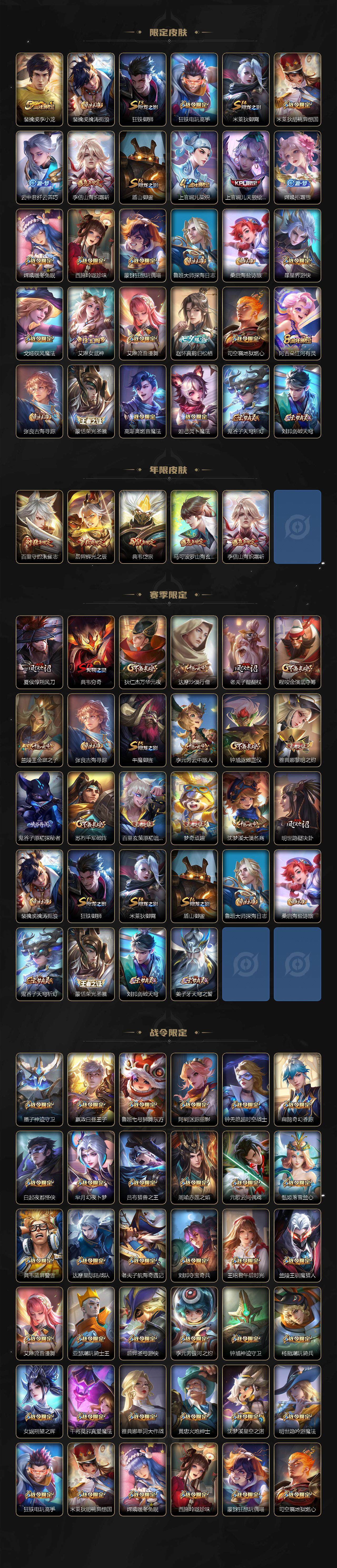 【限定皮肤】:大乔绒语心约,姜子牙天穹之誓,狄仁杰阴阳师,赵云皇家上将,墨子神迹守卫,嬴政优雅恋人,嬴政白昼王子,鲁班七号狮舞东方,庄周高山流水,高渐离死亡摇滚,阿轲迷踪丽影,钟无艳王者之锤,钟无艳超时空战士,扁鹊奇幻香踪,白起夜都怪侠,芈月幻夜卜梦,吕布猎兽之王,周瑜赤莲之焰,元歌云间偶戏,元歌无心,夏侯惇朔风刀,甄姬游园惊梦,甄姬落雪兰心,典韦穷奇,典韦蓝屏警告,典韦岱宗,马可波罗深海之息,马可波罗山海玄木吟,狄仁杰魔术师,狄仁杰万华元夜,达摩星际陆战队,达摩沙漠行僧,项羽海滩派对,项羽霸王别姬,老夫子醍醐杖,老夫子航海奇遇记,程咬金演武夺筹,刘邦夺宝奇兵,王昭君午后时光,兰陵王驯魔猎人,兰陵王金庭之子,亚瑟潮玩骑士王,孙悟空至尊宝,孙悟空大圣娶亲,孙悟空零号赤焰,孙悟空孙行者,牛魔御旌,后羿辉光之辰,后羿圣弓游侠,后羿无尽星芒,刘备百相守梦,李元芳银河之约,李元芳云中旅人,虞姬启明星使,钟馗神迹守卫,钟馗驱傩正仪,杨玉环遇见飞天,杨戬潮玩骑兵,女娲朔望之晖,干将莫邪真爱魔法,雅典娜单词大作战,雅典娜黎明之约,蔡文姬繁星吟游,太乙真人华丽摇滚,鬼谷子原初探秘者,鬼谷子五谷丰年,诸葛亮武陵仙君,黄忠火炮绅士,苏烈千军破阵,百里玄策原初追逐者,百里守约朱雀志,弈星混沌棋,梦奇顽趣,沈梦溪星空之诺,沈梦溪大漠名商,明世隐疑决卦,明世隐吟游魔法,裴擒虎天狼狩猎者,裴擒虎李小龙,裴擒虎擒涛扼浪,狂铁御狮,狂铁电玩高手,米莱狄御霄,米莱狄胡桃异想国,云中君纤云弄巧,李信山海炽霜斩,盾山御銮,上官婉儿梁祝,上官婉儿天狼绘梦者,嫦娥拒霜思,嫦娥暖冬兔眠,西施玲珑珍味,蒙犽狂想玩偶喵,鲁班大师探海日志,桑启海盐诗旅,暃星界游侠,戈娅驭风魔法,艾琳女武神,艾琳流音漫舞,赵怀真鹤归松栖,司空震地狱燃心,阿古朵江河有灵,张良古海寻踪,蒙恬荣光圣徽,高渐离燃音魔法,妲己灵卜魔法,鬼谷子天穹祈灯,刘邦剑破天穹