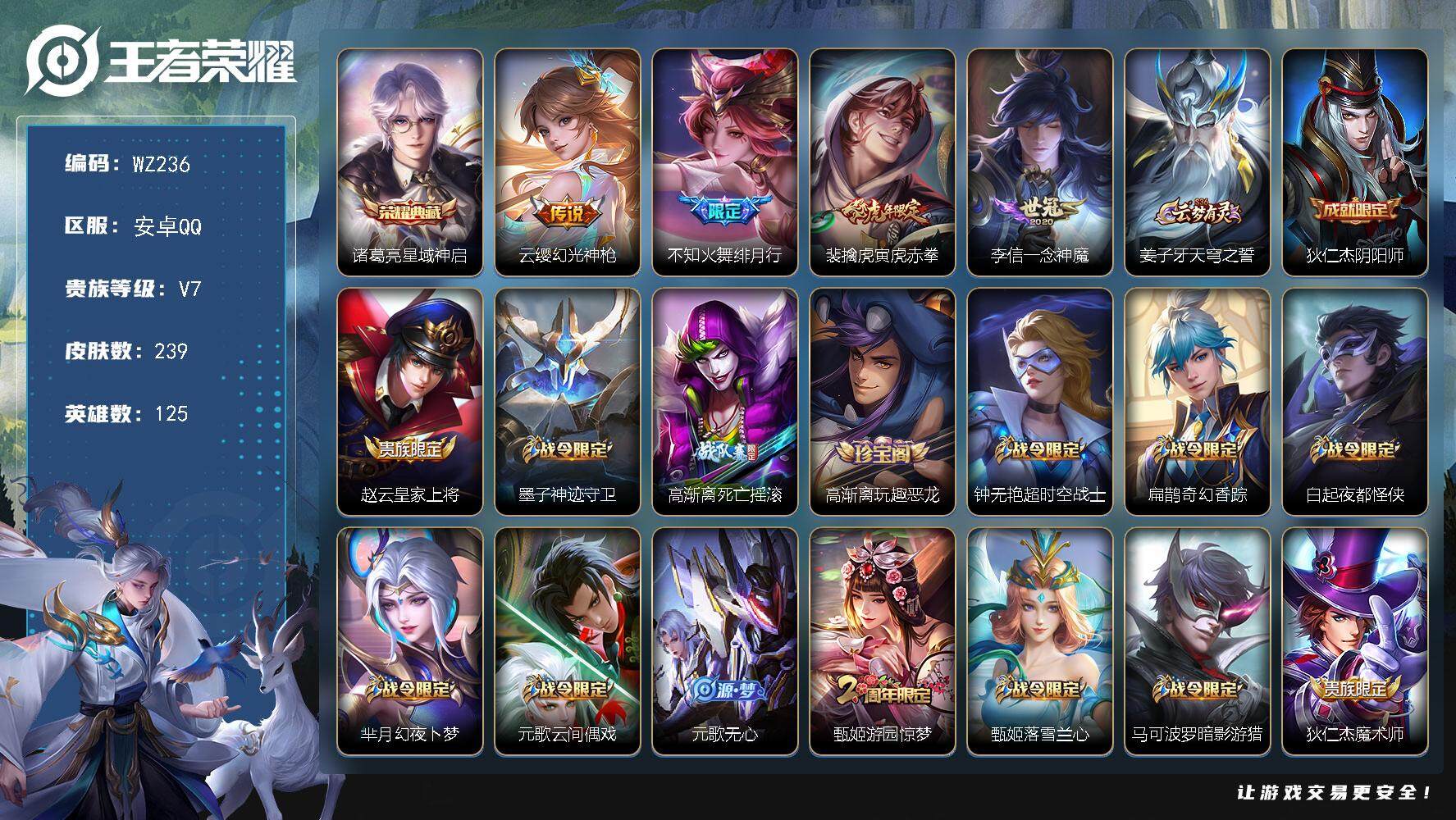 [14011068]安卓Q-V7-239皮肤-1典藏-4传说-75史诗 【英雄全皮】:蒙恬全皮 【荣耀典藏】:诸葛亮星域神启 【传说皮肤】:云缨幻光神枪,不知火舞绯月行,裴擒虎寅虎赤拳,李信一念神魔 【限定皮肤】:姜子牙天穹之誓,狄仁杰阴阳师,赵云皇家上将,墨子神迹守卫,高渐离死亡摇滚,高渐离玩趣恶龙,钟无艳超时空战士,扁鹊奇幻香踪,白起夜都怪侠,芈月幻夜卜梦,元歌云间偶戏,元歌无心,甄姬游园惊梦,甄姬落雪兰心,马可波罗暗影游猎,狄仁杰魔术师,狄仁杰万华元夜,达摩星际陆战队,达摩沙漠行僧,项羽海滩派对,老夫子醍醐杖,老夫子航海奇遇记,关羽冰锋战神,程咬金演武夺筹,露娜一生所爱,韩信逐梦之影,王昭君午后时光,兰陵王金庭之子,花木兰青春决赛季,花木兰默契交锋,不知火舞绯月行,亚瑟潮玩骑士王,孙悟空至尊宝,李元芳银河之约,李元芳云中旅人,钟馗驱傩正仪,杨戬潮玩骑兵,干将莫邪冰霜恋舞曲,雅典娜单词大作战,雅典娜黎明之约,蔡文姬繁星吟游,太乙真人华丽摇滚,鬼谷子原初探秘者,鬼谷子五谷丰年,黄忠火炮绅士,铠青龙志,苏烈千军破阵,百里玄策原初追逐者,弈星混沌棋,梦奇顽趣,沈梦溪星空之诺,沈梦溪大漠名商,明世隐疑决卦,明世隐吟游魔法,裴擒虎李小龙,裴擒虎寅虎赤拳,裴擒虎擒涛扼浪,狂铁电玩高手,米莱狄胡桃异想国,云中君纤云弄巧,伽罗天狼溯光者,猪八戒西部大镖客,嫦娥暖冬兔眠,蒙犽狂想玩偶喵,鲁班大师探海日志,桑启海盐诗旅,暃星界游侠,艾琳女武神,阿古朵江河有灵,张良古海寻踪,蒙恬荣光圣徽,鬼谷子天穹祈灯,刘邦剑破天穹 【年限皮肤】:铠青龙志,裴擒虎寅虎赤拳 【赛季限定】:狄仁杰万华元夜,达摩沙漠行僧,老夫子醍醐杖,程咬金演武夺筹,兰陵王金庭之子,张良古海寻踪,李元芳云中旅人,钟馗驱傩正仪,雅典娜黎明之约,鬼谷子原初探秘者,苏烈千军破阵,百里玄策原初追逐者,弈星混沌棋,梦奇顽趣,沈梦溪大漠名商,明世隐疑决卦,裴擒虎擒涛扼浪,鲁班大师探海日志,桑启海盐诗旅,鬼谷子天穹祈灯,蒙恬荣光圣徽,刘邦剑破天穹,姜子牙天穹之誓 【战令限定】:墨子神迹守卫,钟无艳超时空战士,扁鹊奇幻香踪,白起夜都怪侠,芈月幻夜卜梦,元歌云间偶戏,甄姬落雪兰心,马可波罗暗影游猎,达摩星际陆战队,老夫子航海奇遇记,王昭君午后时光,亚瑟潮玩骑士王,李元芳银河之约,杨戬潮玩骑兵,雅典娜单词大作战,黄忠火炮绅士,沈梦溪星空之诺,明世隐吟游魔法,