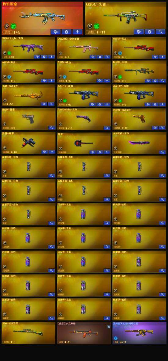 【英雄级武器】:G36C-幻影,SCAR Light-玄豹,QBZ03-独角-III,QBZ03-金色蔷薇,AWM-裁决*3,M200-幻神,炼狱-百战金芒,AA-12-雷霆*2,沙鹰-修罗,USP-雷暴,Anaconda-玄豹,柯尔特-百战金芒,擎天,麒麟刺-百战金芒,丛林匕首-玄豹,高爆手雷-玄豹*7,闪光弹-玄豹*7,烟雾弹-玄豹*7,Barrett-碧霄极光