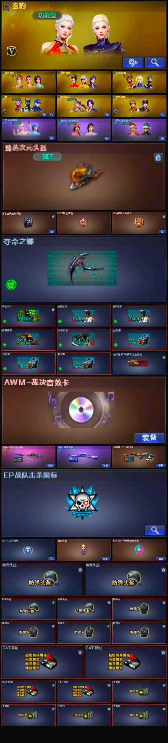 【道具】:BS战队炫彩背包,CFS限定背包,云山科技背包,亚洲杯纪念炫彩背包,百战金芒炫彩背包,雪域霜狐炫彩背包,女皇终结者-魔龙之吻,救世主-黑桃战神,黄金生化钩,绿色巨人,灵魂忍者,迷雾幽灵,夺命之镰,防化服*3,枪王排位28赛季金色流光,枪王排位29赛季金色流光,语音特效-盛典烟火,语音特效-怀旧,雪域霜狐表情,萌萌小葵表情,EP战队名片,EP战队喷图,EP战队击杀图标,C4-再燃火线,防弹头盔*4,防弹衣*4,C4工具钳*4,手雷包*4