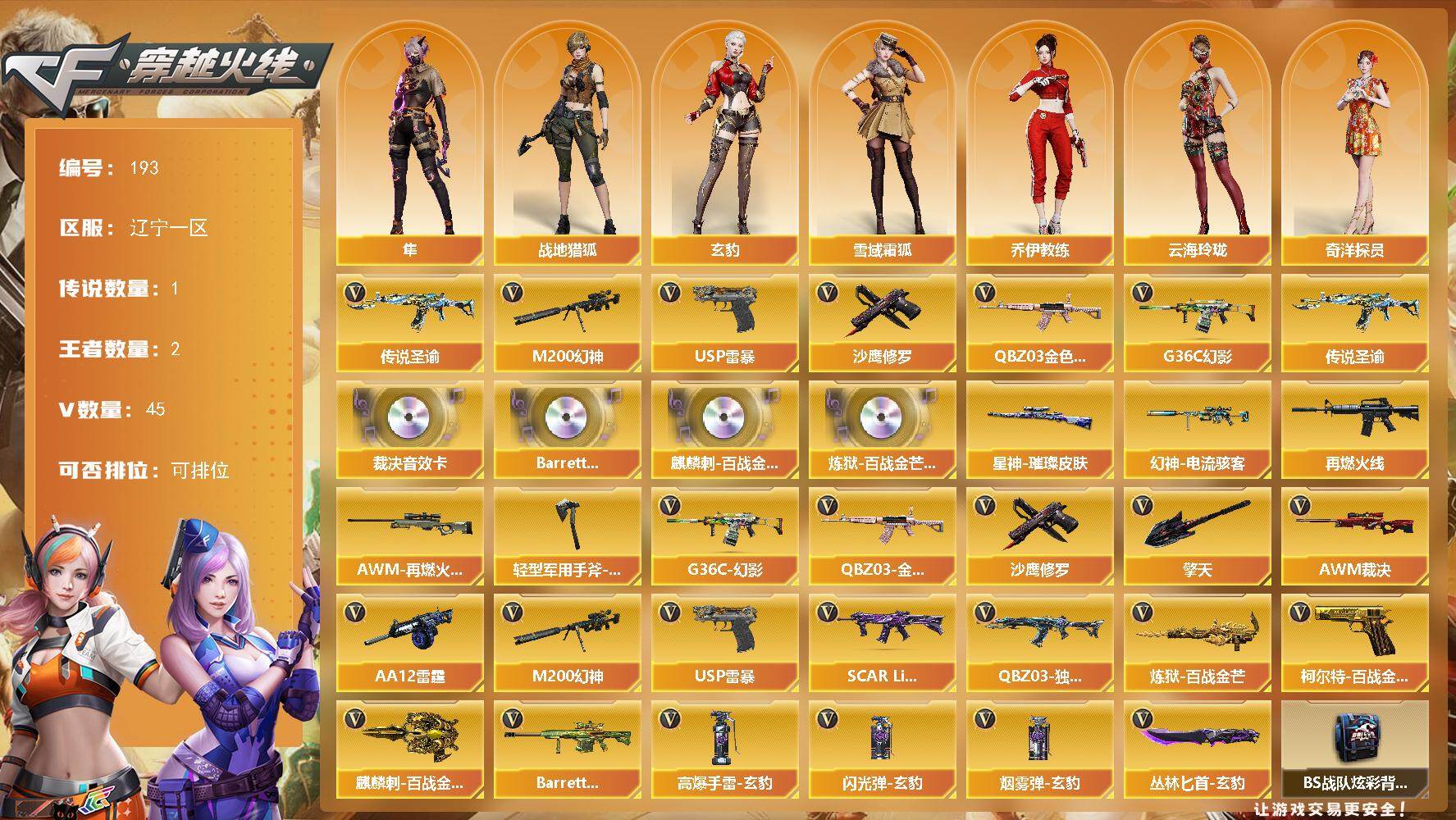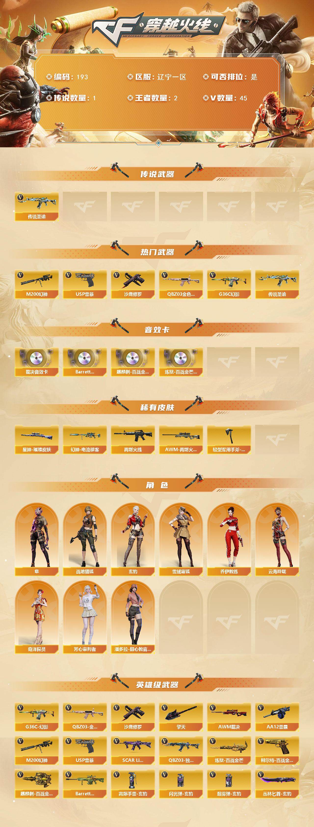 [14011092]辽宁一区-45V-2王者-0炫金 【传说武器】:传说圣谕 【热门武器】:传说圣谕,G36C-幻影,QBZ03-金色蔷薇,M200-幻神,USP-雷暴,沙鹰-修罗 【音效卡】:AWM-裁决音效卡,Barrett-碧霄极光音效卡*2,麒麟刺-百战金芒-盛典舞曲音效卡,炼狱-百战金芒-庆典舞曲音效卡 【皮肤】:幻神-电流骇客 皮肤,星神-璀璨皮肤,M4A1-再燃火线,AWM-再燃火线,轻型军用手斧-再燃火线 【角色】:隼,玄豹,战地猎狐,雪域霜狐,奇洋探员,乔伊教练,云海玲珑,芳心审判者,潘多拉-甜心教官 【英雄级武器】:G36C-幻影,SCAR Light-玄豹,QBZ03-独角-III,QBZ03-金色蔷薇,AWM-裁决*3,M200-幻神,炼狱-百战金芒,AA-12-雷霆*2,沙鹰-修罗,USP-雷暴,Anaconda-玄豹,柯尔特-百战金芒,擎天,麒麟刺-百战金芒,丛林匕首-玄豹,高爆手雷-玄豹*7,闪光弹-玄豹*7,烟雾弹-玄豹*7,Barrett-碧霄极光 【道具】:BS战队炫彩背包,CFS限定背包,云山科技背包,亚洲杯纪念炫彩背包,百战金芒炫彩背包,雪域霜狐炫彩背包,女皇终结者-魔龙之吻,救世主-黑桃战神,黄金生化钩,绿色巨人,灵魂忍者,迷雾幽灵,夺命之镰,防化服*3,枪王排位28赛季金色流光,枪王排位29赛季金色流光,语音特效-盛典烟火,语音特效-怀旧,雪域霜狐表情,萌萌小葵表情,EP战队名片,EP战队喷图,EP战队击杀图标,C4-再燃火线,防弹头盔*4,防弹衣*4,C4工具钳*4,手雷包*4 【特殊枪械】: