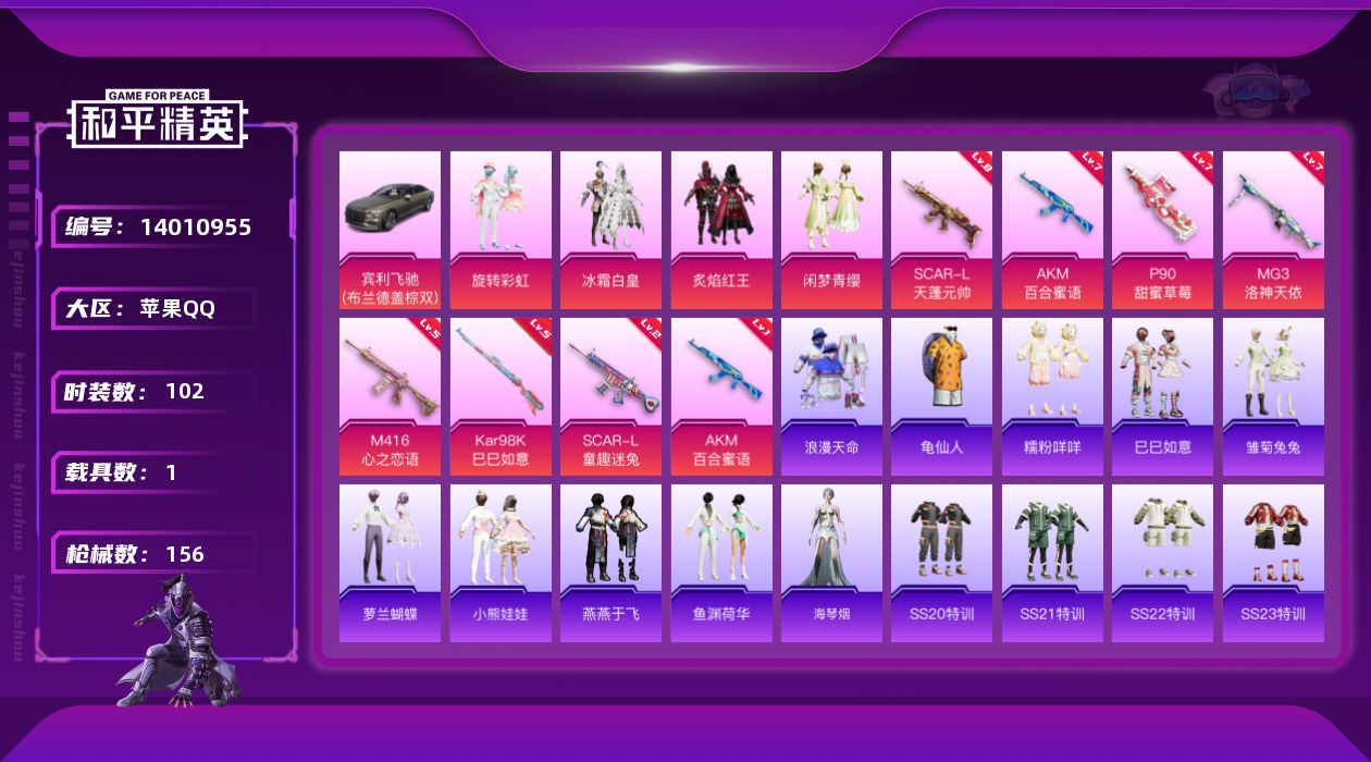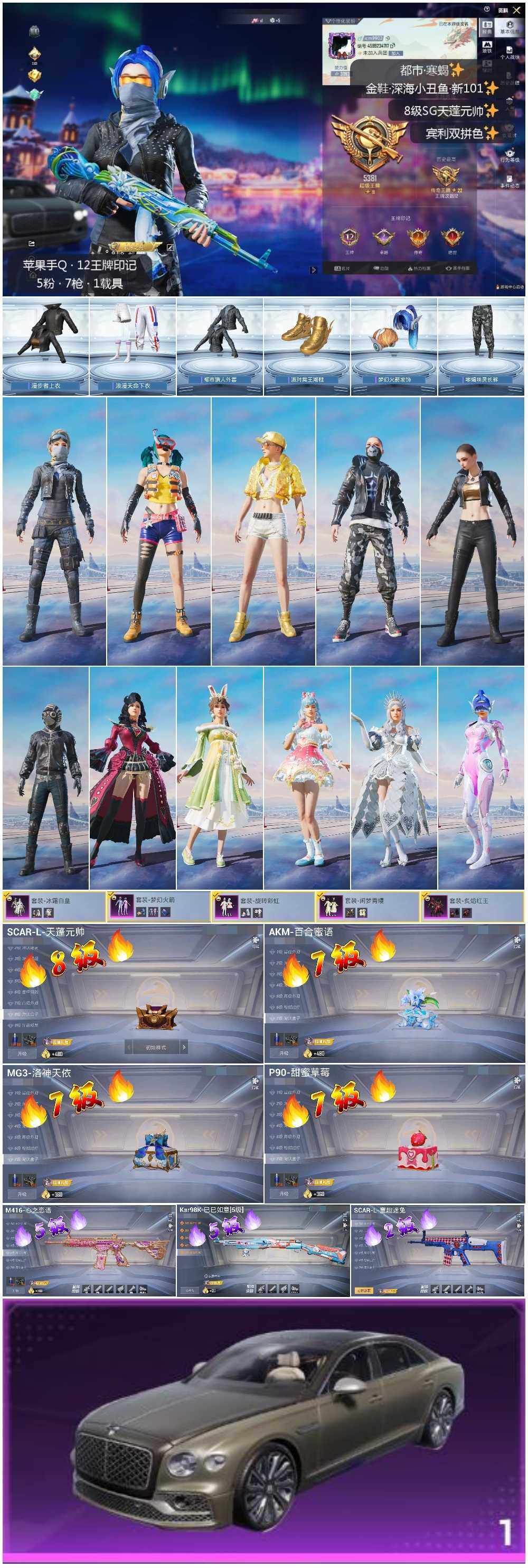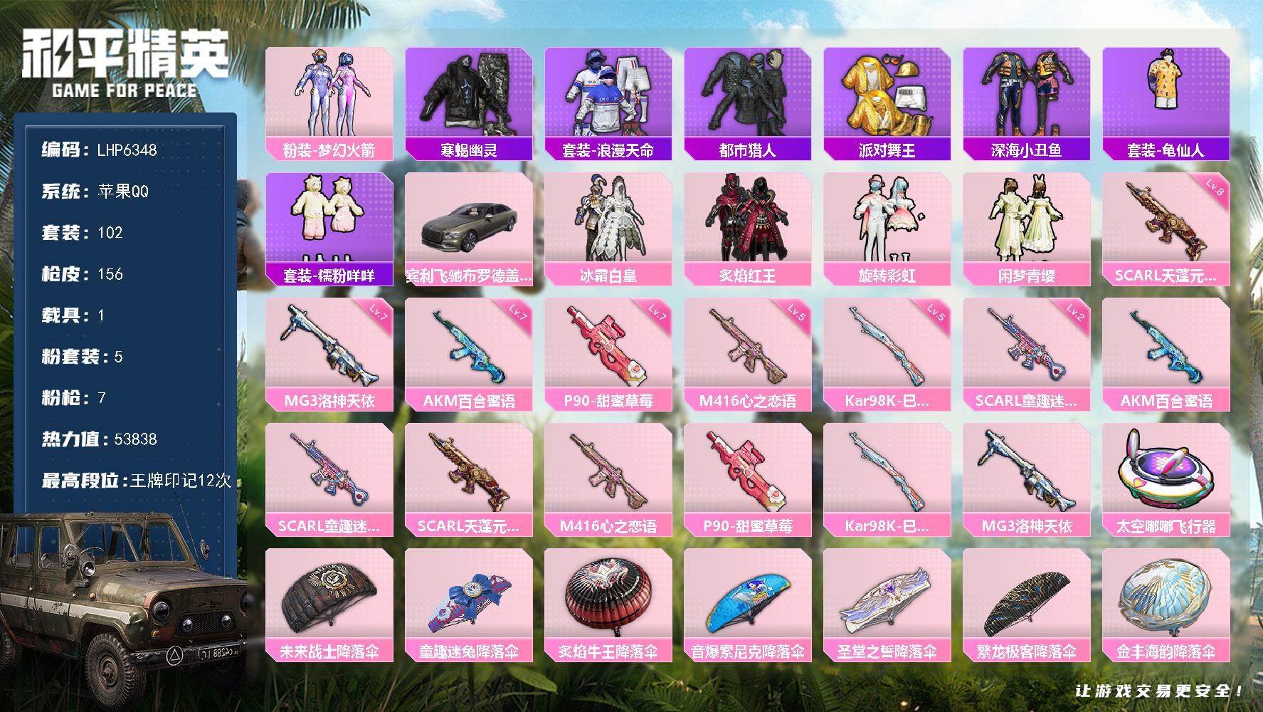 [14010955]可二次【店主推荐捡漏号!可直接换绑】/绝世印记1/素材身法号 苹果 手Q-5粉装-7特效枪-1载具-2粉色飞行器-5.3w热力值-12王牌印记-102套装-156枪皮【热门品类】:粉装-梦幻火箭,套装-寒蝎幽灵,套装-浪漫天命,套装-都市猎人,套装-派对舞王,套装-深海小丑鱼,套装-龟仙人,套装-糯粉咩咩【粉色载具】:宾利飞驰(布罗德盖棕双色)【粉色套装】:粉装-梦幻火箭,粉装-冰霜白皇,粉装-炙焰红王,粉装-旋转彩虹,粉装-闲梦青缨【粉色枪皮等级】:AKM-百合蜜语(七级),SCAR-L-童趣迷兔(二级),SCAR-L-天蓬元帅(八级),M416-心之恋语(五级),P90-甜蜜草莓(七级),Kar98K-巳巳如意(五级),MG3-洛神天依(七级)【粉色飞行器】:太空嘟嘟飞行器