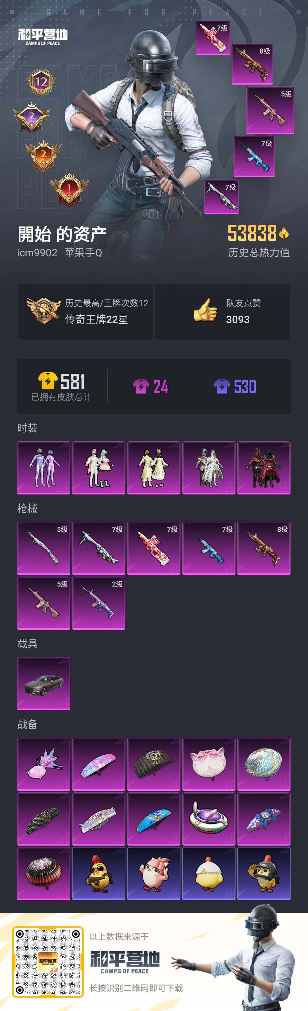 - PX_2091798- 苹果手Q-17王牌印记-12粉装-8特效枪-1载具-106143热力值-237套装-305枪皮-1卓越印记-1传奇印记 【12粉装】,天使彩虹糖,缤纷油彩,蝶舞迷情,第五大道,洛天依,草莓生巧,蓝莓炮弹,精灵娃娃,PEL轰鸣竞梦者,静灵氛围,智能音符,烟云彩露 【8特效枪】AKM-炫紫旋律-7级 AKM-甜心宝贝-7级 M416-电玩时刻-5级 Kar98K-巳巳如意-4级