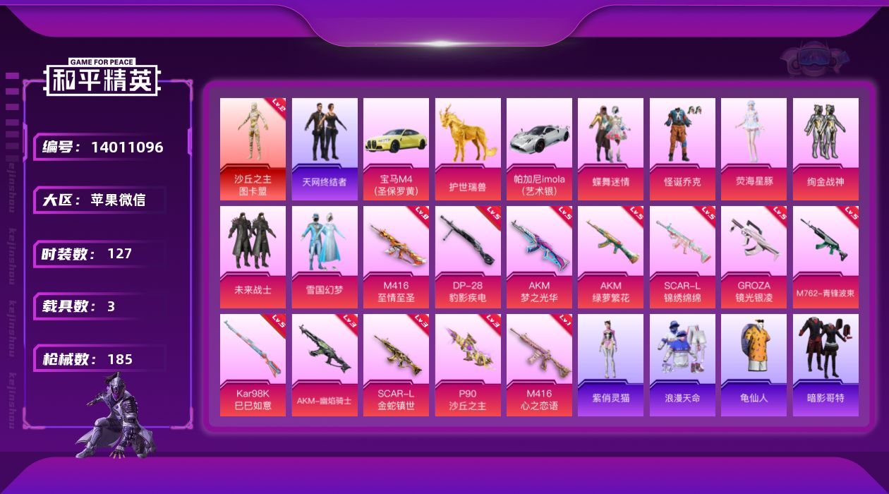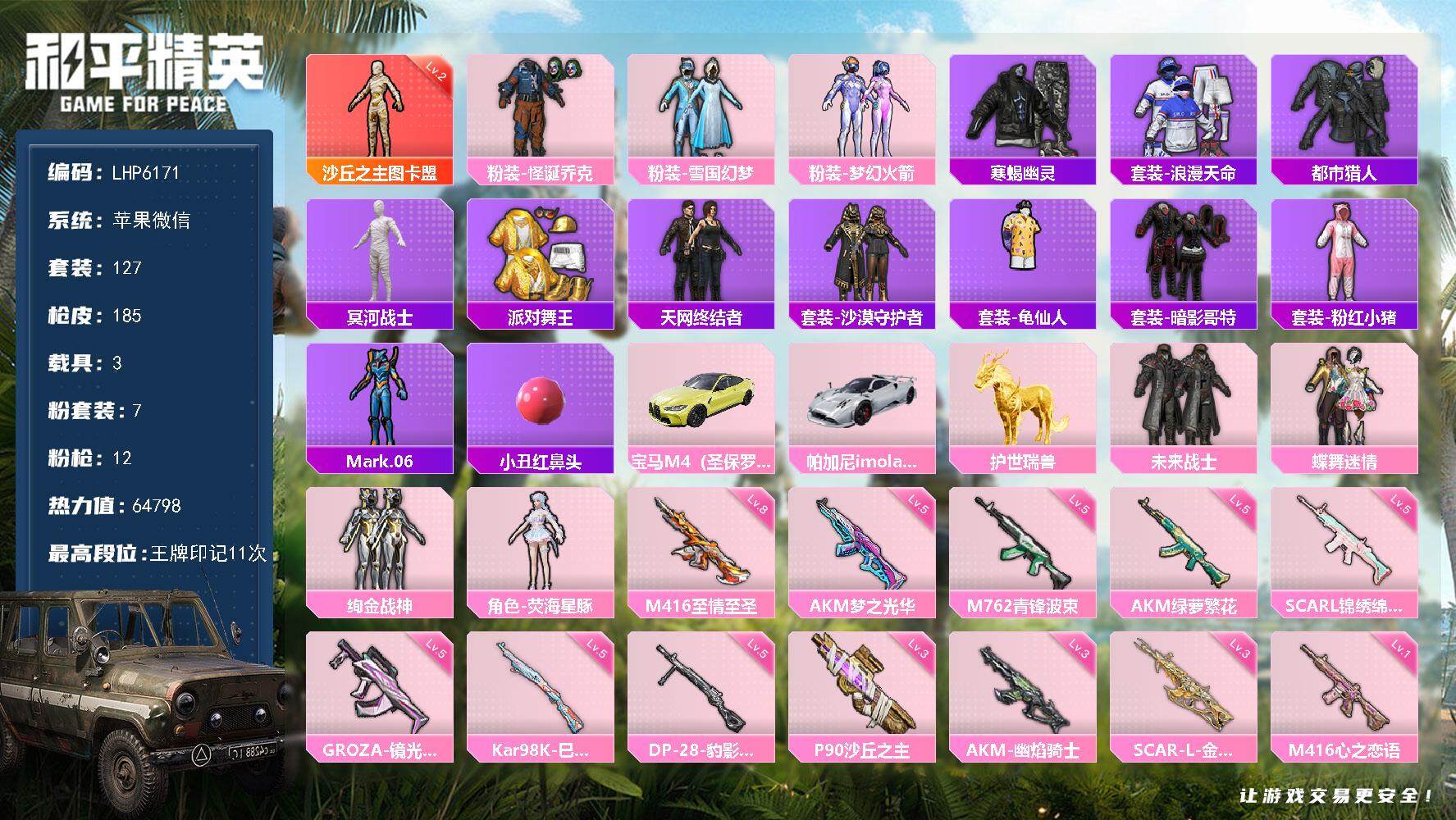 [14011096]永久设交限制 钱包不可改 游戏正常 素材身法号/老木乃伊 苹果 微信-1神装-7粉装-12特效枪-3载具-6粉色飞行器-6.4w热力值-11王牌印记-127套装-185枪皮【红色神装等级】:沙丘之主-图卡盟(二级)【热门品类】:粉装-怪诞乔克,粉装-雪国幻梦,粉装-梦幻火箭,套装-寒蝎幽灵,套装-浪漫天命,套装-都市猎人,套装-冥河战士,套装-派对舞王,套装-天网终结者,套装-沙漠守护者,套装-龟仙人,套装-暗影哥特,套装-粉红小猪,角色-Mark.06,小丑红鼻头【粉色载具】:宝马M4(圣保罗黄),帕加尼imola(艺术银),护世瑞兽【粉色套装】:粉装-未来战士,粉装-怪诞乔克,粉装-雪国幻梦,粉装-蝶舞迷情,粉装-梦幻火箭,粉装-绚金战神,角色-荧海星豚【粉色枪皮等级】:AKM-梦之光华(五级),AKM-绿萝繁花(五级),AKM-幽焰骑士(三级),SCAR-L-锦绣绵绵(五级),SCAR-L-金蛇镇世(三级),M416-心之恋语(一级),M416-至情至圣(八级),GROZA-镜光银凌(五级),M762-青锋波束(五级),P90-沙丘之主(三级),Kar98K-巳巳如意(五级),DP-28-豹影疾电(五级)【粉色飞行器】:酣梦熊熊飞行器,镜光幻境飞行翼,幽焰列车飞行器,万象金身飞行器,灵猫魔法师飞行器