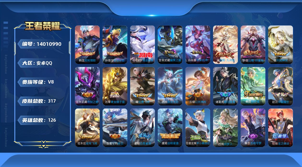 [14010990]【店主推荐捡漏号!可直接换绑】安卓Q-V8-最强王者段位-126英雄-317皮肤-2典藏-3星元-1珍品传说-15传说-91史诗 【英雄全皮】:蒙恬全皮,阿古朵全皮,戈娅全皮,影全皮 【荣耀典藏】:孙悟空全息碎影,韩信弑枪猎影 【珍品传说】:马可波罗怪盗基德 【传说皮肤】:澜愿照九州拓,云缨幻光神枪,桑启鸣野蒿,诸葛亮鹤羽星尊,李信山海炽霜斩,百里守约碎云,赵云淬星耀世,西施游龙清影,镜炽阳神光,虞姬启明星使,曜云鹰飞将,虞姬云霓雀翎,达摩黄金狮子座,花木兰冠军飞将,宫本武藏地狱之眼 【限定皮肤】:姜子牙天穹之誓,杨戬破阵退雄兵,狄仁杰阴阳师,赵云皇家上将,赵云引擎之心,高渐离死亡摇滚,高渐离玩趣恶龙,钟无艳超时空战士,扁鹊奇幻香踪,白起夜都怪侠,元歌无心,甄姬落雪兰心,马可波罗暗影游猎,狄仁杰魔术师,达摩沙漠行僧,项羽海滩派对,韩信傲雪梅枪,王昭君午后时光,兰陵王金庭之子,孙悟空美猴王,孙悟空孙行者,李元芳匿光侦查者,李元芳云中旅人,虞姬启明星使,杨戬潮玩骑兵,雅典娜黎明之约,太乙真人华丽摇滚,鬼谷子五谷丰年,诸葛亮鹤羽星尊,百里玄策原初追逐者,梦奇顽趣,沈梦溪大漠名商,明世隐吟游魔法,裴擒虎李小龙,裴擒虎擒涛扼浪,狂铁电玩高手,李信山海炽霜斩,上官婉儿梁祝,嫦娥拒霜思,嫦娥暖冬兔眠,西施玲珑珍味,鲁班大师探海日志,桑启海盐诗旅,暃星界游侠,戈娅驭风魔法,艾琳流音漫舞,司空震地狱燃心,阿古朵江河有灵,张良古海寻踪,蒙犽百解令,蒙恬荣光圣徽,鬼谷子天穹祈灯,沈梦溪龙舞盛年,刘邦剑破天穹,程咬金群星魔术团,芈月浮光幕影,周瑜熔金海岸 【年限皮肤】:孙悟空美猴王,李信山海炽霜斩 【赛季限定】:达摩沙漠行僧,兰陵王金庭之子,张良古海寻踪,李元芳云中旅人,雅典娜黎明之约,百里玄策原初追逐者,梦奇顽趣,沈梦溪大漠名商,裴擒虎擒涛扼浪,鲁班大师探海日志,桑启海盐诗旅,鬼谷子天穹祈灯,蒙恬荣光圣徽,刘邦剑破天穹,姜子牙天穹之誓 【战令限定】:钟无艳超时空战士,扁鹊奇幻香踪,白起夜都怪侠,甄姬落雪兰心,马可波罗暗影游猎,王昭君午后时光,艾琳流音漫舞,杨戬潮玩骑兵,明世隐吟游魔法,狂铁电玩高手,嫦娥暖冬兔眠,西施玲珑珍味,司空震地狱燃心,暃星界游侠,戈娅驭风魔法 【史诗皮肤】:项羽苍穹之光,露娜紫霞仙子,赵云皇家上将,赵云未来纪元,貂蝉圣诞恋歌,甄姬冰雪圆舞曲,王昭君偶像歌手,狄仁