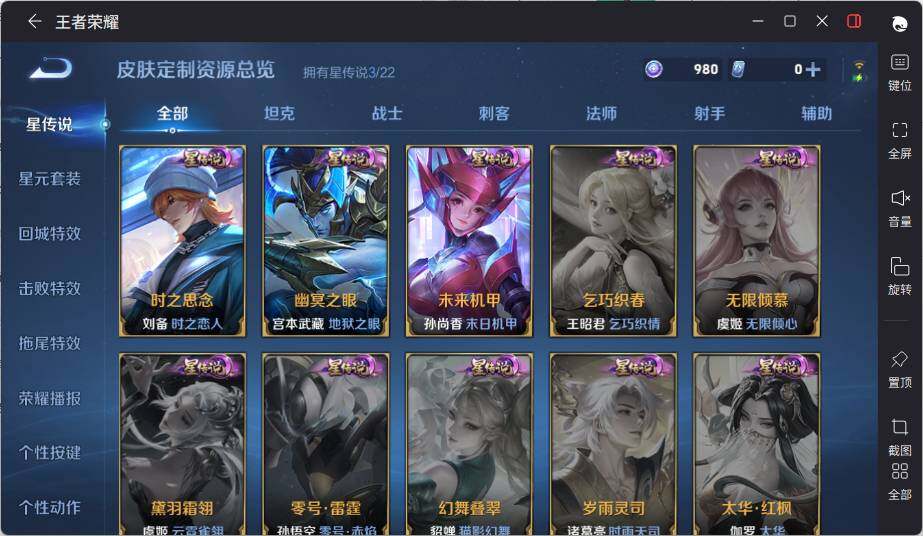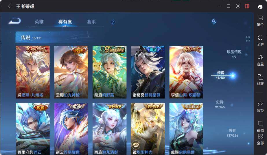 - [11285129]V7 1典藏 16传说 125英雄 272皮肤 可修改实名 优质装备:弑枪猎影(韩信典藏),黄金狮子座,冠军飞将,炽阳神光,一念神魔,地狱之眼,无双飞将,山海·炽霜斩(李信年限),澜逐花归海 传说皮:乘龙·淬吴钩(孙策年限),吕布曦玄引,幻光神枪 珍宝阁皮:妄想食味,优雅恋人,玩趣恶龙 限定皮:愿照·九州拓(澜年限),愿照·山河定(司空震年限),逐霄战戟,鸣野蒿,白虎志(电光耗子),白晶晶,遇见飞天,高山流水,五谷丰年,梁祝,岱宗(典韦年限),李小龙,青春决赛季,寅虎·赤拳(老虎年限) 史诗皮:星界战将,茶境仙,飞车小橘子,鸭鸭历险记-刘禅,龙之律动,百相守梦-黄忠,埋骨钱,怒海争锋,蔬乡物语(鲁班七号),琥珀纪元伽罗,化蝶舞,破空之剑,紫霞仙子,黄金分割率,特工魅影,千年之狐,高渐离燃音魔法,蒙恬荣光圣徽,偶像歌手,晚萤,无限星赏官,末日机甲-吕布,猫狗日记-孙策,乱世虎臣,节奏热浪,女仆咖啡,摇滚巨星,水果甜心,天才门将,星夜王子,心灵骇客,功夫厨神,德古拉伯爵,暗隐猎兽者,幽灵船长,鬼剑武藏,暗渊魔法,心灵战警,天秀·启明,舞动绿茵,地狱岩魂,纤云弄巧,繁星吟游(呼啦呼啦),拒霜思,乘风破浪,逐浪之夏,水晶猎龙者,曙光守护者,金属风暴,原初追逐者,圣诞狂欢,圣诞恋歌,鹰眼统帅,无心,未来纪元-赵云