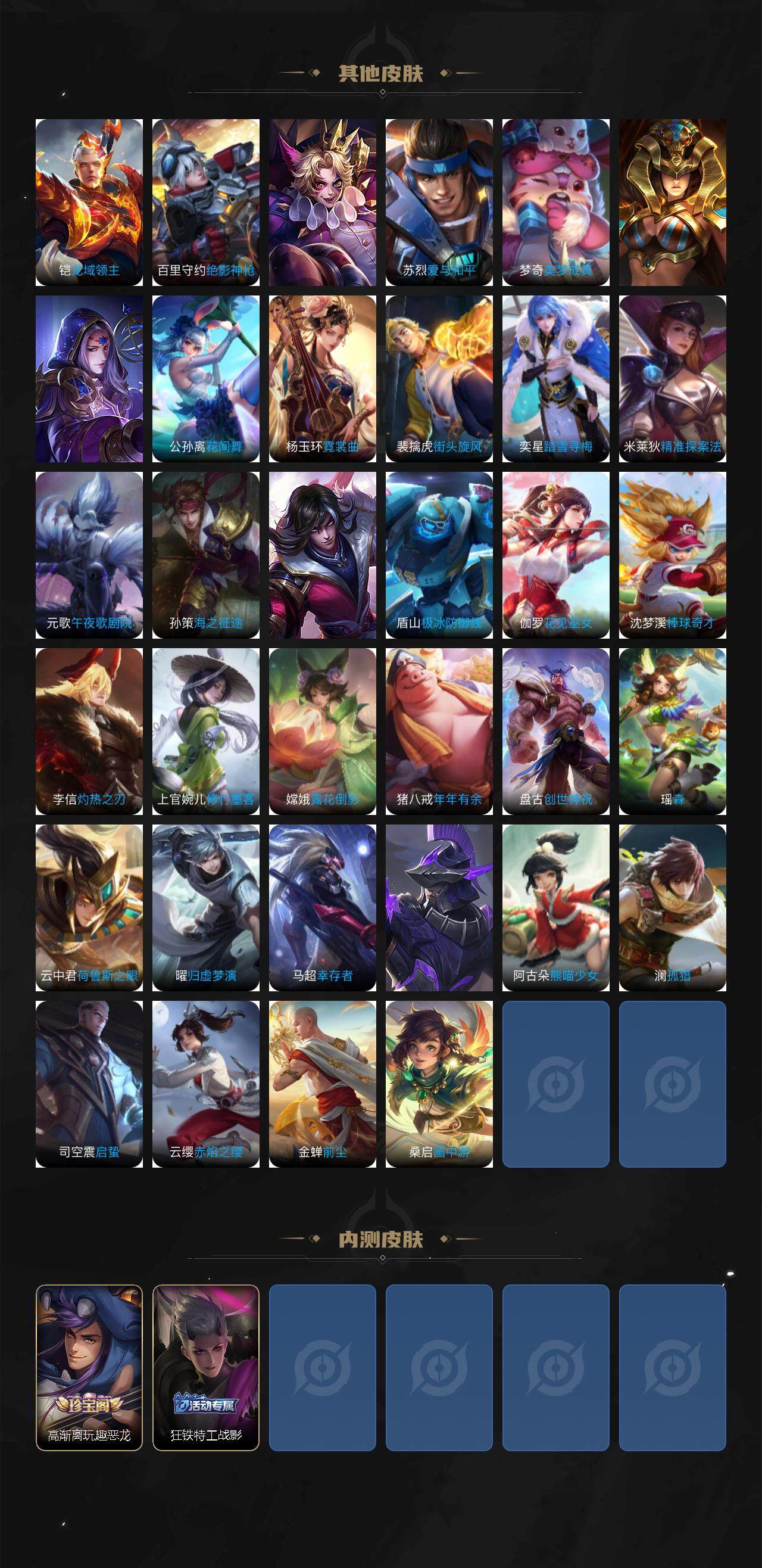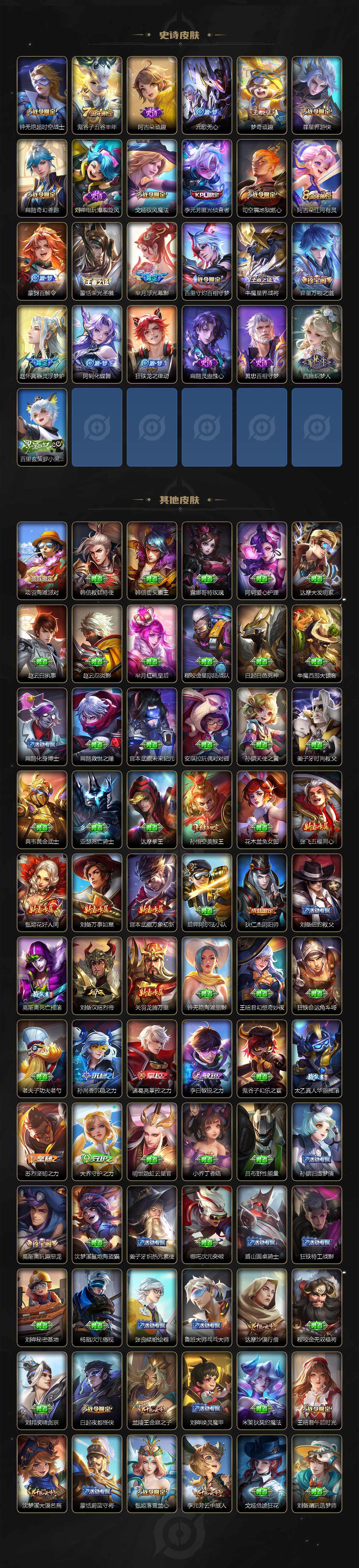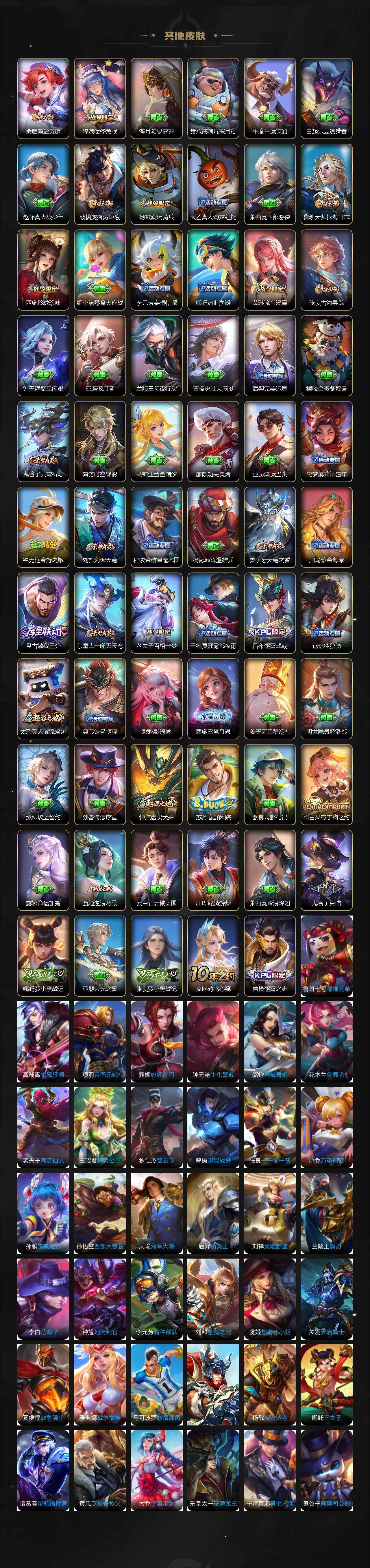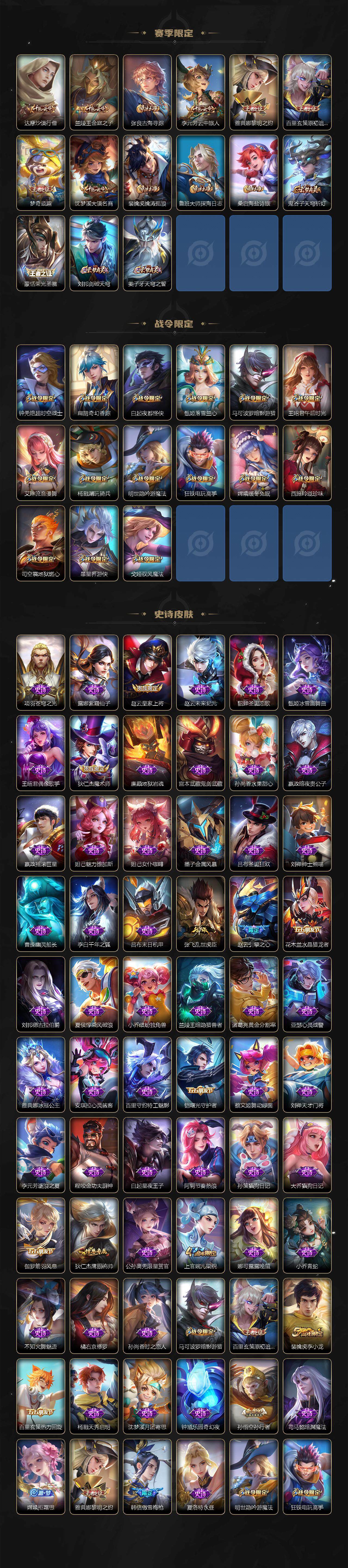 【限定皮肤】:姜子牙天穹之誓,杨戬破阵退雄兵,狄仁杰阴阳师,赵云皇家上将,赵云引擎之心,高渐离死亡摇滚,高渐离玩趣恶龙,钟无艳超时空战士,扁鹊奇幻香踪,白起夜都怪侠,元歌无心,甄姬落雪兰心,马可波罗暗影游猎,狄仁杰魔术师,达摩沙漠行僧,项羽海滩派对,韩信傲雪梅枪,王昭君午后时光,兰陵王金庭之子,孙悟空美猴王,孙悟空孙行者,李元芳匿光侦查者,李元芳云中旅人,虞姬启明星使,杨戬潮玩骑兵,雅典娜黎明之约,太乙真人华丽摇滚,鬼谷子五谷丰年,诸葛亮鹤羽星尊,百里玄策原初追逐者,梦奇顽趣,沈梦溪大漠名商,明世隐吟游魔法,裴擒虎李小龙,裴擒虎擒涛扼浪,狂铁电玩高手,李信山海炽霜斩,上官婉儿梁祝,嫦娥拒霜思,嫦娥暖冬兔眠,西施玲珑珍味,鲁班大师探海日志,桑启海盐诗旅,暃星界游侠,戈娅驭风魔法,艾琳流音漫舞,司空震地狱燃心,阿古朵江河有灵,张良古海寻踪,蒙犽百解令,蒙恬荣光圣徽,鬼谷子天穹祈灯,沈梦溪龙舞盛年,刘邦剑破天穹,程咬金群星魔术团,芈月浮光幕影,周瑜熔金海岸