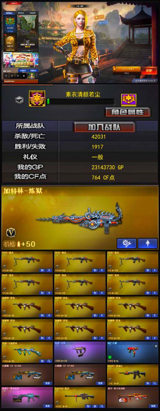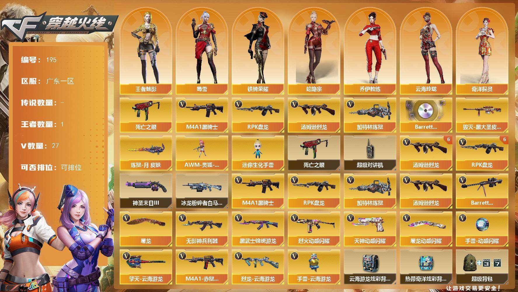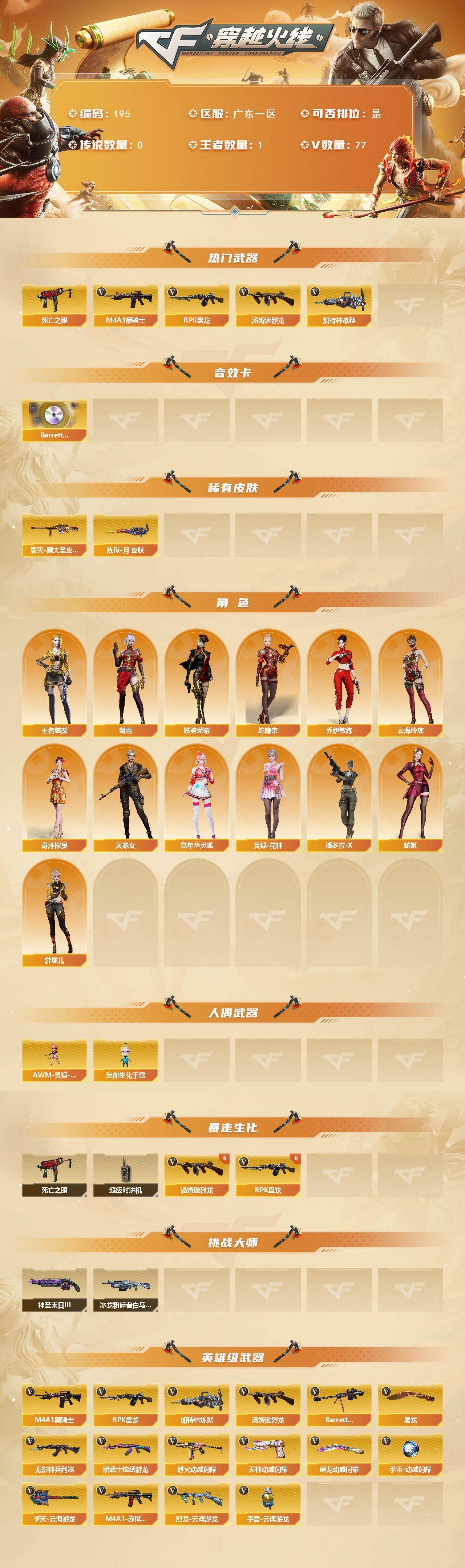 [14011292]广东一区-27V-1王者-0炫金 【热门武器】:死亡之眼,M4A1-黑骑士,汤姆逊-烈龙*6,RPK-盘龙*6,加特林-炼狱 【音效卡】:Barrett-碧霄极光音效卡 【皮肤】:毁灭-黑大圣皮肤,炼狱-月 皮肤 【角色】:王者-魅影,蛇隐宗,奇洋探员,乔伊教练,云海玲珑,风暴女,嘉年华灵狐,灵狐-花神,潘多拉-X,蛇姬,蜀雪,铁骑荣耀,游珑儿 【人偶武器】:AWM-灵狐-15周年嘉年华*2,迷你生化手雷*3 【暴走生化】:死亡之眼,超级对讲机 【挑战大师】:冰龙粉碎者-白马银枪,神圣爆裂者-末日III 【英雄级武器】:M4A1-黑骑士,无影-神兵利器,黑武士-锦绣游龙,烈火-动感闪耀,Barrett-毁灭,RPK-盘龙*6,加特林-炼狱,汤姆逊-烈龙*6,烈龙-云海游龙,天神-动感闪耀,屠龙,屠龙-动感闪耀,擎天-云海游龙,手雷-动感闪耀,手雷-云海游龙,M4A1-赤狱骑士 【道具】:云海游龙炫彩背包,热带奇洋炫彩背包,超级背包,黑桃战神背包,哔哩哔哩名片,圣拳猎手-炽雪,虚空终结者-暗域熔岩,女皇终结者-魔龙之吻,救世主-黑桃战神,黄金生化钩,灵魂忍者*2,变异宝贝,迷雾幽灵,生化弹匣,夺命之镰,防化服*2,金色流光-枪王排位*2,星辰流光-枪王排位,枪王排位28赛季金色流光,动感闪耀表情,云海游龙表情,防弹头盔*2,防弹衣*2,C4工具钳*2,手雷包*2 【特殊枪械】:1黑骑士,6烈龙,6盘龙,1炼狱