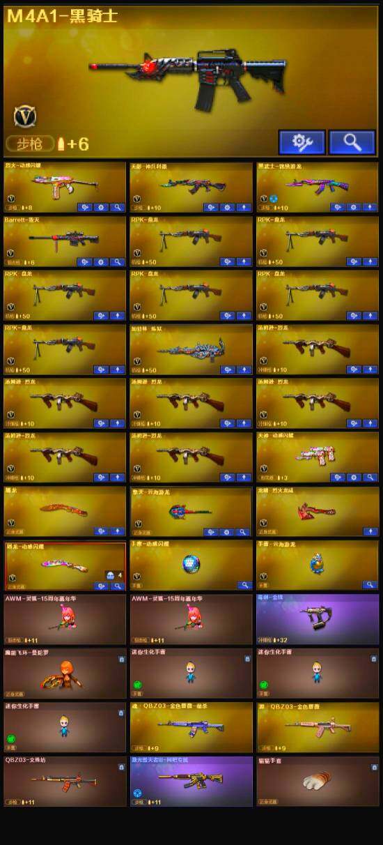 【英雄级武器】:M4A1-黑骑士,无影-神兵利器,黑武士-锦绣游龙,烈火-动感闪耀,Barrett-毁灭,RPK-盘龙*6,加特林-炼狱,汤姆逊-烈龙*6,烈龙-云海游龙,天神-动感闪耀,屠龙,屠龙-动感闪耀,擎天-云海游龙,手雷-动感闪耀,手雷-云海游龙,M4A1-赤狱骑士