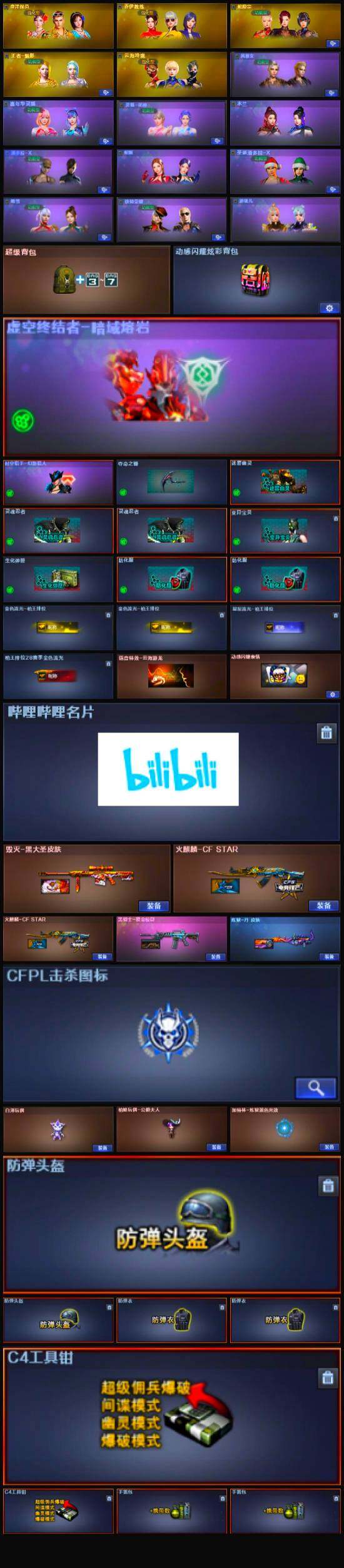 【道具】:云海游龙炫彩背包,热带奇洋炫彩背包,超级背包,黑桃战神背包,哔哩哔哩名片,圣拳猎手-炽雪,虚空终结者-暗域熔岩,女皇终结者-魔龙之吻,救世主-黑桃战神,黄金生化钩,灵魂忍者*2,变异宝贝,迷雾幽灵,生化弹匣,夺命之镰,防化服*2,金色流光-枪王排位*2,星辰流光-枪王排位,枪王排位28赛季金色流光,动感闪耀表情,云海游龙表情,防弹头盔*2,防弹衣*2,C4工具钳*2,手雷包*2
