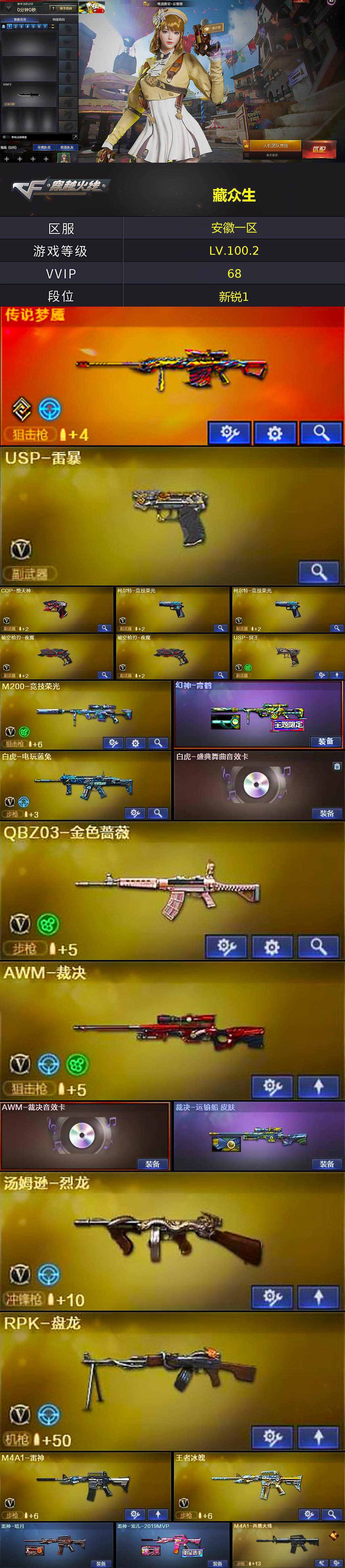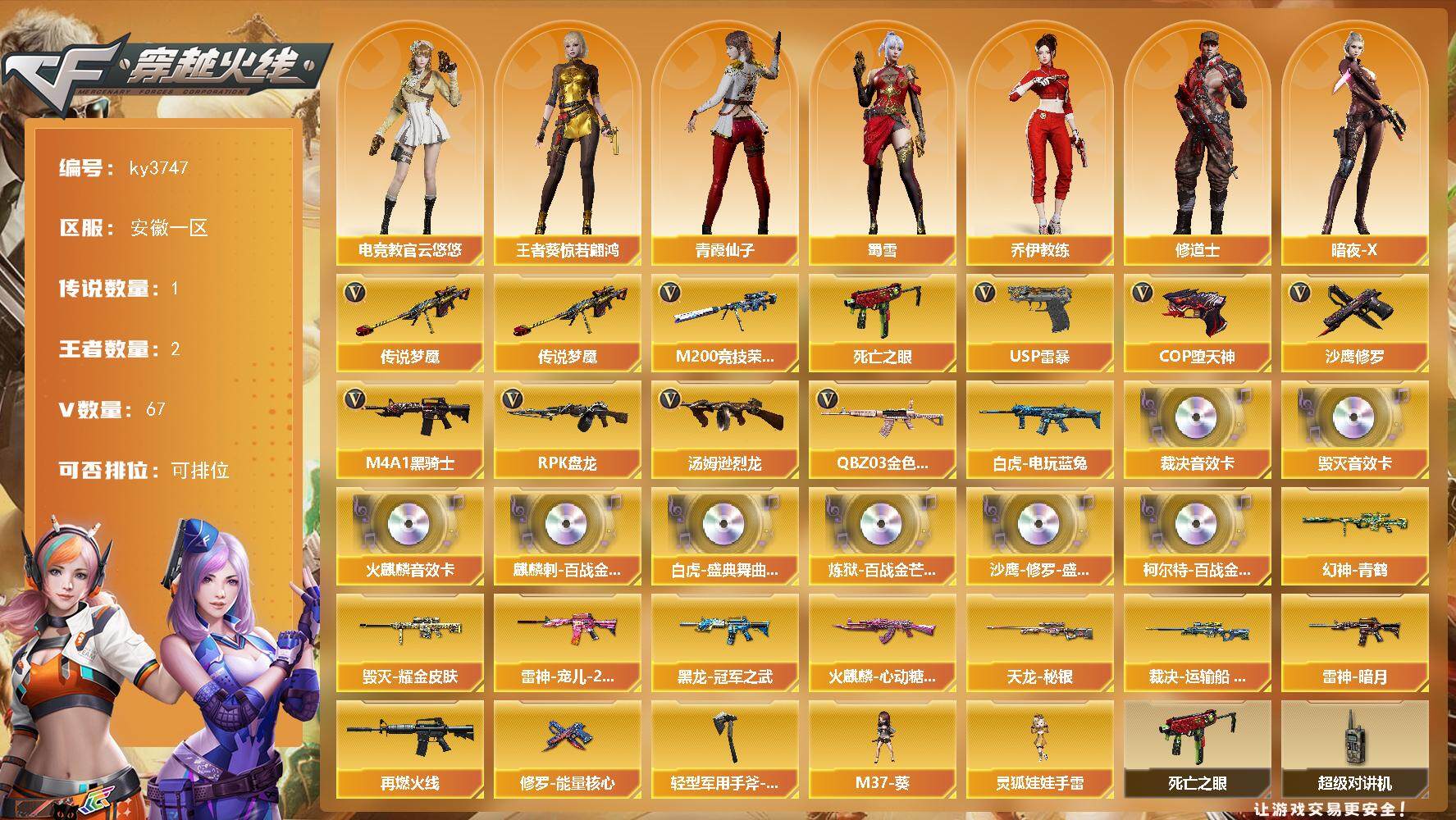 [14012792]安徽一区-67V-2王者-0炫金 【传说武器】:传说梦魇 【热门武器】:传说梦魇,QBZ03-金色蔷薇,M200-竞技荣光,死亡之眼,白虎-电玩蓝兔,M4A1-黑骑士,汤姆逊-烈龙,RPK-盘龙,USP-雷暴,COP-堕天神,沙鹰-修罗 【音效卡】:AK47-火麒麟音效卡,Barrett-毁灭音效卡,AWM-裁决音效卡,麒麟刺-百战金芒-盛典舞曲音效卡,白虎-盛典舞曲音效卡,炼狱-百战金芒-庆典舞曲音效卡,沙鹰-修罗-盛典舞曲音效卡,柯尔特-百战金芒-庆典舞曲音效卡 【皮肤】:幻神-青鹤,裁决-运输船 皮肤,雷神-暗月,雷神-宠儿-2019MVP,M4A1-再燃火线,火麒麟-心动糖果,毁灭耀金皮肤,黑龙-冠军之武,天龙-秘银,修罗-能量核心,轻型军用手斧-再燃火线 【角色】:电竞教官-云悠悠,王者葵-惊若翩鸿,乔伊教练,修道士,暗夜-X,初恋灵狐,风暴女,虎妞,龙儿-小淘气,麻雀,潘多拉-X,潘多拉-甜心教官,青霞仙子,斯沃特-X,蜀雪,新娜塔莎 【人偶武器】:M37-葵,灵狐娃娃手雷 【暴走生化】:死亡之眼,超级对讲机 【挑战大师】:激光毁灭者III-白马银枪,VEPR-12-金魔*2 【英雄级武器】:AK47-火麒麟*2,M4A1-黑龙,M4A1-雷神,M4A1-黑骑士,AN94-超新星,M4A1-夜魔,QBZ03-金色蔷薇,王者冰魄-觉醒版,白虎-电玩蓝兔,AWM-天龙,Barrett-毁灭,AWM-裁决,M200-竞技荣光,RPK-盘龙,炼狱-百战金芒,汤姆逊-烈龙,沙鹰-修罗,沙鹰-天神*4,USP-雷暴,COP-堕天神,柯尔特-竞技荣光*2,破空枪刃-夜魔*2,USP-冥王,屠龙*3,龙啸,马来剑-夜魔,擎天,麒麟刺,擎天-竞技荣光,麒麟刺-百战金芒,高爆手雷-夜魔*5,高爆手雷-竞技荣光*2,高爆手雷-玄豹,闪光弹-夜魔*5,闪光弹-竞技荣光*2,闪光弹-玄豹,烟雾弹-夜魔*5,烟雾弹-竞技荣光*2,烟雾弹-玄豹 【道具】:XROCK炫彩背包,亚洲杯纪念炫彩背包,炫彩背包,百战金芒炫彩背包,女皇终结者-魔龙之吻,绿色巨人,灵魂忍者*2,迷雾幽灵,夺命之镰,防化服*2,金色流光-枪王排位,流光-鎏金之域,语音特效-盛典烟火,萌萌小葵表情,审判者表情,防弹头盔*3,防弹衣*3,C4工具钳*3,手雷包*3 【特殊枪械】:1黑骑士,1烈龙,1盘龙