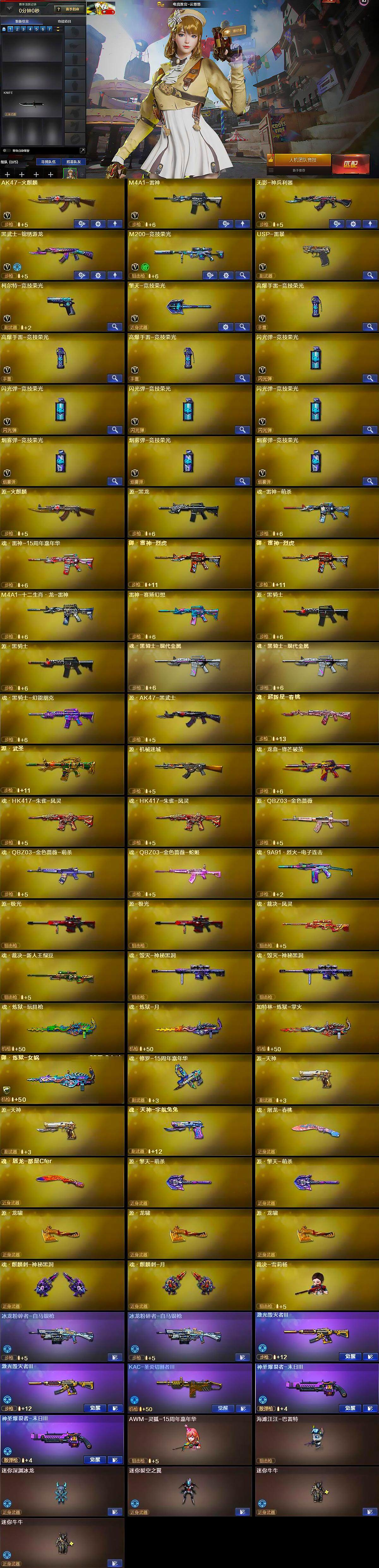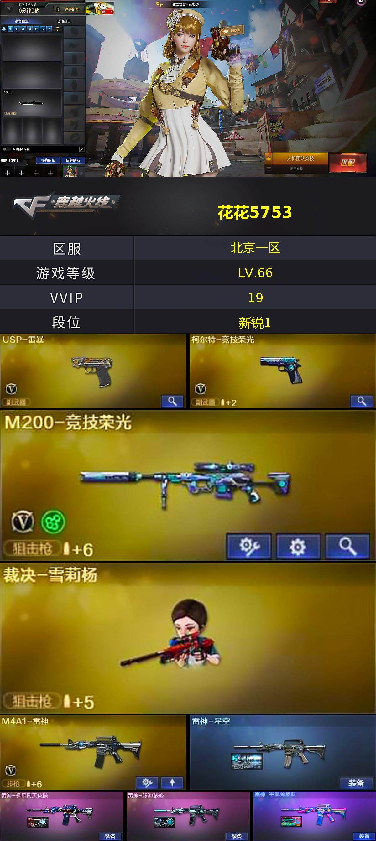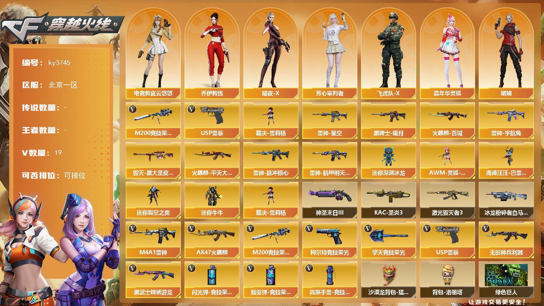 [14013075]北京一区-19V-0王者-0炫金 【热门武器】:M200-竞技荣光,裁决-雪莉杨,USP-雷暴 【皮肤】:雷神-星空,雷神-机甲刑天皮肤,雷神-脉冲核心,雷神-宇航兔皮肤,火麒麟-平天大圣,火麒麟-百城,毁灭-黑大圣皮肤,黑骑士-暗月 【角色】:电竞教官-云悠悠,乔伊教练,暗夜-X,芳心审判者,飞虎队-X,嘉年华灵狐,娟娟,兰妹妹,麻雀,曼陀罗-礼服,潘多拉-X,斯沃特-X,兔囡囡,铁扇公主-暗灵,樱-战斗天使,游珑儿 【人偶武器】:裁决-雪莉杨,AWM-灵狐-15周年嘉年华,海滩汪汪-巴雷特,迷你深渊冰龙,迷你裂空之翼,迷你牛牛*2 【挑战大师】:冰龙粉碎者-白马银枪*2,激光毁灭者III*2,KAC-圣炎切割者III,神圣爆裂者-末日III*2 【英雄级武器】:AK47-火麒麟,M4A1-雷神,无影-神兵利器,黑武士-锦绣游龙,M200-竞技荣光,USP-雷暴,柯尔特-竞技荣光,擎天-竞技荣光,高爆手雷-竞技荣光*3,闪光弹-竞技荣光*4,烟雾弹-竞技荣光*3 【道具】:沙漠龙背包-猛男专属,背包-洛丽塔,绿色巨人,变异宝贝,夺命之镰,防化服,金色流光-枪王排位,枪王排位28赛季金色流光,EP战队名片,防弹头盔*6,防弹衣*6,C4工具钳*6,手雷包*6 【特殊枪械】: