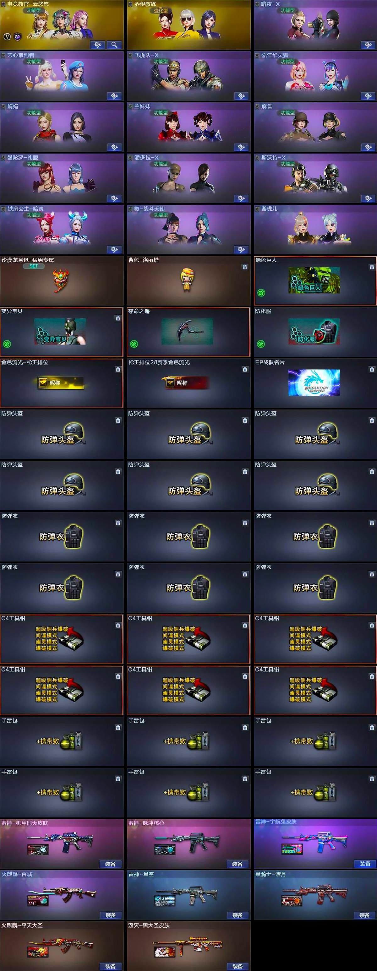 【道具】:沙漠龙背包-猛男专属,背包-洛丽塔,绿色巨人,变异宝贝,夺命之镰,防化服,金色流光-枪王排位,枪王排位28赛季金色流光,EP战队名片,防弹头盔*6,防弹衣*6,C4工具钳*6,手雷包*6