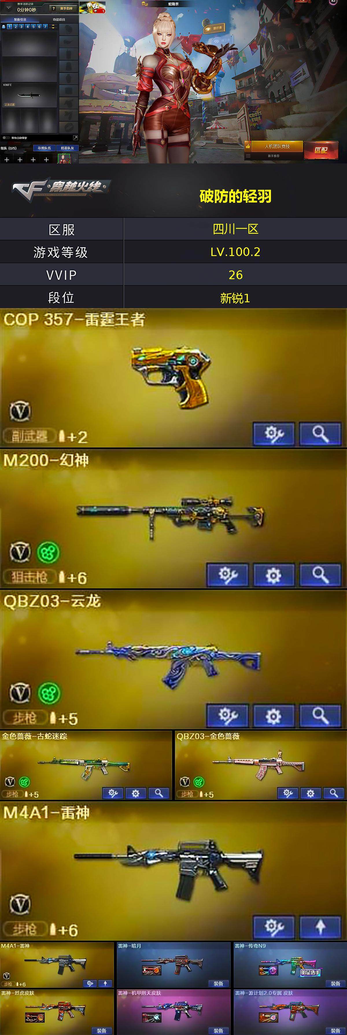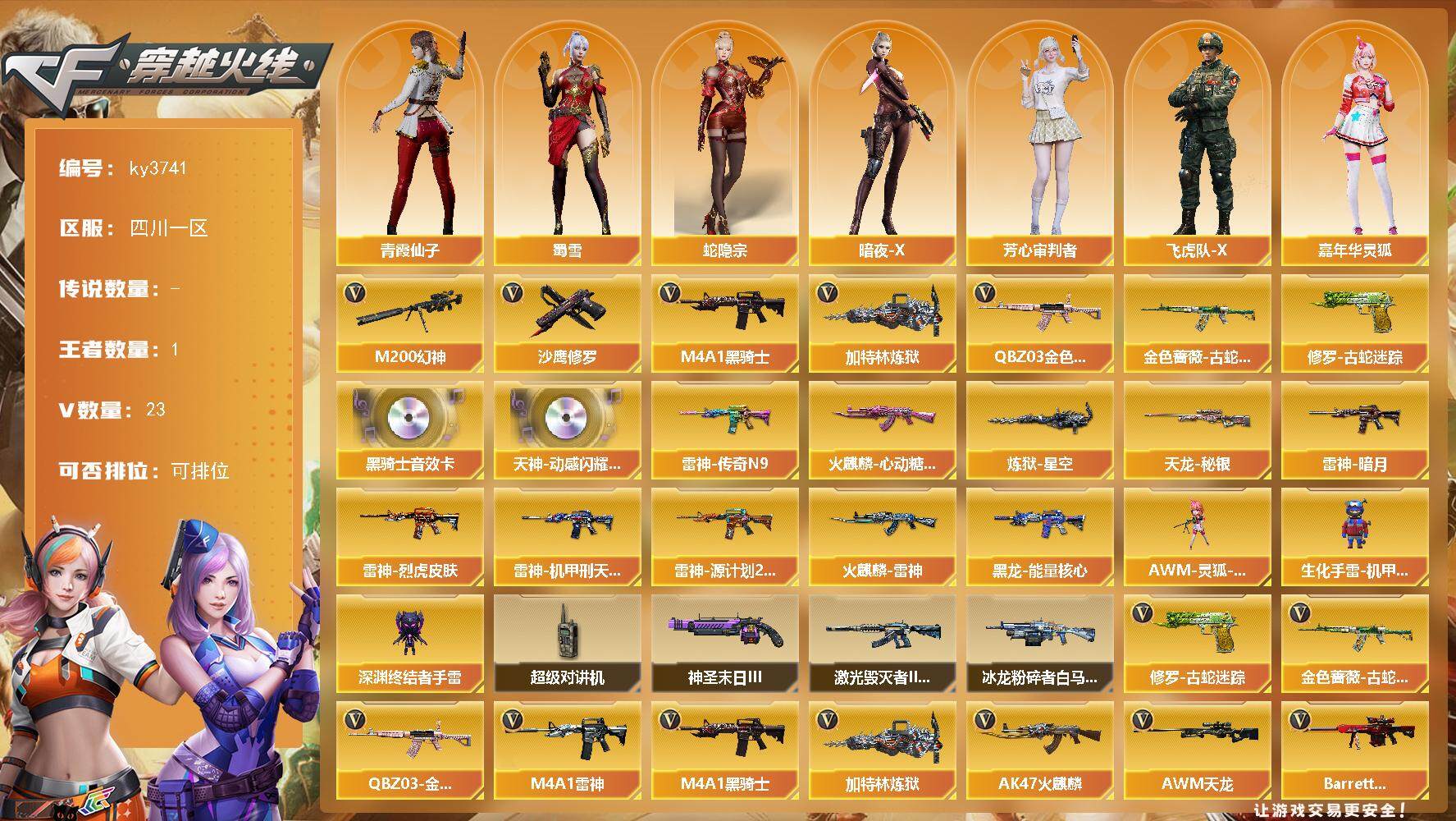 [14013625]四川一区-23V-1王者-0炫金 【热门武器】:QBZ03-金色蔷薇,M200-幻神,金色蔷薇-古蛇迷踪,修罗-古蛇迷踪,M4A1-黑骑士,加特林-炼狱,沙鹰-修罗 【音效卡】:天神-动感闪耀 音效卡,M4A1-黑骑士音效卡 【皮肤】:雷神-暗月,雷神-传奇N9,雷神-烈虎皮肤,雷神-机甲刑天皮肤,雷神-源计划2.0专属 皮肤,火麒麟-雷神,火麒麟-心动糖果,黑龙-能量核心,天龙-秘银,炼狱-星空 【角色】:蛇隐宗,暗夜-X,芳心审判者,飞虎队-X,嘉年华灵狐,娟娟,兰-新年限定,灵狐者-X,麻雀,曼陀罗-X,潘多拉-X,青霞仙子,蛇姬,斯沃特-X,蜀雪,兔囡囡,雪莉杨-摸金校尉,樱-战斗天使,游珑儿 【人偶武器】:AWM-灵狐-15周年嘉年华,生化手雷-机甲核心,深渊终结者手雷 【暴走生化】:超级对讲机 【挑战大师】:冰龙粉碎者-白马银枪,激光毁灭者III-白马银枪,神圣爆裂者-末日III 【英雄级武器】:AK47-火麒麟,M4A1-雷神*2,M4A1-黑骑士,无影-神兵利器,QBZ03-云龙,黑武士-锦绣游龙,金色蔷薇-古蛇迷踪,QBZ03-金色蔷薇,黑骑士-海王*2,AWM-天龙,Barrett-极光,M200-幻神,加特林-炼狱,沙鹰-修罗,沙鹰-天神,COP 357-雷霆王者-觉醒版,修罗-古蛇迷踪,屠龙*2,幻灵之锋,高爆手雷-幻灵,高爆手雷-古蛇迷踪,闪光弹-幻灵,烟雾弹-幻灵,烟雾弹-古蛇迷踪 【道具】:云山科技背包,全能枪王背包,古蛇迷踪炫彩背包,战舰背包,超级背包,绿色巨人,灵魂忍者,变异宝贝,迷雾幽灵,生化弹匣,夺命之镰,防化服*2,金色流光-枪王排位*2,星辰流光-枪王排位,枪王排位28赛季金色流光,枪王排位29赛季金色流光,古蛇迷踪打击特效,蛇隐宗表情,斯沃特表情,防弹头盔*3,防弹衣*4,C4工具钳*2,手雷包*2 【特殊枪械】:1黑骑士,1炼狱
