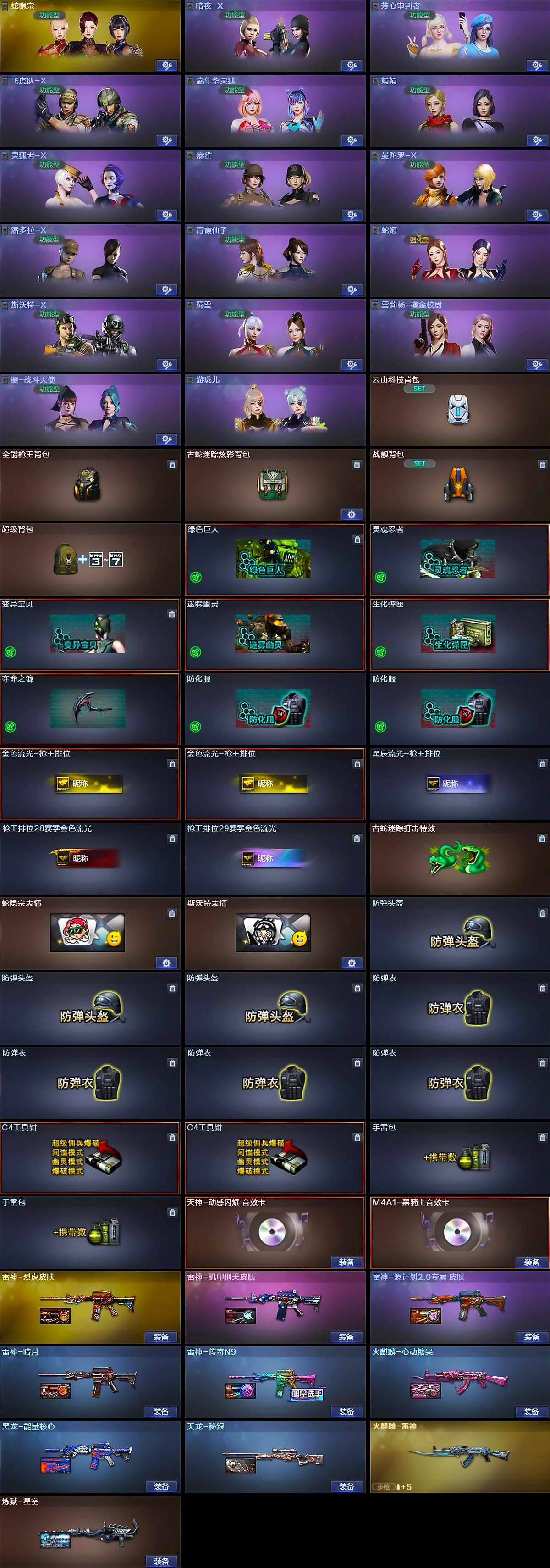 【道具】:云山科技背包,全能枪王背包,古蛇迷踪炫彩背包,战舰背包,超级背包,绿色巨人,灵魂忍者,变异宝贝,迷雾幽灵,生化弹匣,夺命之镰,防化服*2,金色流光-枪王排位*2,星辰流光-枪王排位,枪王排位28赛季金色流光,枪王排位29赛季金色流光,古蛇迷踪打击特效,蛇隐宗表情,斯沃特表情,防弹头盔*3,防弹衣*4,C4工具钳*2,手雷包*2