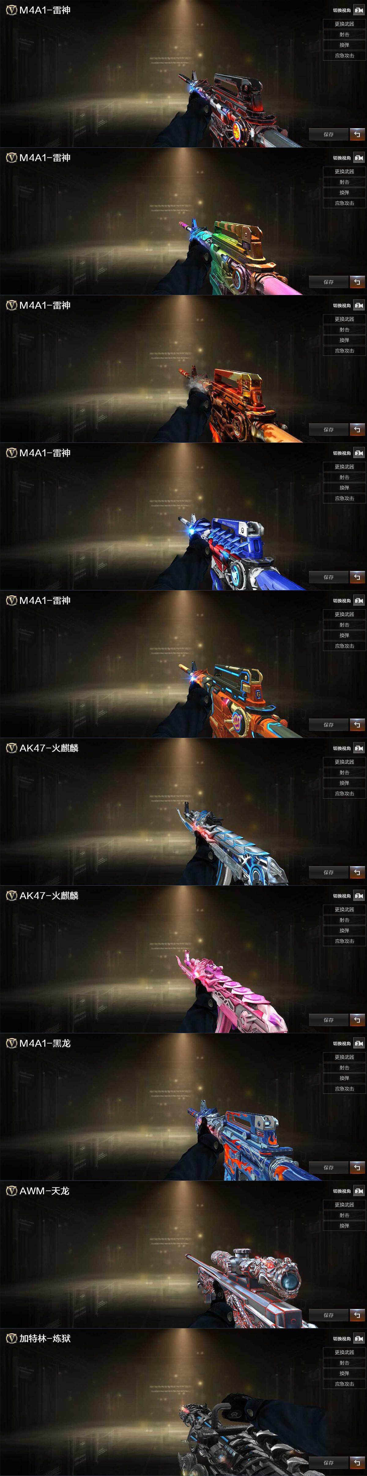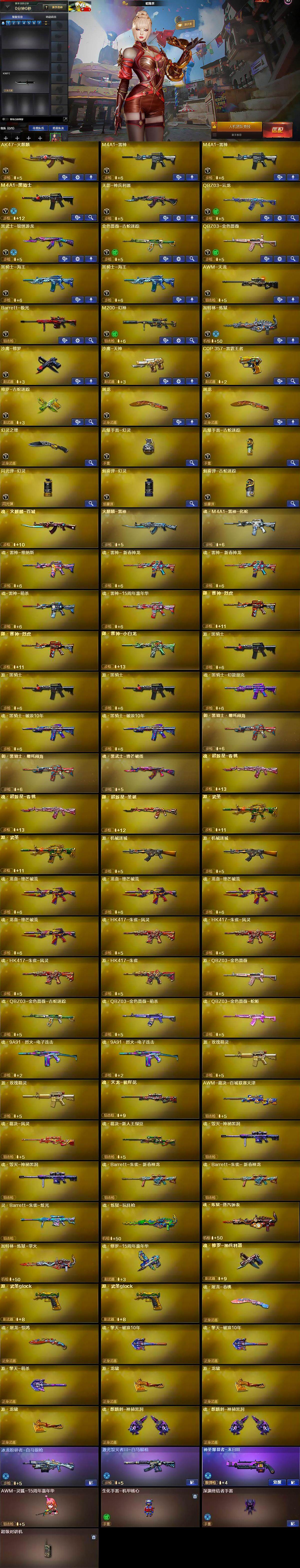 【英雄级武器】:AK47-火麒麟,M4A1-雷神*2,M4A1-黑骑士,无影-神兵利器,QBZ03-云龙,黑武士-锦绣游龙,金色蔷薇-古蛇迷踪,QBZ03-金色蔷薇,黑骑士-海王*2,AWM-天龙,Barrett-极光,M200-幻神,加特林-炼狱,沙鹰-修罗,沙鹰-天神,COP 357-雷霆王者-觉醒版,修罗-古蛇迷踪,屠龙*2,幻灵之锋,高爆手雷-幻灵,高爆手雷-古蛇迷踪,闪光弹-幻灵,烟雾弹-幻灵,烟雾弹-古蛇迷踪