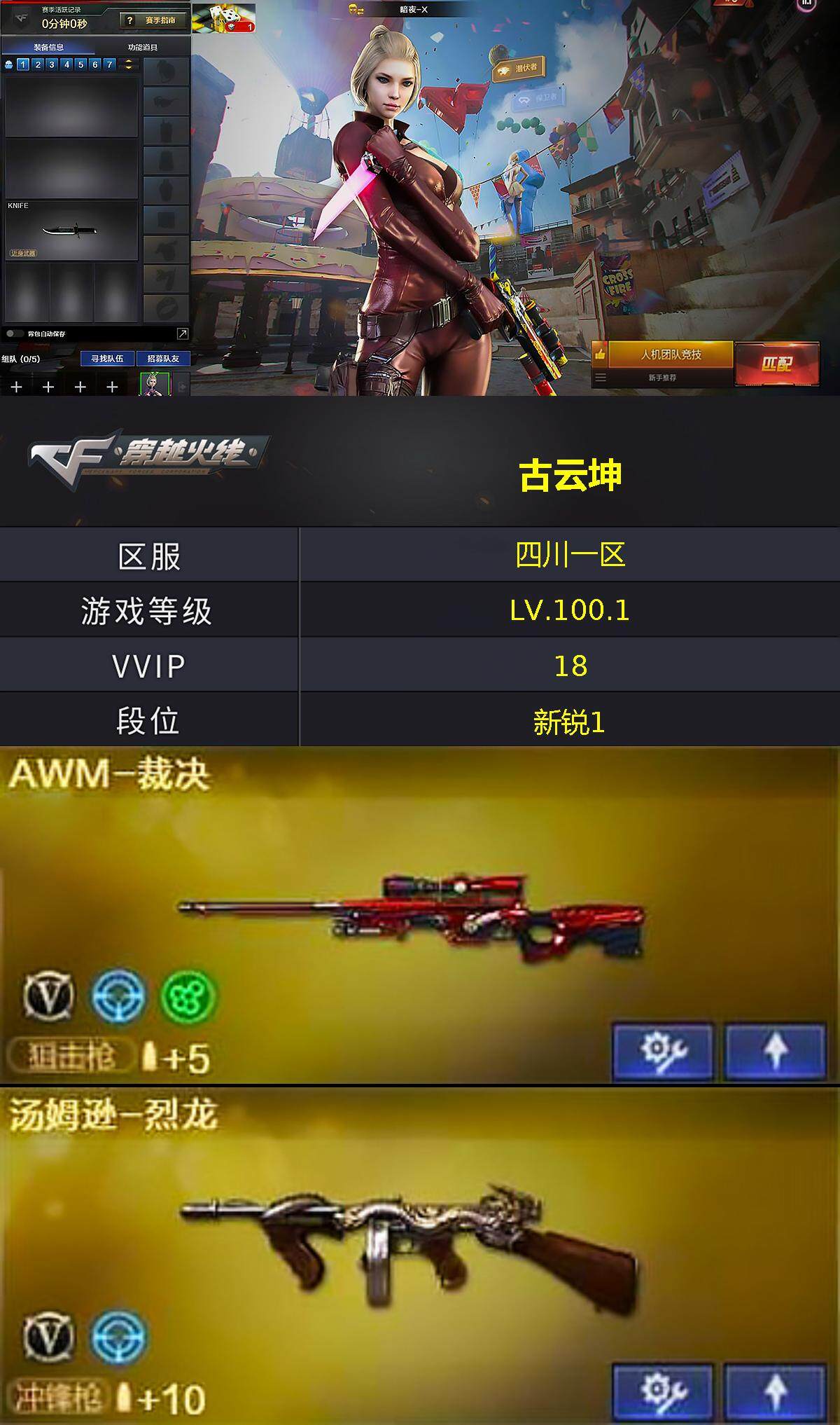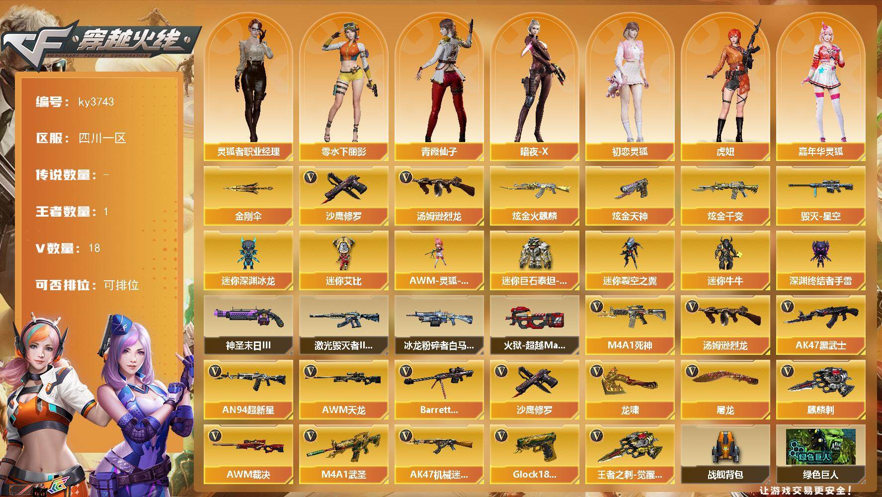 [14013840]四川一区-18V-1王者-3炫金 【热门武器】:汤姆逊-烈龙,沙鹰-修罗*2,金刚伞 【王者炫金武器】:炫金火麒麟,炫金千变,炫金天神 【皮肤】:毁灭-星空 【角色】:暗夜-X,初恋灵狐,虎妞,嘉年华灵狐,零-水下丽影,灵狐者-职业经理,麻雀,曼陀罗-X,潘多拉-X,潘多拉-甜心教官,青霞仙子,游珑儿 【人偶武器】:AWM-灵狐-15周年嘉年华,迷你深渊冰龙,迷你裂空之翼*2,迷你牛牛,深渊终结者手雷,迷你艾比,迷你巨石泰坦-魔花研究所 【挑战大师】:火狱乱世-超越Max,冰龙粉碎者-白马银枪,激光毁灭者III-白马银枪*2,神圣爆裂者-末日III 【英雄级武器】:M4A1-死神,AK47-黑武士,AN94-超新星,M4A1-武圣,AK47-机械迷城,AWM-天龙,Barrett-毁灭,AWM-裁决,汤姆逊-烈龙,沙鹰-修罗*2,Glock18-武圣,屠龙*2,龙啸,麒麟刺,王者之刺-觉醒版 【道具】:战舰背包,绿色巨人,灵魂忍者,迷雾幽灵,夺命之镰,防化服*3,金色流光-枪王排位*2,星辰流光-枪王排位,流光-鎏金之域,枪王排位29赛季金色流光,防弹头盔*3,防弹衣*3,C4工具钳*3,手雷包*3 【特殊枪械】:1烈龙