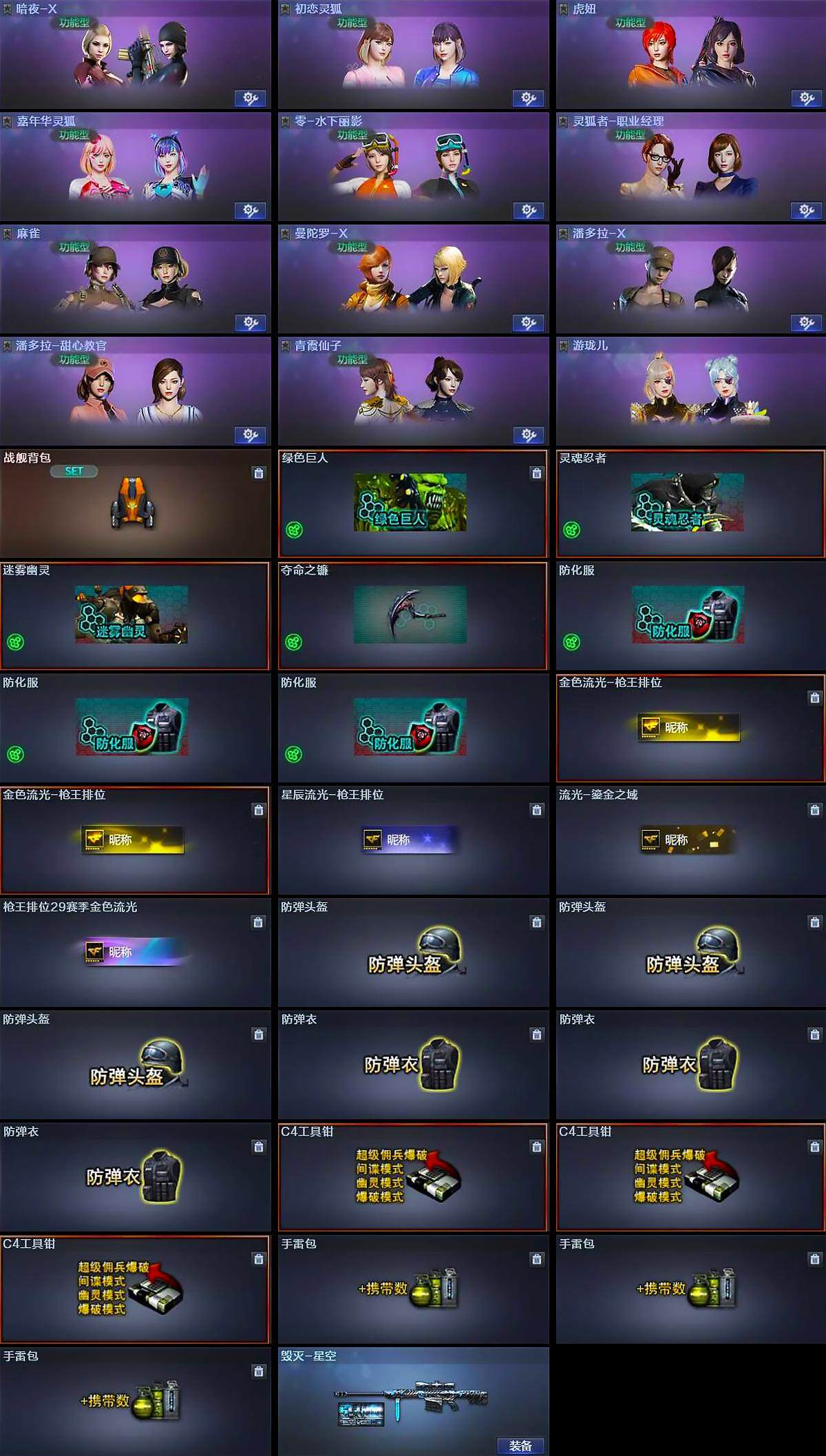 【道具】:战舰背包,绿色巨人,灵魂忍者,迷雾幽灵,夺命之镰,防化服*3,金色流光-枪王排位*2,星辰流光-枪王排位,流光-鎏金之域,枪王排位29赛季金色流光,防弹头盔*3,防弹衣*3,C4工具钳*3,手雷包*3