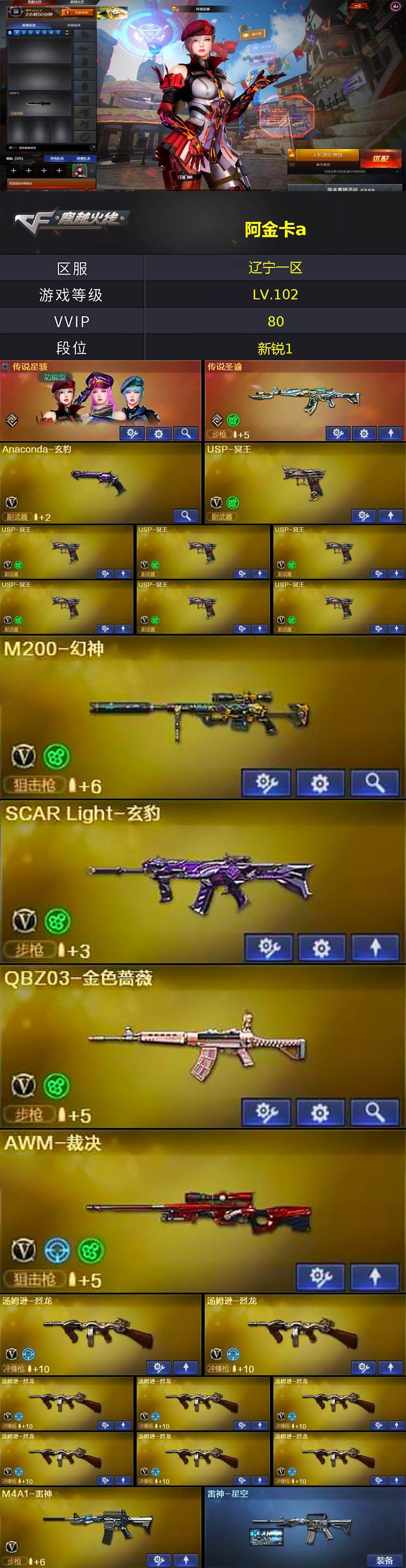 - [12957394]云南一区-25V-4王者-1炫金 【热门武器】:M200-幻神,金色蔷薇-古蛇迷踪,修罗-古蛇迷踪,M4A1-黑骑士,加特林-炼狱*2 【王者炫金武器】:炫金毁灭,炼狱-悦蓝 【音效卡】:M4A1-雷神音效卡 【稀有皮肤】:雷神-耀金皮肤,火麒麟-百城,AWM-天龙-传奇白鲨 【角色】:王者春,战地猎狐,蜀雪,炽天使 【人偶武器】:AWM-灵狐-15周年嘉年华,海滩汪汪-巴雷特,迷你牛魔王,生化手雷-机甲核心*3,闪光弹-小乔 【挑战大师】:KAC-圣炎切割者III,激光毁灭者III,冰龙粉碎者-白马银枪 【英雄级武器】:金色蔷薇-古蛇迷踪,M4A1-雷神,M4A1-黑骑士,加特林-炼狱*2,AK12-天启,QBZ03-天罚,M200-幻神,黑武士-锦绣游龙,黑骑士-海王,死神-雪域霜狐,AK-47-猩红传说,AK47-B-战神,AWM-昌龙,修罗-古蛇迷踪,沙鹰-天神,屠龙 【特殊枪械】:1黑骑士,2炼狱
