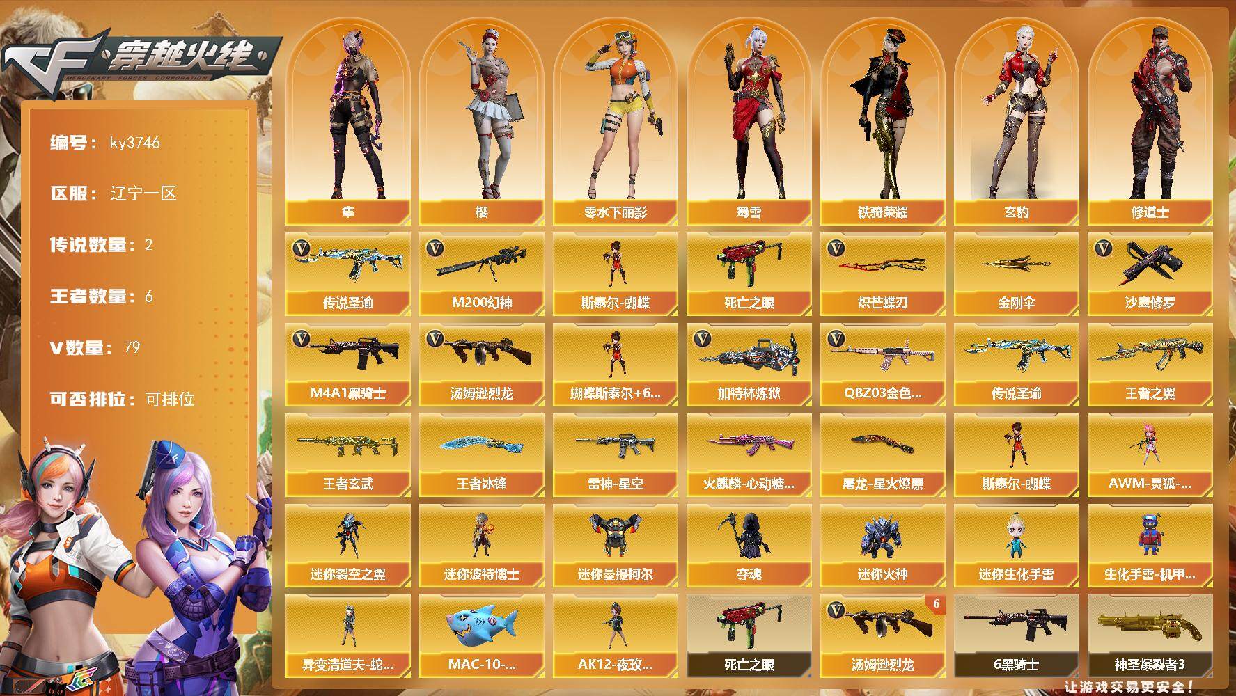 [14013819]辽宁一区-79V-6王者-0炫金 【传说武器】:传说圣谕 【传说角色】:传说星骇 【热门武器】:传说圣谕,QBZ03-金色蔷薇,M200-幻神,死亡之眼,M4A1-黑骑士*6,汤姆逊-烈龙*8,加特林-炼狱*4,斯泰尔-蝴蝶,沙鹰-修罗*5,炽芒蝶刃,金刚伞 【王者炫金武器】:王者之翼,王者玄武,王者冰锋 【皮肤】:雷神-星空,火麒麟-心动糖果,屠龙-星火燎原 【角色】:樱,隼,玄豹,修道士,嘉年华灵狐,零-水下丽影,龙儿-小淘气,斯沃特-X,蜀雪,铁骑荣耀 【人偶武器】:异变清道夫-蛇影双骄*2,斯泰尔-蝴蝶,MAC-10-千针棘鲨,AWM-灵狐-15周年嘉年华*2,迷你裂空之翼,迷你波特博士*5,迷你曼提柯尔,夺魂,迷你火种*9,迷你生化手雷*3,生化手雷-机甲核心,AK12-夜玫瑰 【暴走生化】:死亡之眼 【挑战大师】:暴君乱世-超越Max,神圣爆裂者III,AK47-冰龙粉碎者,冰龙粉碎者-白马银枪,VEPR-12-金魔,激光毁灭者III*2,机甲撕裂者III,试炼破坏者III,KAC-圣炎切割者III,神圣爆裂者-末日III,惩戒者III 【英雄级武器】:AK47-火麒麟*2,M4A1-黑龙*4,M4A1-雷神,M4A1-黑骑士*6,AK47-无影,AN94-超新星,无影-神兵利器,黑武士-锦绣游龙,FAMAS G2-天戎,SCAR Light-玄豹,M4A1-玫瑰精灵,QBZ03-金色蔷薇,王者之武-觉醒版,AK-47-猩红传说,王者猎神-觉醒版,Barrett-毁灭,Barrett-极光*3,AWM-裁决,M200-幻神,VSK-94-金蚀,加特林-炼狱*4,盘龙-悦心-觉醒版,汤姆逊-烈龙*8,AA-12-雷霆*2,沙鹰-修罗*5,Anaconda-玄豹,USP-冥王*7,擎天*3,麒麟刺,炽芒蝶刃,丛林匕首-玄豹*2,高爆手雷-玄豹*4,闪光弹-玄豹*3,烟雾弹-玄豹*2,M4A1-赤狱骑士 【道具】:BS战队炫彩背包,CFS限定背包,云山科技背包,冰冰企鹅背包-猛男专用,女皇终结者-背包,战舰背包,次元之矛-黄金背包,次元之矛-背包*4,炫彩背包,臻选金狐背包,金狐背包*2,黄金巨石泰坦-魔花研究所背包,圣拳猎手-炽雪,终极猎手-秦魂将军,女皇终结者-魔龙之吻,救世主-黑桃战神,绿色巨人,灵魂忍者,变异宝贝,迷雾幽灵,夺命之镰,防化服*3,金色