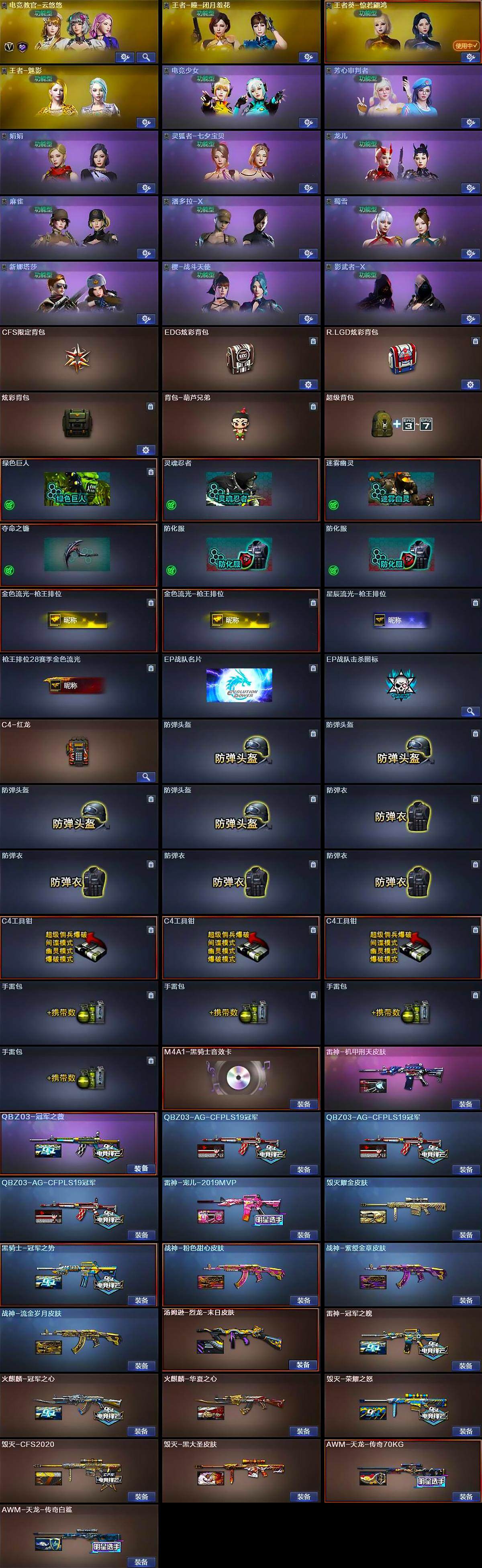 【皮肤】:QBZ03-冠军之薇,QBZ03-AG-CFPLS19冠军*3,汤姆逊-烈龙-末日皮肤,雷神-冠军之魄,雷神-宠儿-2019MVP,雷神-机甲刑天皮肤,火麒麟-冠军之心,火麒麟-华夏之心,毁灭-荣耀之怒,毁灭耀金皮肤,毁灭-CFS2020,毁灭-黑大圣皮肤,黑骑士-冠军之势,战神-粉色甜心皮肤,战神-紫绶金章皮肤,战神-流金岁月皮肤,AK47-B-常胜将军-曹操,AK47-B-常胜将军-刘备*2,AK47-B-常胜将军-孙权,AWM-天龙-传奇70KG,AWM-天龙-传奇白鲨