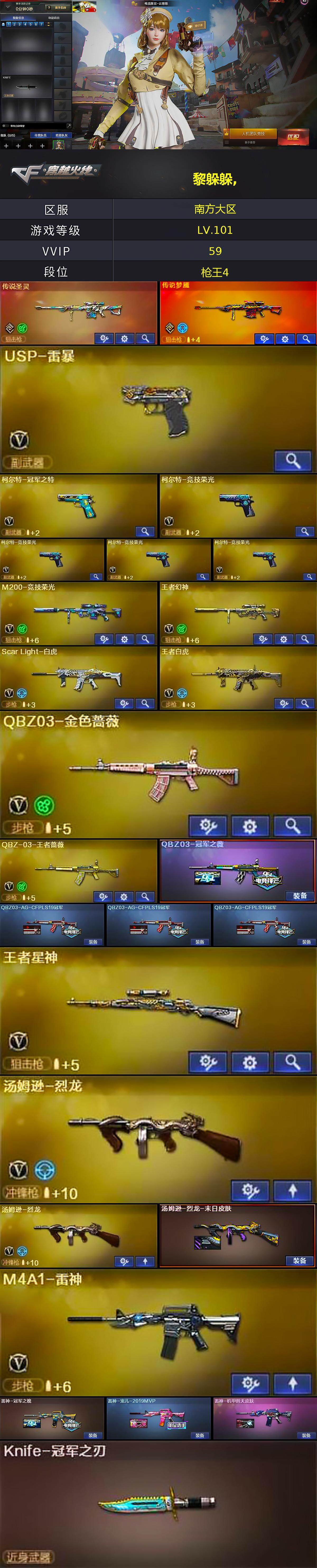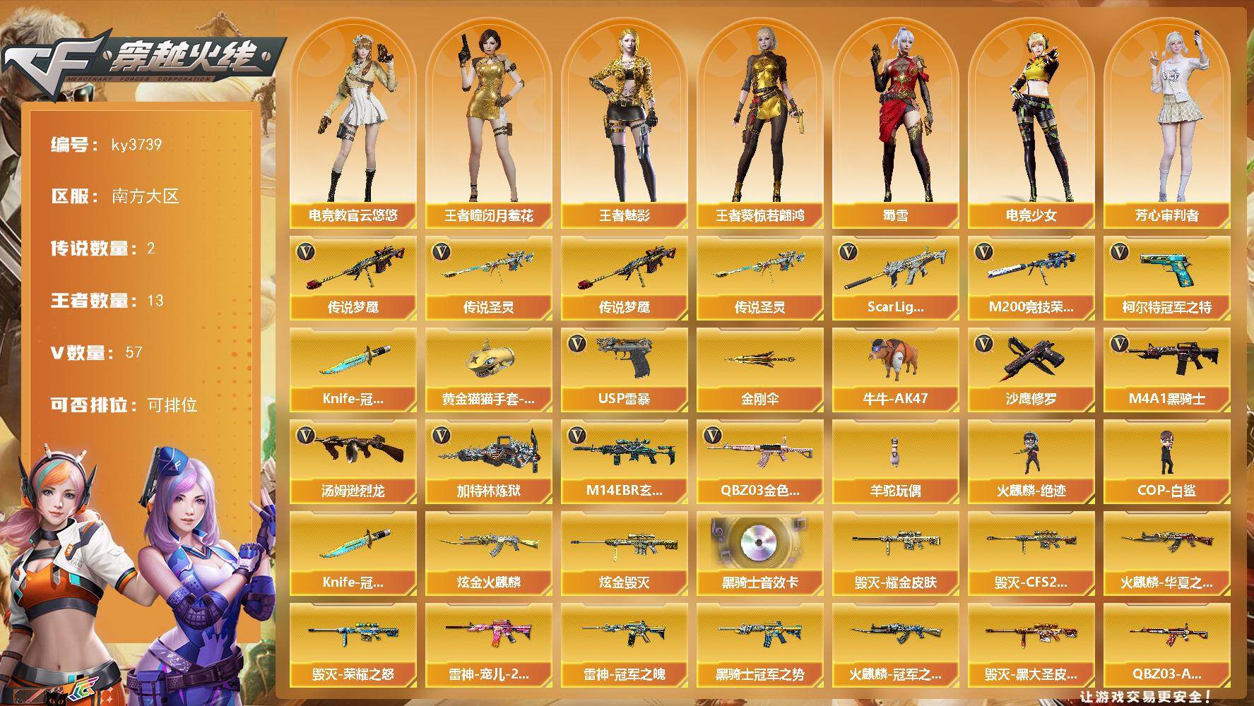 [14014318]南方大区-57V-13王者-2炫金 【传说武器】:传说圣灵,传说梦魇 【热门武器】:传说梦魇,传说圣灵,QBZ03-金色蔷薇,M14EBR-玄武,Scar Light-白虎,M200-竞技荣光,柯尔特-冠军之特,牛牛-AK47,M4A1-黑骑士*2,汤姆逊-烈龙*2,加特林-炼狱*2,羊驼玩偶,火麒麟-绝迹,COP-白鲨,USP-雷暴,沙鹰-修罗,Knife-冠军之刃*2,黄金猫猫手套-白鲨,金刚伞 【王者炫金武器】:炫金火麒麟,炫金毁灭 【音效卡】:M4A1-黑骑士音效卡 【皮肤】:QBZ03-冠军之薇,QBZ03-AG-CFPLS19冠军*3,汤姆逊-烈龙-末日皮肤,雷神-冠军之魄,雷神-宠儿-2019MVP,雷神-机甲刑天皮肤,火麒麟-冠军之心,火麒麟-华夏之心,毁灭-荣耀之怒,毁灭耀金皮肤,毁灭-CFS2020,毁灭-黑大圣皮肤,黑骑士-冠军之势,战神-粉色甜心皮肤,战神-紫绶金章皮肤,战神-流金岁月皮肤,AK47-B-常胜将军-曹操,AK47-B-常胜将军-刘备*2,AK47-B-常胜将军-孙权,AWM-天龙-传奇70KG,AWM-天龙-传奇白鲨 【角色】:电竞教官-云悠悠,王者-瞳-闭月羞花,王者葵-惊若翩鸿,王者-魅影,电竞少女,芳心审判者,娟娟,0号玩家,灵狐者-七夕宝贝,龙儿,麻雀,潘多拉-X,邱刚敖,蜀雪,新娜塔莎,樱-战斗天使,影武者-X 【人偶武器】:火麒麟-绝迹,COP-白鲨,牛牛-AK47,迷你深渊冰龙*2,迷你裂空之翼*2,迷你牛牛,生化手雷-机甲核心,深渊终结者手雷,闪光弹-貂蝉,高爆手雷-大乔,迷你艾比,迷你巨石泰坦-魔花研究所,灵狐娃娃手雷 【挑战大师】:火狱乱世-超越Max,神圣爆裂者III,AK47-冰龙粉碎者,冰龙粉碎者-白马银枪,VEPR-12-金魔,激光毁灭者III*5,机甲撕裂者III,神圣爆裂者-末日III*2,阐释者III 【英雄级武器】:AK47-火麒麟,M4A1-黑龙,M4A1-雷神,M4A1-黑骑士*2,AK12-天启,AN94-超新星,Scar Light-白虎,M14EBR-玄武,无影-神兵利器,M4A1-玫瑰精灵,QBZ03-金色蔷薇,AK-47-猩红传说,黑骑士-海王*2,AK47-B-常胜将军,王者之烈-觉醒版,王者白虎-觉醒版,QBZ-03-王者蔷薇-觉醒版,Barrett-毁灭,Barrett