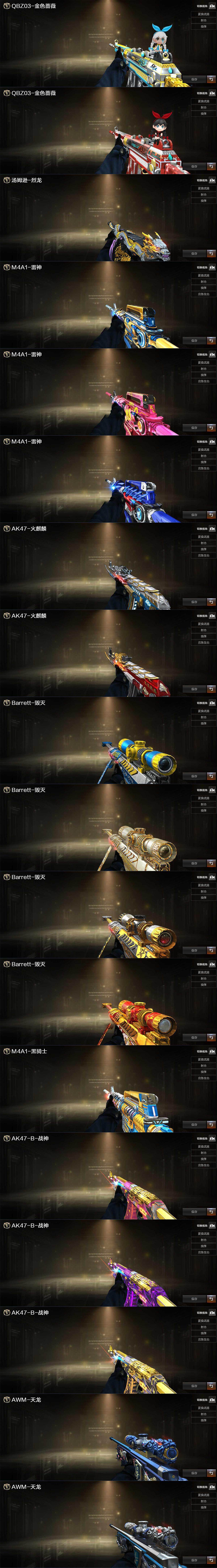 【英雄级武器】:AK47-火麒麟,M4A1-黑龙,M4A1-雷神,M4A1-黑骑士*2,AK12-天启,AN94-超新星,Scar Light-白虎,M14EBR-玄武,无影-神兵利器,M4A1-玫瑰精灵,QBZ03-金色蔷薇,AK-47-猩红传说,黑骑士-海王*2,AK47-B-常胜将军,王者之烈-觉醒版,王者白虎-觉醒版,QBZ-03-王者蔷薇-觉醒版,Barrett-毁灭,Barrett