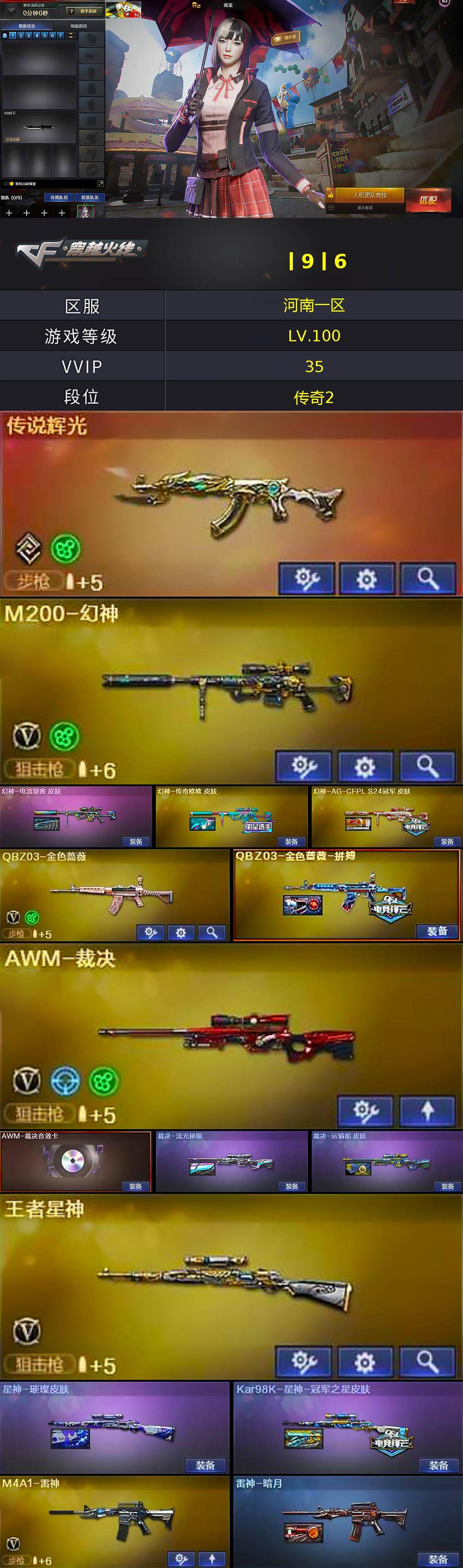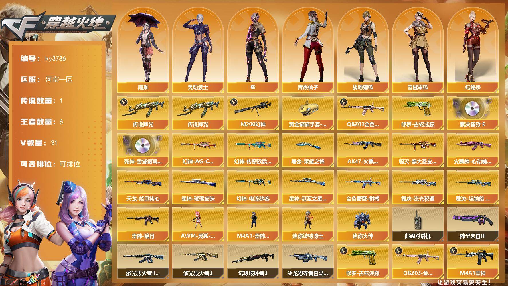 [14014620]河南一区-31V-8王者-0炫金 【传说武器】:传说辉光 【热门武器】:传说辉光,QBZ03-金色蔷薇,M200-幻神,修罗-古蛇迷踪,黄金猫猫手套-白鲨 【音效卡】:AWM-裁决音效卡,死神-雪域霜狐-怀旧音效卡 【皮肤】:幻神-电流骇客 皮肤,幻神-传奇欧欧 皮肤,幻神-AG-CFPL S24冠军 皮肤,QBZ03-金色蔷薇-拼搏,裁决-流光秘银,裁决-运输船 皮肤,星神-璀璨皮肤,Kar98K-星神-冠军之星皮肤,雷神-暗月,AK47-火麒麟-传奇EVEN,火麒麟-心动糖果,毁灭-黑大圣皮肤,天龙-能量核心,屠龙-荣耀之锋 【角色】:雨棠,隼,战地猎狐,雪域霜狐,蛇隐宗,暗夜-X,芳心审判者,风暴女,嘉年华灵狐,灵动武士,灵狐-花神,灵狐者-X,青霞仙子,蛇姬,斯沃特-X,兔囡囡,雪莉杨-摸金校尉,樱-战斗天使 【人偶武器】:M4A1-雷神-精英刀锋,AWM-灵狐-15周年嘉年华,迷你波特博士*2,迷你火种 【暴走生化】:超级对讲机 【挑战大师】:冰龙粉碎者-白马银枪*2,激光毁灭者III-白马银枪,激光毁灭者III,试炼破坏者III,神圣爆裂者-末日III 【英雄级武器】:AK47-火麒麟,M4A1-雷神,M4A1-龙血,无影-神兵利器,死神-雪域霜狐,QBZ03-金色蔷薇,AK-47-猩红传说,Barrett-毁灭,AWM-裁决,M200-幻神,王者星神-觉醒版,修罗-古蛇迷踪,马来剑-夜魔,麒麟刺,幻灵之锋,高爆手雷-夜魔*2,高爆手雷-幻灵*5,高爆手雷-古蛇迷踪,闪光弹-夜魔,闪光弹-幻灵*3,闪光弹-雷霆王者-觉醒版*2,烟雾弹-夜魔,烟雾弹-幻灵*3,烟雾弹-古蛇迷踪,烟雾弹-雷霆王者-觉醒版*2,M4A1-赤狱骑士 【道具】:CFS限定背包,古蛇迷踪炫彩背包,炫彩背包,超级背包,雪域霜狐炫彩背包,黄金曼提柯尔的背包,女皇终结者-魔龙之吻,救世主-黑桃战神,绿色巨人,灵魂忍者,迷雾幽灵,生化弹匣,夺命之镰,防化服*2,金色流光-枪王排位*2,星辰流光-枪王排位,巅峰赛先锋-金色流光,枪王排位28赛季金色流光,枪王排位29赛季金色流光,语音特效-怀旧,古蛇迷踪打击特效,雪域霜狐表情,防弹头盔*2,防弹衣*2,C4工具钳*2,手雷包*2 【特殊枪械】: