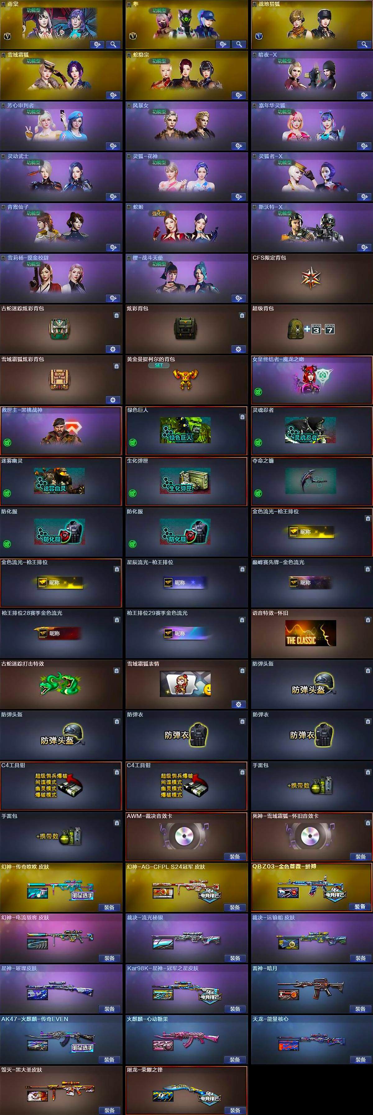 【道具】:CFS限定背包,古蛇迷踪炫彩背包,炫彩背包,超级背包,雪域霜狐炫彩背包,黄金曼提柯尔的背包,女皇终结者-魔龙之吻,救世主-黑桃战神,绿色巨人,灵魂忍者,迷雾幽灵,生化弹匣,夺命之镰,防化服*2,金色流光-枪王排位*2,星辰流光-枪王排位,巅峰赛先锋-金色流光,枪王排位28赛季金色流光,枪王排位29赛季金色流光,语音特效-怀旧,古蛇迷踪打击特效,雪域霜狐表情,防弹头盔*2,防弹衣*2,C4工具钳*2,手雷包*2