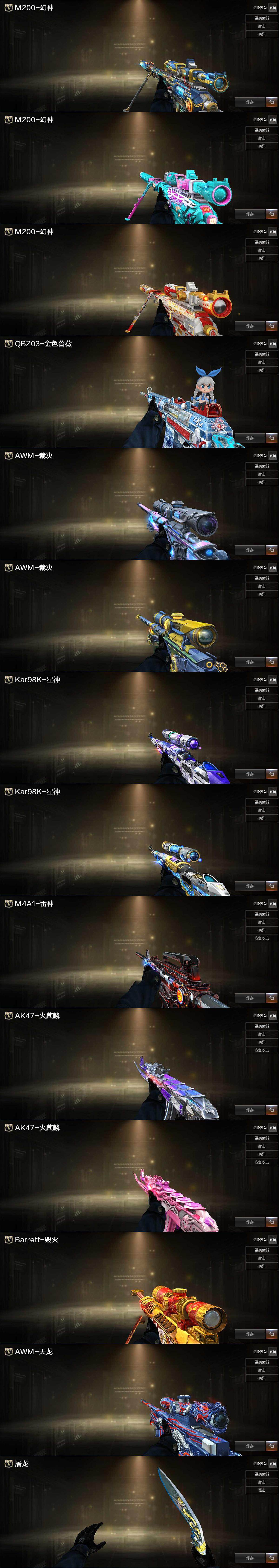 【皮肤】:幻神-电流骇客 皮肤,幻神-传奇欧欧 皮肤,幻神-AG-CFPL S24冠军 皮肤,QBZ03-金色蔷薇-拼搏,裁决-流光秘银,裁决-运输船 皮肤,星神-璀璨皮肤,Kar98K-星神-冠军之星皮肤,雷神-暗月,AK47-火麒麟-传奇EVEN,火麒麟-心动糖果,毁灭-黑大圣皮肤,天龙-能量核心,屠龙-荣耀之锋