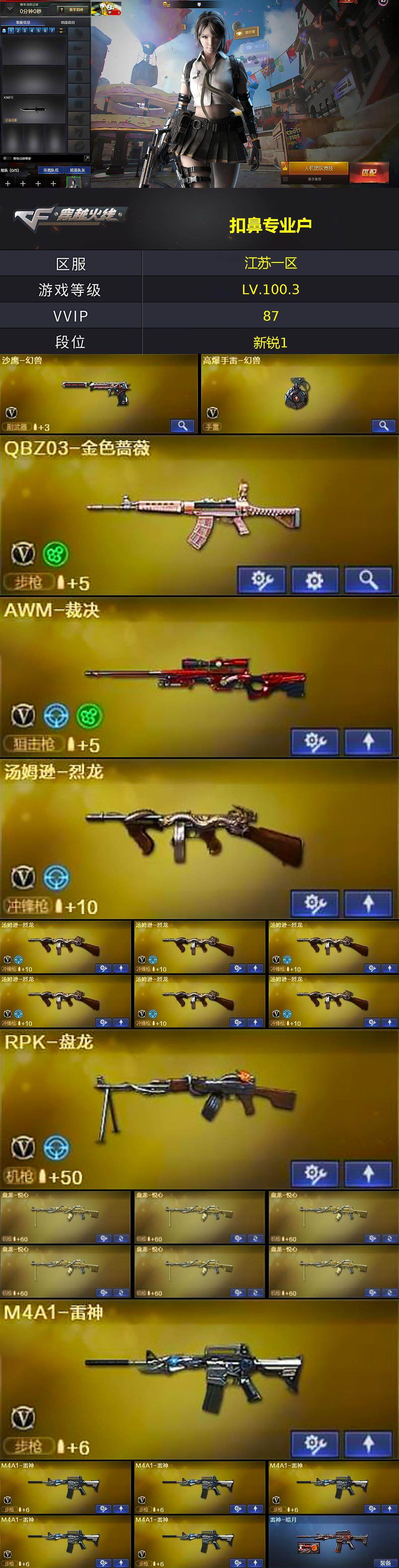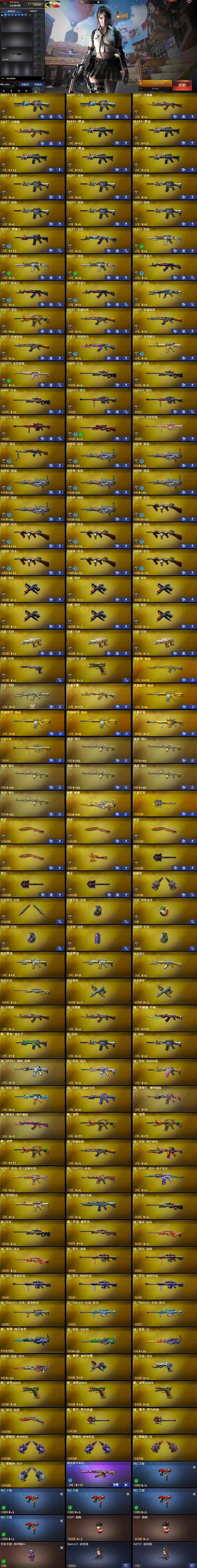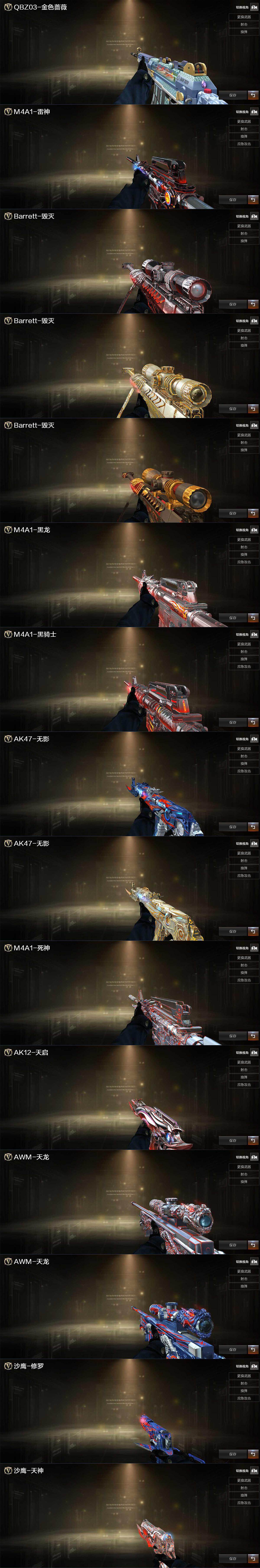 【英雄级武器】:M4A1-千变*2,AK47-火麒麟*2,M4A1-黑龙*5,M4A1-雷神*6,M4A1-黑骑士,AK47-无影,M4A1-死神*3,AK47-黑武士*3,AK12-天启,M4A1-武圣,AK47-机械迷城*3,黑武士-锦绣游龙,M4A1-玫瑰精灵,QBZ03-金色蔷薇,AWM-天龙*3,Barrett-毁灭*2,Barrett-极光,AWM-裁决,Barrett-金色蔷薇,RPK-盘龙,加特林-炼狱*7,汤姆逊-烈龙*7,沙鹰-修罗*6,沙鹰-天神*3,沙鹰-幻兽,Glock18-武圣,屠龙*4,龙啸,擎天*3,麒麟刺,女皇利刃-幻兽,高爆手雷-幻兽,手雷-热带奇洋,闪光弹-幻兽,闪光弹-玄豹,烟雾弹-幻兽