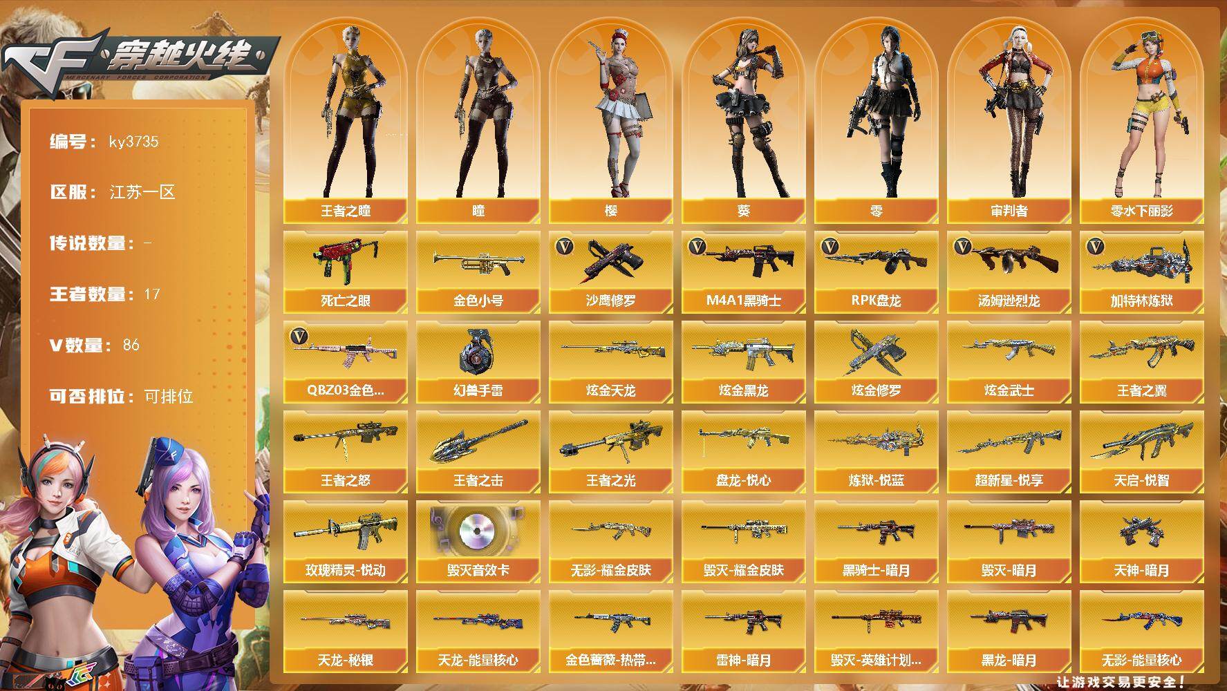 [14014687]江苏一区-86V-17王者-6炫金 【热门武器】:QBZ03-金色蔷薇,死亡之眼*5,金色小号,M4A1-黑骑士,汤姆逊-烈龙*7,RPK-盘龙,加特林-炼狱*7,沙鹰-修罗*6,高爆手雷-幻兽 【王者炫金武器】:超新星-悦享,天启-悦智,王者之翼,玫瑰精灵-悦动*3,王者之光,王者之怒,盘龙-悦心*6,炼狱-悦蓝,王者之击,炫金黑龙*2,炫金武士,炫金天龙,炫金修罗*2 【音效卡】:Barrett-毁灭音效卡 【皮肤】:金色蔷薇-热带奇洋 皮肤,雷神-暗月,毁灭-暗月,毁灭耀金皮肤,毁灭-英雄计划 皮肤,黑龙-暗月*2,黑骑士-暗月,无影-能量核心*2,无影耀金皮肤,死神-秘银*2,天启-暗月,天龙-秘银,天龙-能量核心,修罗-能量核心*3,天神-暗月*2 【角色】:零,葵,樱,瞳,玄豹,审判者,王者之瞳,奇洋探员,乔伊教练,电竞少女,风暴女,兰-海滩派对,零-水下丽影,潘多拉-甜心教官,青霞仙子,兔囡囡,五号兵器-赛博朋克 【人偶武器】:COP-旗袍*2,生化手雷-机甲核心,Barrett-夜玫瑰,AK12-夜玫瑰 【暴走生化】:死亡之眼*5 【挑战大师】:激光毁灭者III 【英雄级武器】:M4A1-千变*2,AK47-火麒麟*2,M4A1-黑龙*5,M4A1-雷神*6,M4A1-黑骑士,AK47-无影,M4A1-死神*3,AK47-黑武士*3,AK12-天启,M4A1-武圣,AK47-机械迷城*3,黑武士-锦绣游龙,M4A1-玫瑰精灵,QBZ03-金色蔷薇,AWM-天龙*3,Barrett-毁灭*2,Barrett-极光,AWM-裁决,Barrett-金色蔷薇,RPK-盘龙,加特林-炼狱*7,汤姆逊-烈龙*7,沙鹰-修罗*6,沙鹰-天神*3,沙鹰-幻兽,Glock18-武圣,屠龙*4,龙啸,擎天*3,麒麟刺,女皇利刃-幻兽,高爆手雷-幻兽,手雷-热带奇洋,闪光弹-幻兽,闪光弹-玄豹,烟雾弹-幻兽 【道具】:奇洋探员-海龟背包,战舰背包,炫彩背包,超级背包*2,女皇终结者-魔龙之吻,黄金生化钩,绿色巨人,灵魂忍者*2,变异宝贝,迷雾幽灵*2,夺命之镰,防化服*3,星辰流光-枪王排位,枪王排位28赛季金色流光,热带奇洋打击特效,C4-红龙,防弹头盔*3,防弹衣*3,C4工具钳*3,手雷包*3 【特殊枪械】:1黑骑士,6烈龙,1盘龙,6炼狱